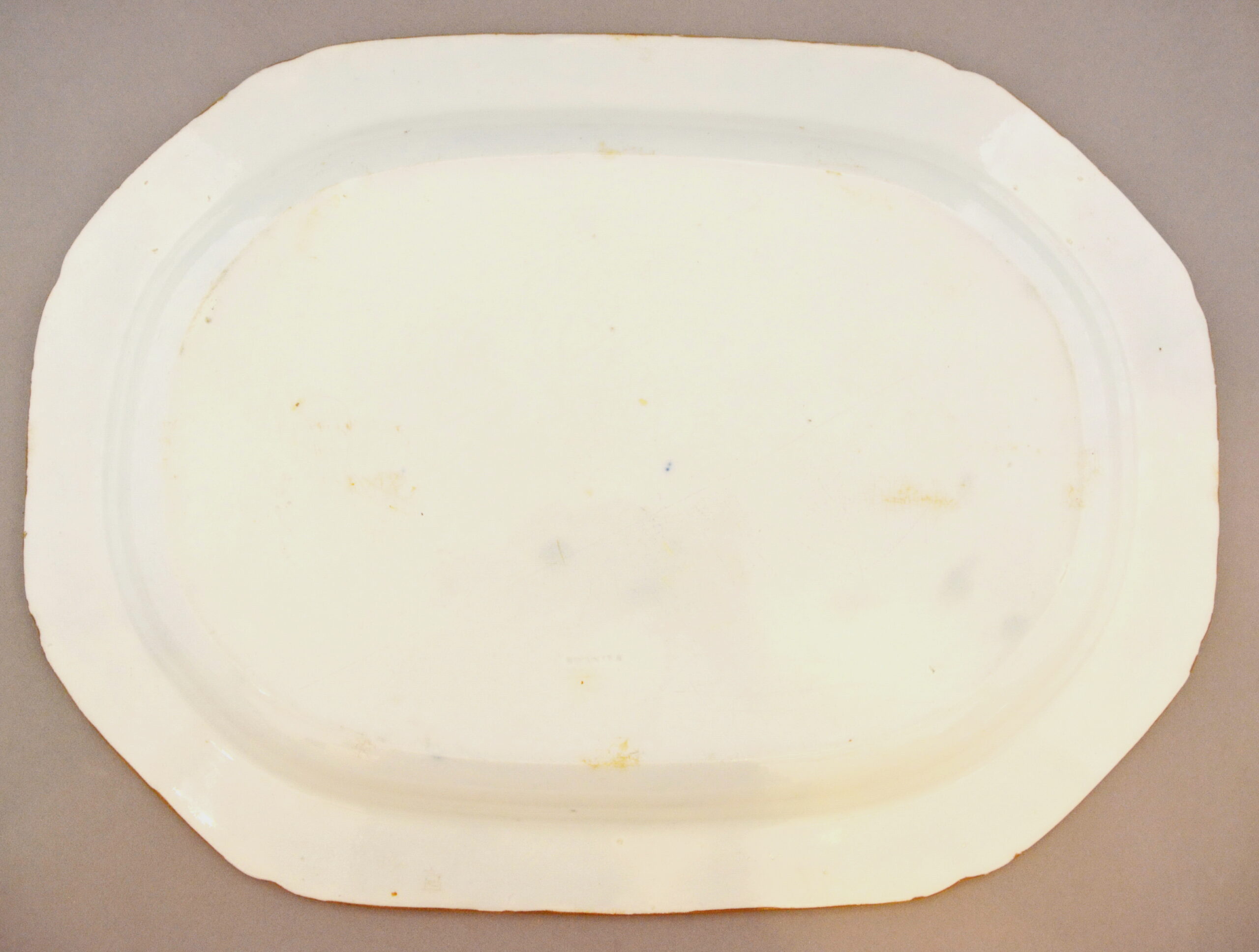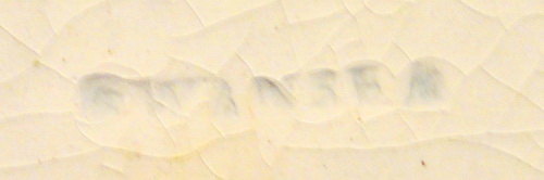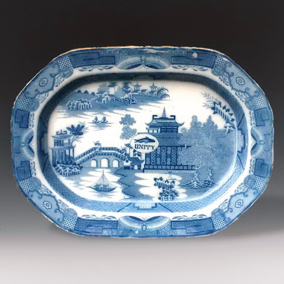 This earthenware platter is printed with the Unity logo over the Long Bridge pattern with butterfly border produced at Swansea. The rim was enameled with ocher. Examples with the Unity logo are considered very rare. The Unity pattern service was commissioned by the “Unity” Pilchard Cellar at Newquay. Jonathan Gray in Welsh Ceramics in Context Part I, pp. 59-60, provides a a short history of “Unity” as one of nine pilchard cellars in Swansea by the end of the 19th century. The oval cartouche showing a pilchard above the word “Unity” was used on two different patterns. This one and the Chinoiserie Palm pattern were used with the Unity logo for that company. The pilchards were caught in large schools by nets and carried onto the shore where they were salted and stacked up in the nearby cellars. The fish oil ran into gulleys and was purchased by the Navy. The fish were then pressed and sealed into barrels for distribution. This was a booming business. The dinnerware with “Unity” logo may have been used for the annual investor’s dinner.