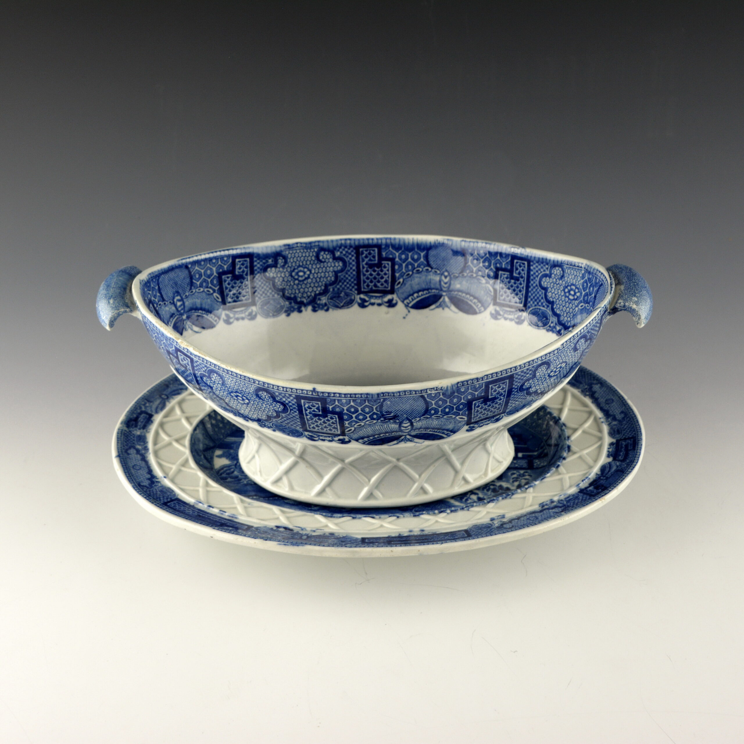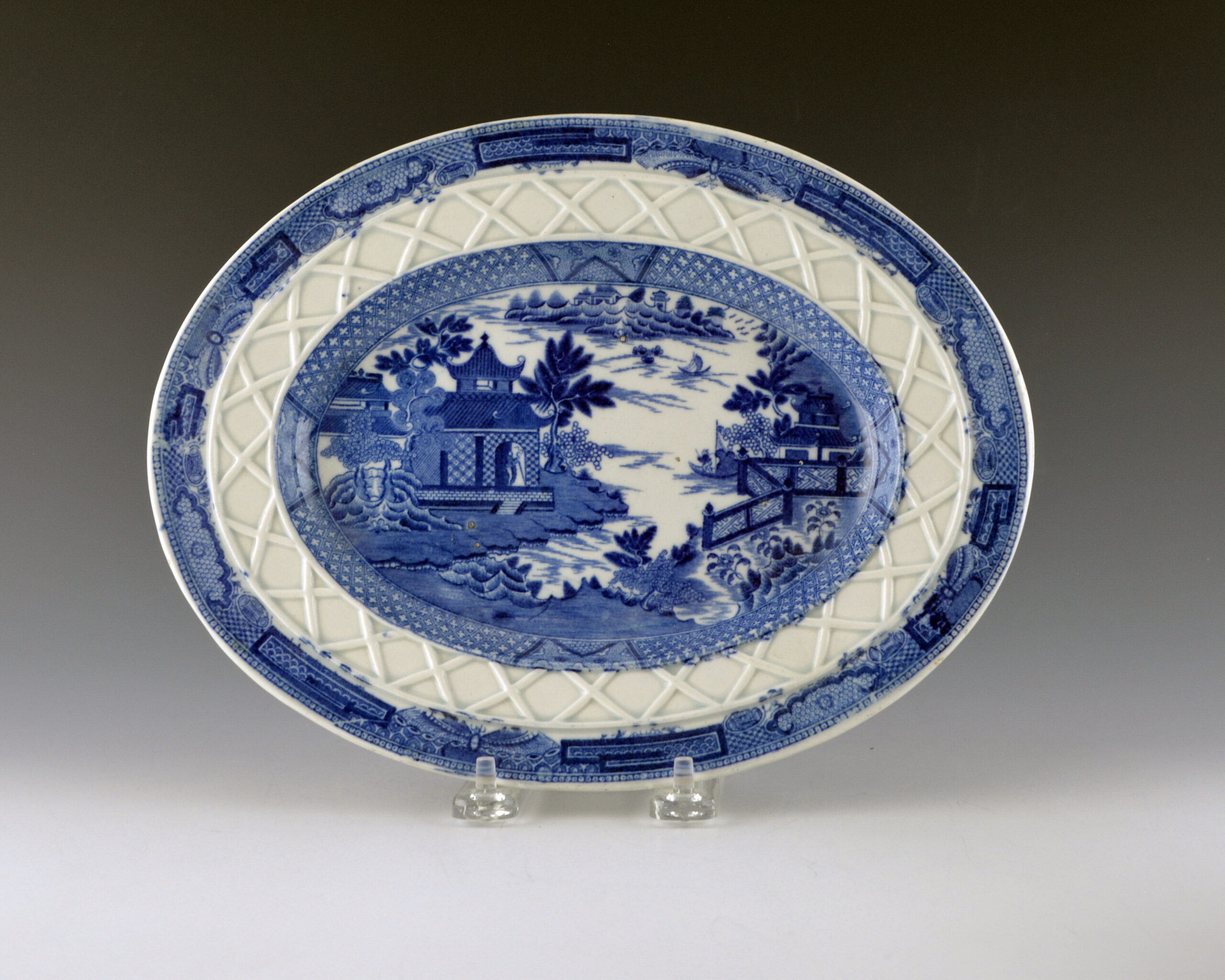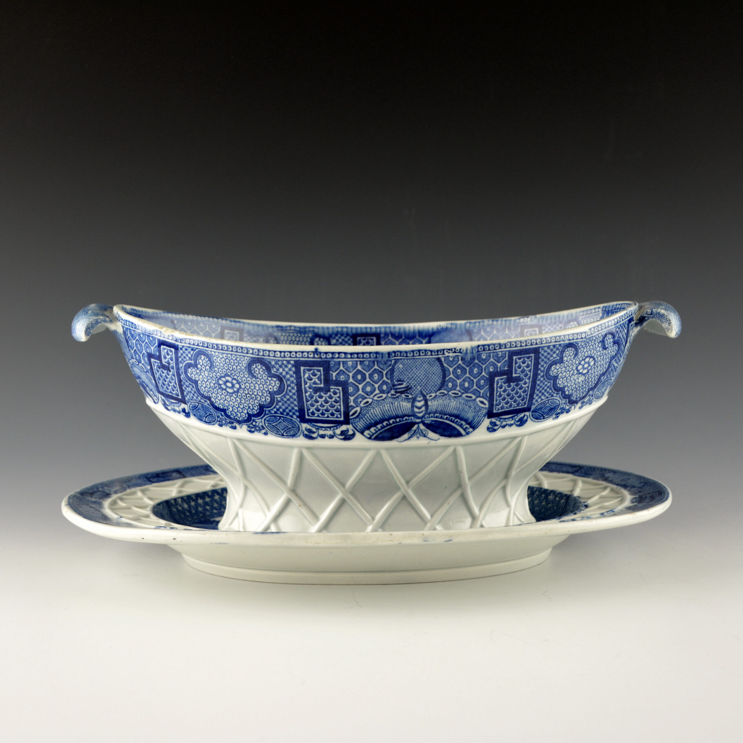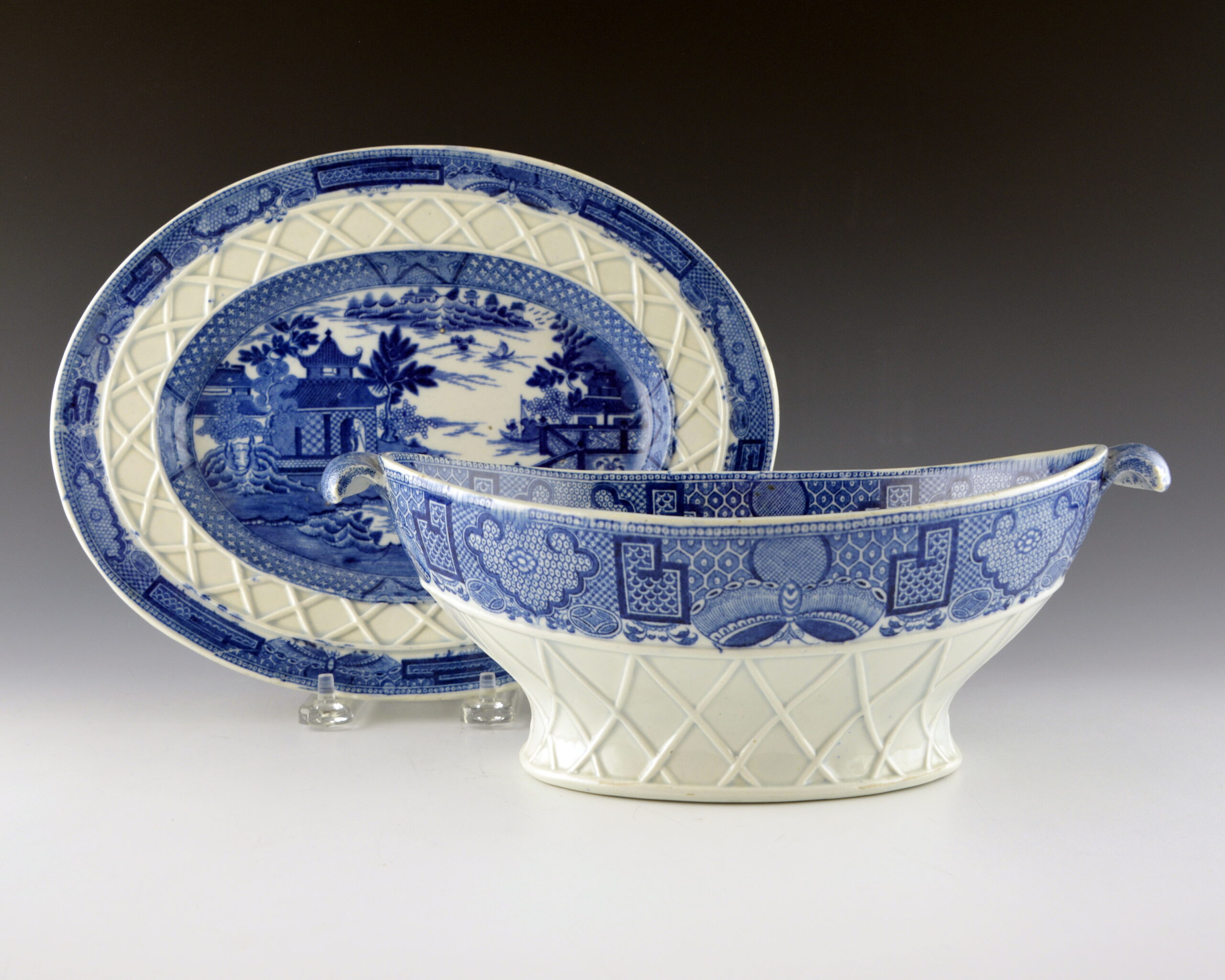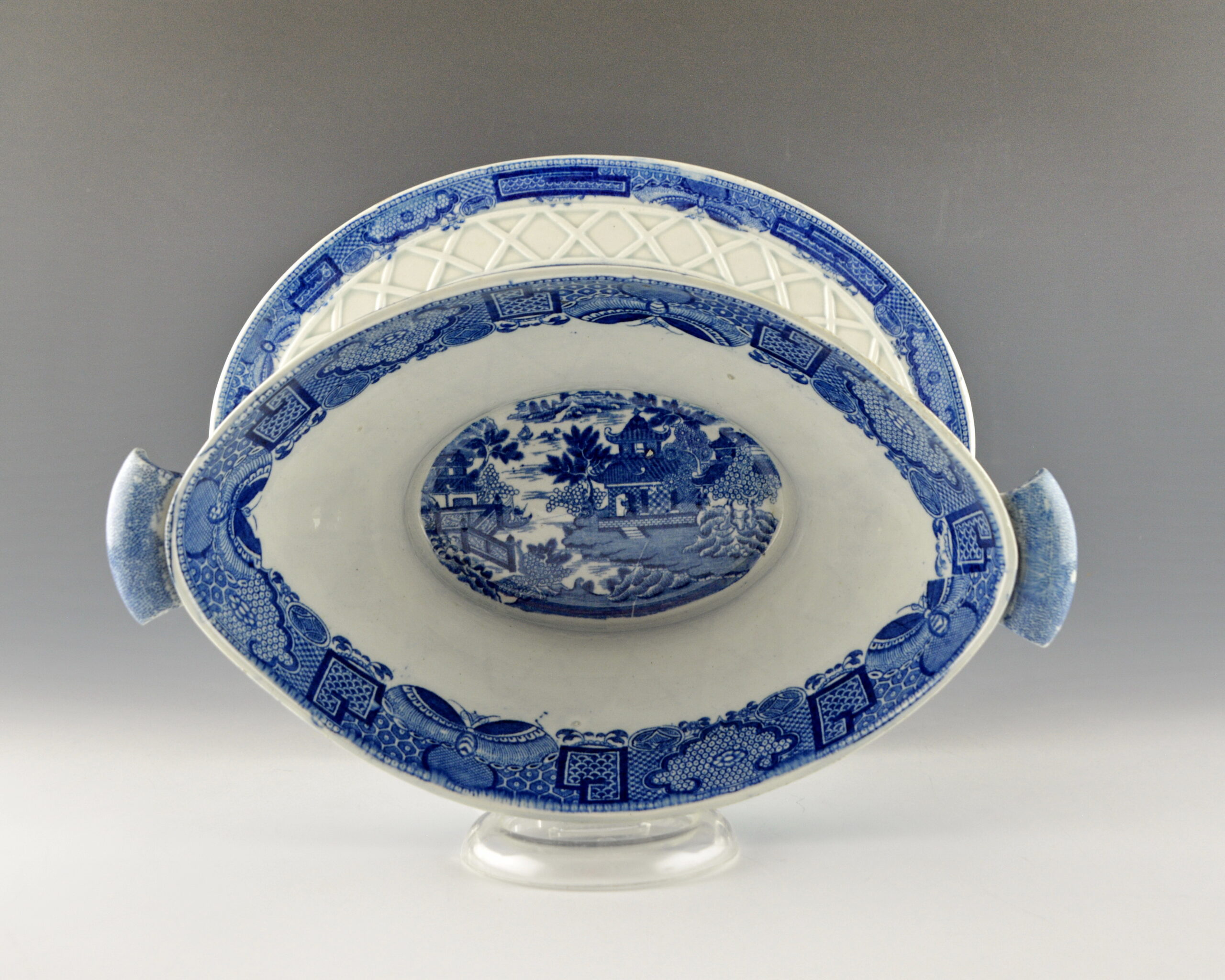 An early earthenware molded basket and stand printed in blue underglaze in the Bridgeless Chinoiserie pattern. The molded pattern was designed to immitate a pierced piece.