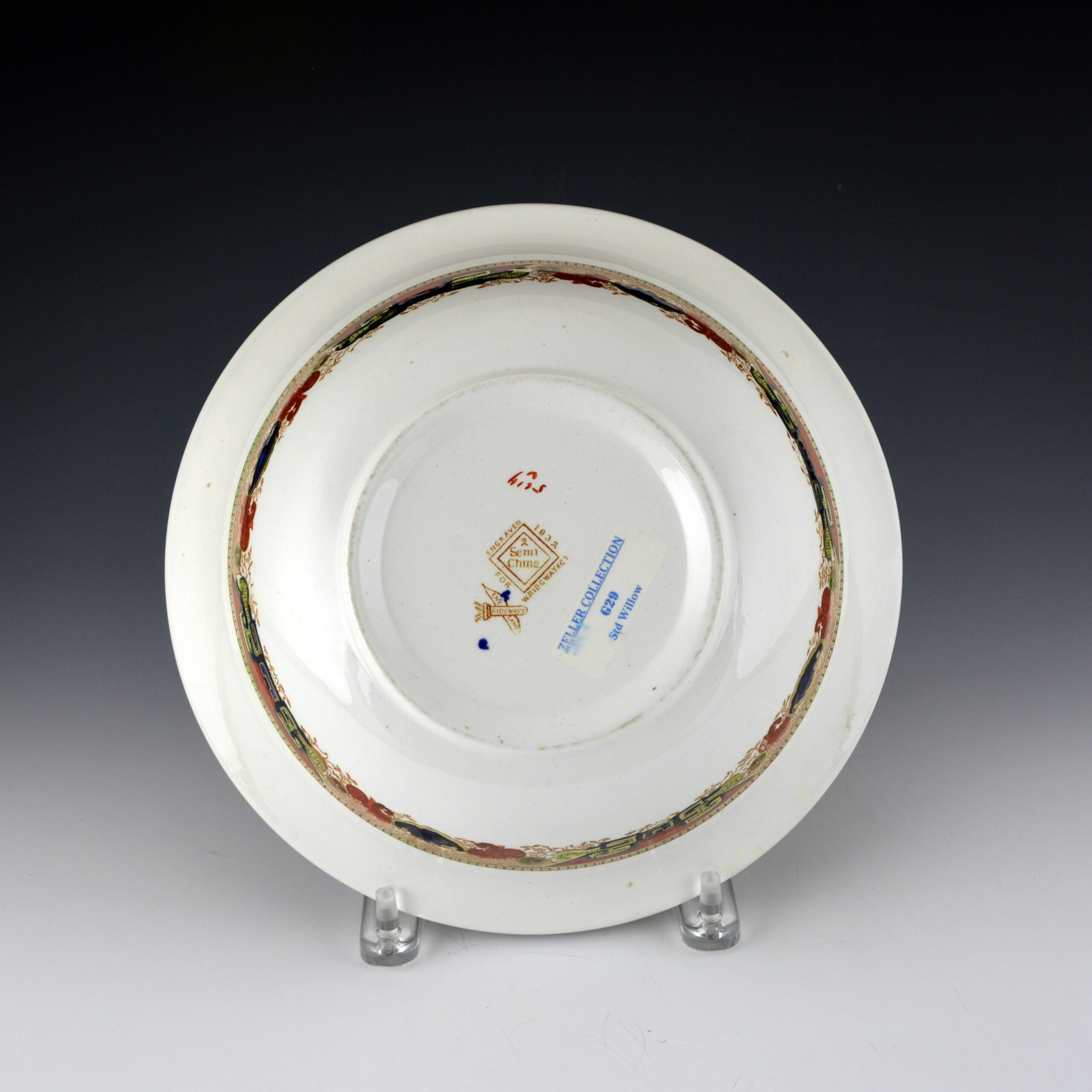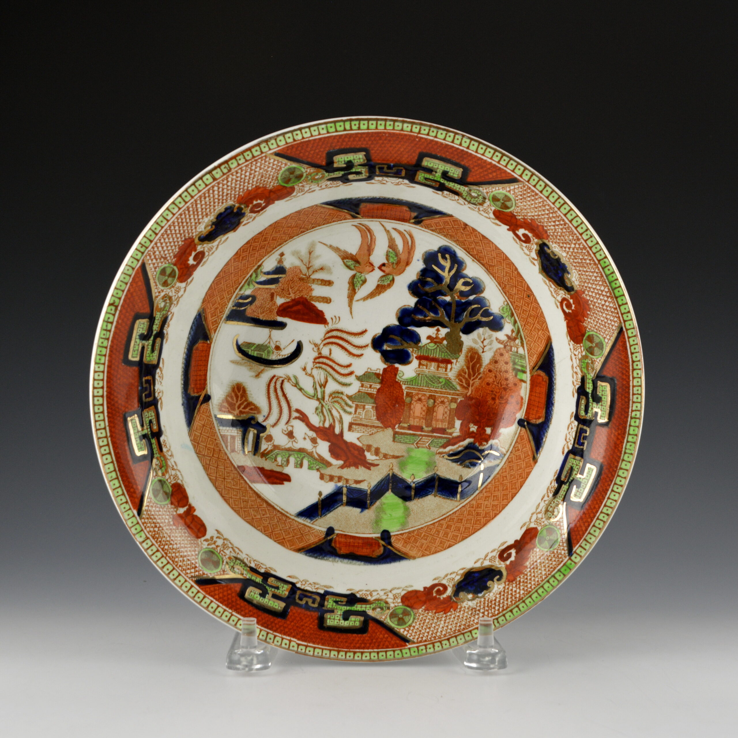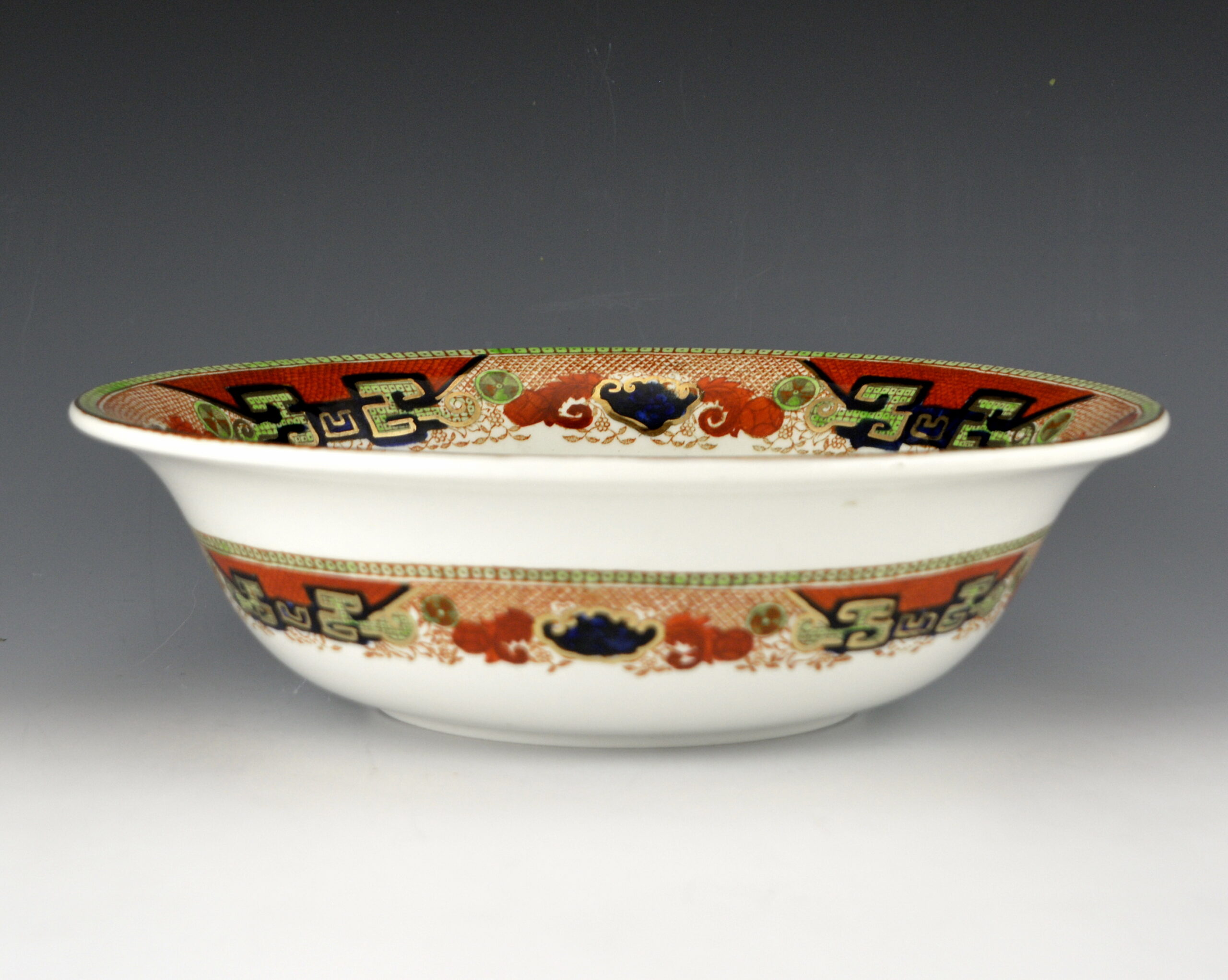 A large round earthenware berry bowl printed in brown underglaze with the Standard Willow pattern and enameled overglaze with cobalt blue, rust and green an with gilt decoration added. This bowl is part of a berry set purchased with six 6″ bowls (also in this collection, see G28).