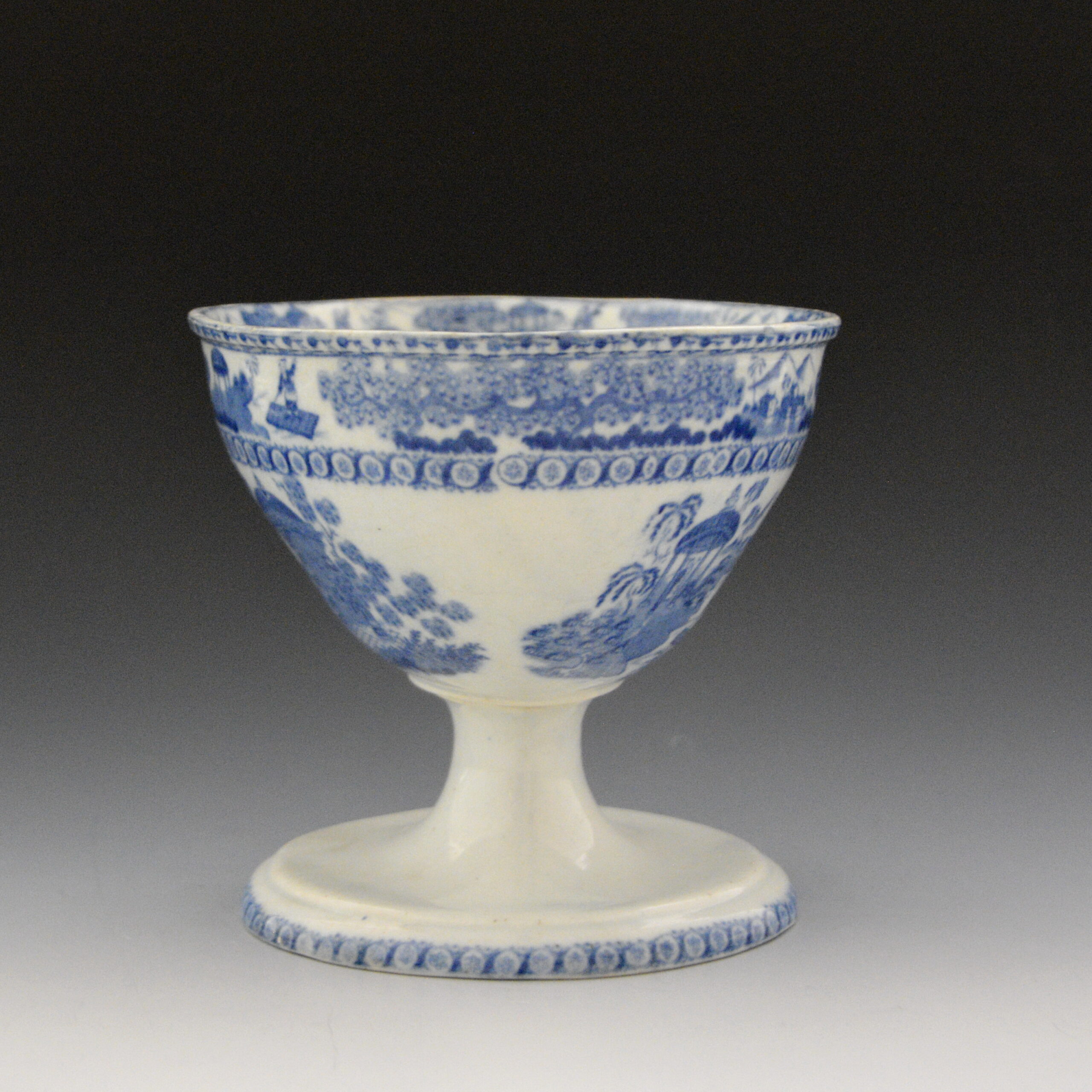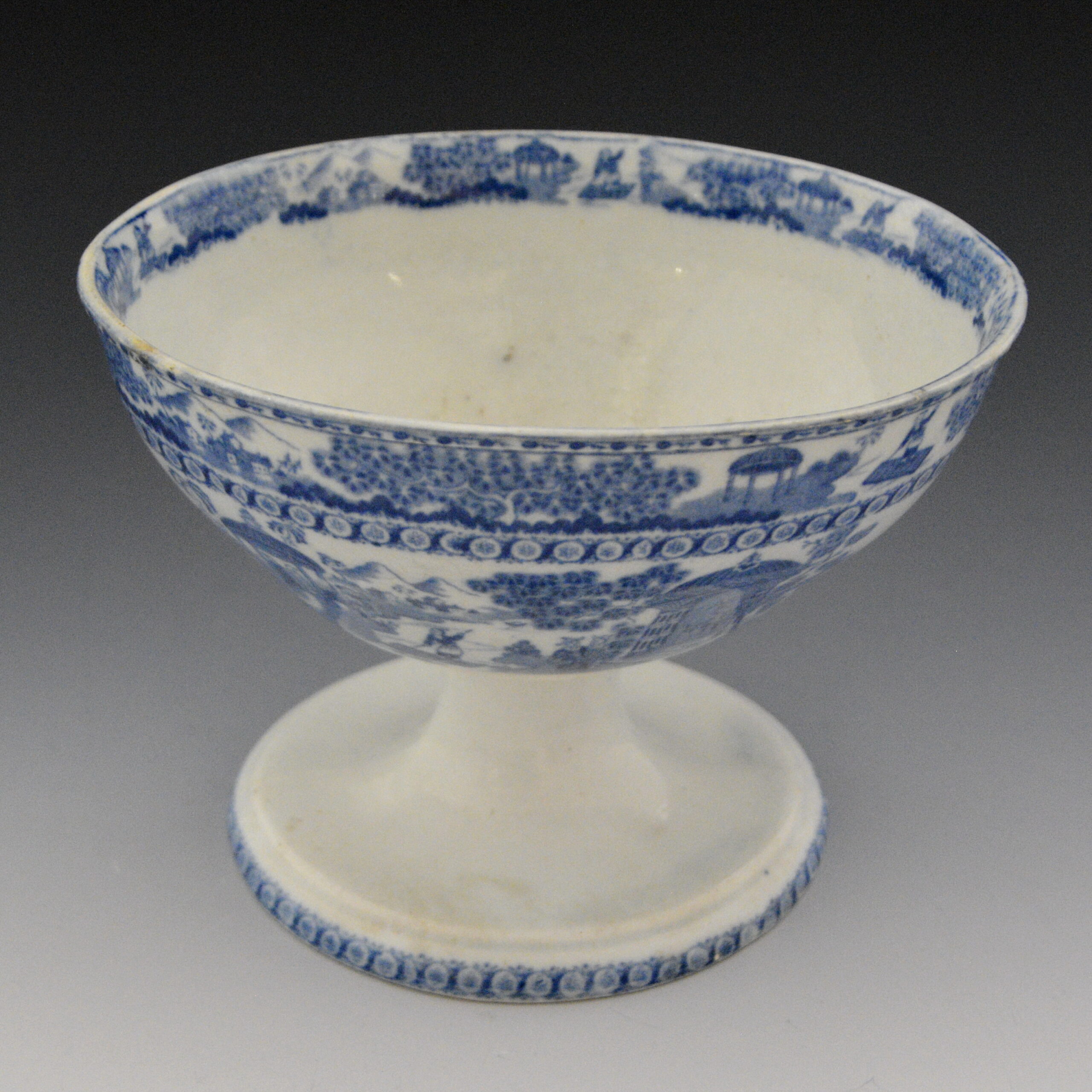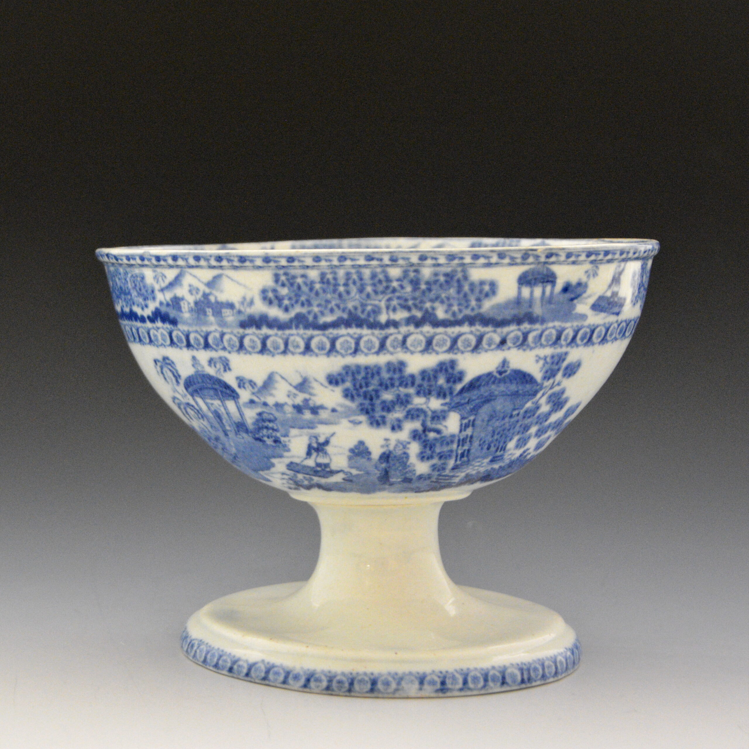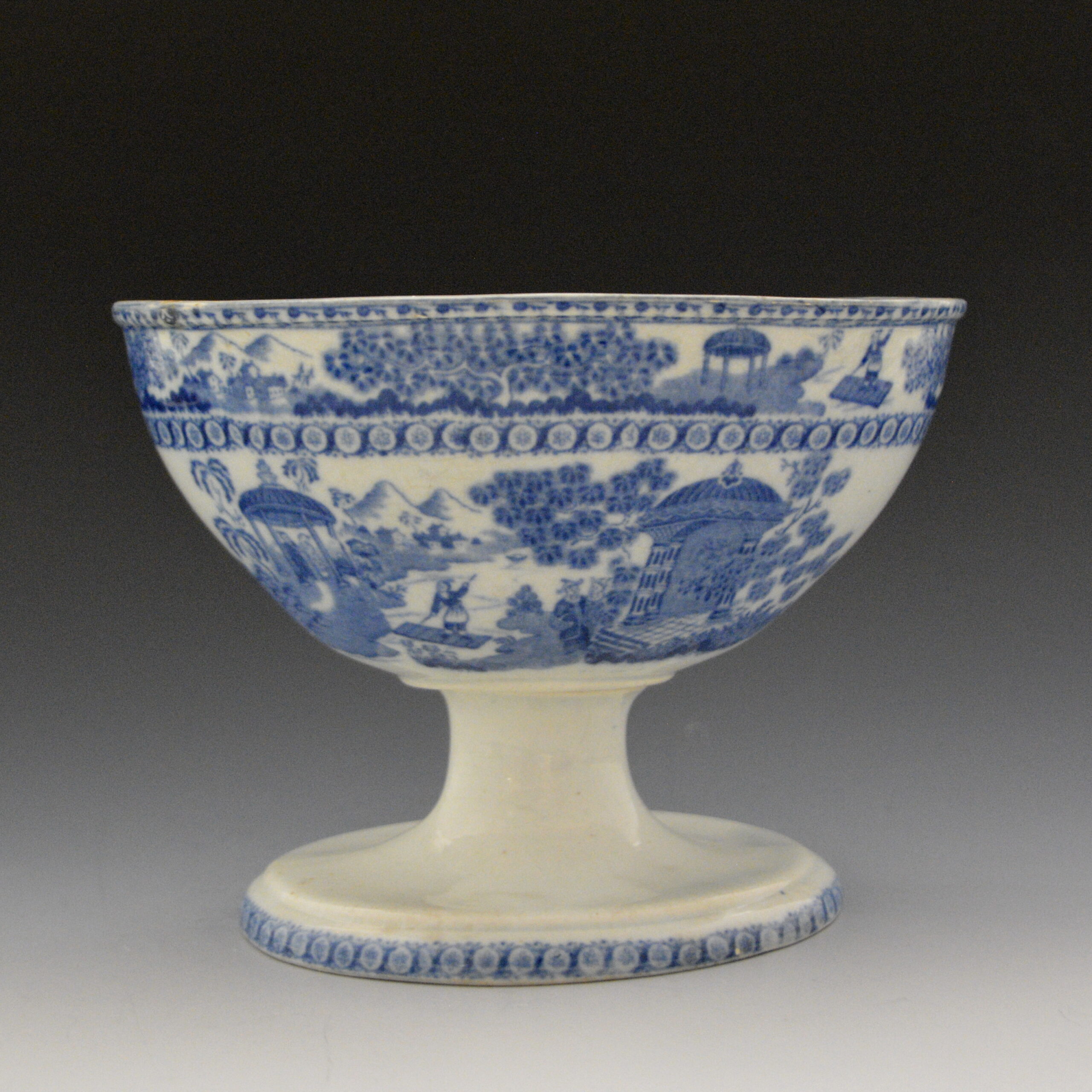 An earthenware oval shaped, footed center supper dish without lid printed in blue underglaze in the Chinese Raft pattern.