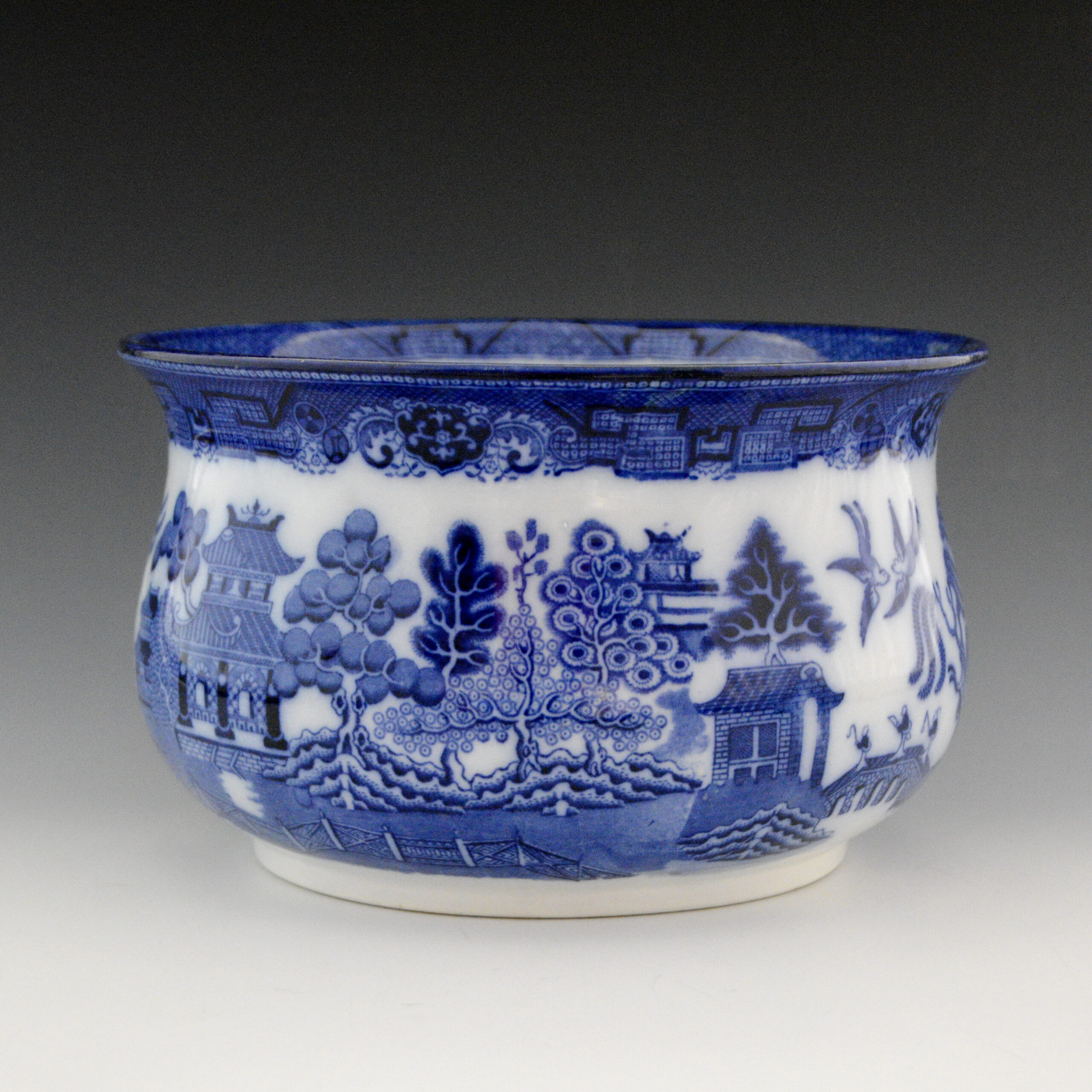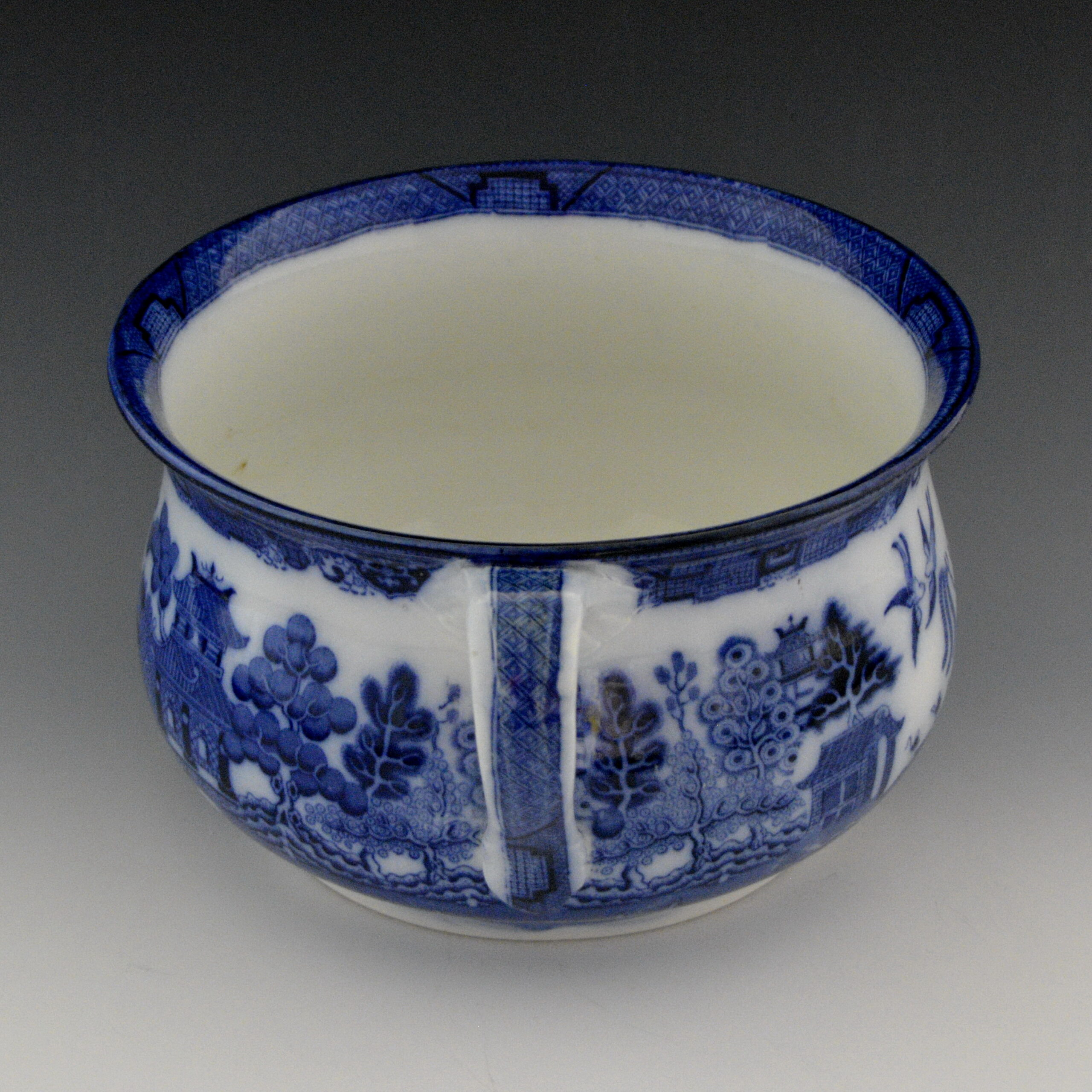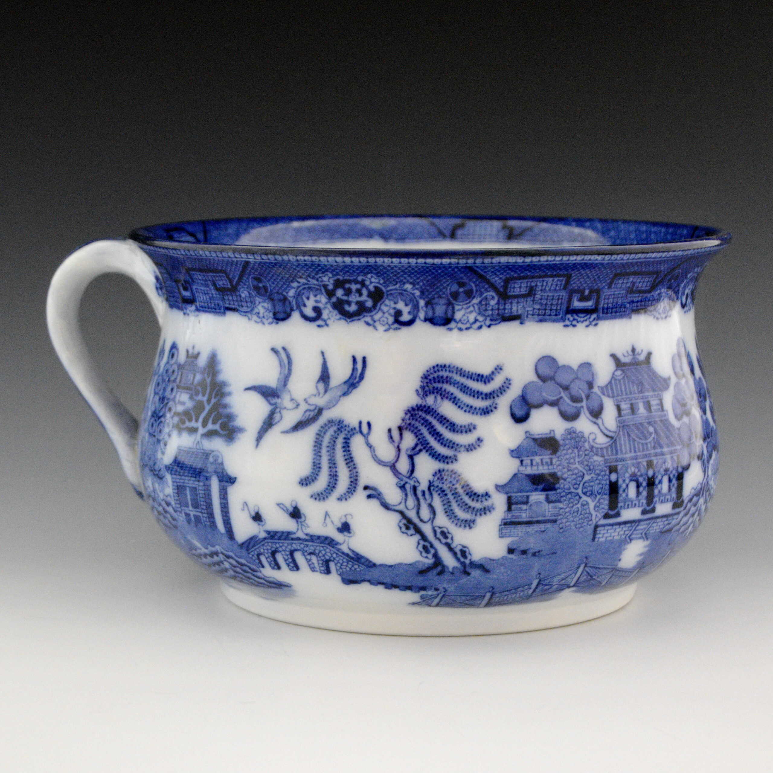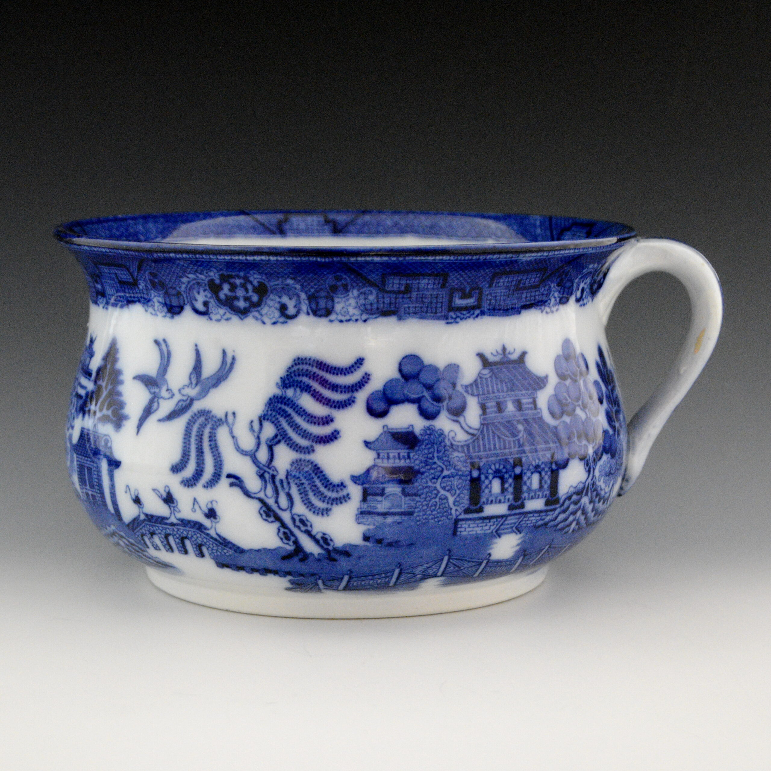 An earthenware chamber pot with handle printed in flow blue underglaze with the Standard Willow pattern. It is marked Doulton Burslem “Willow”