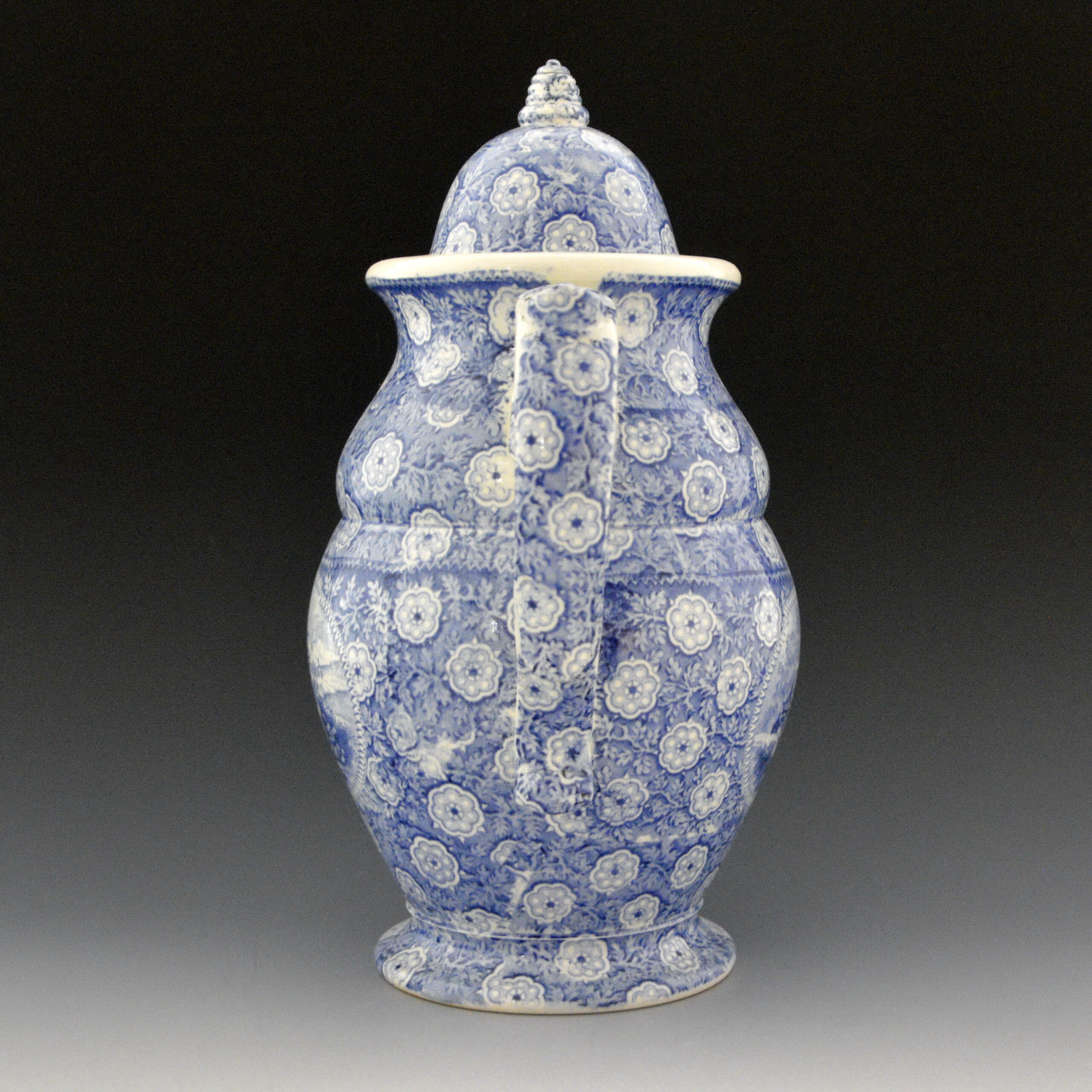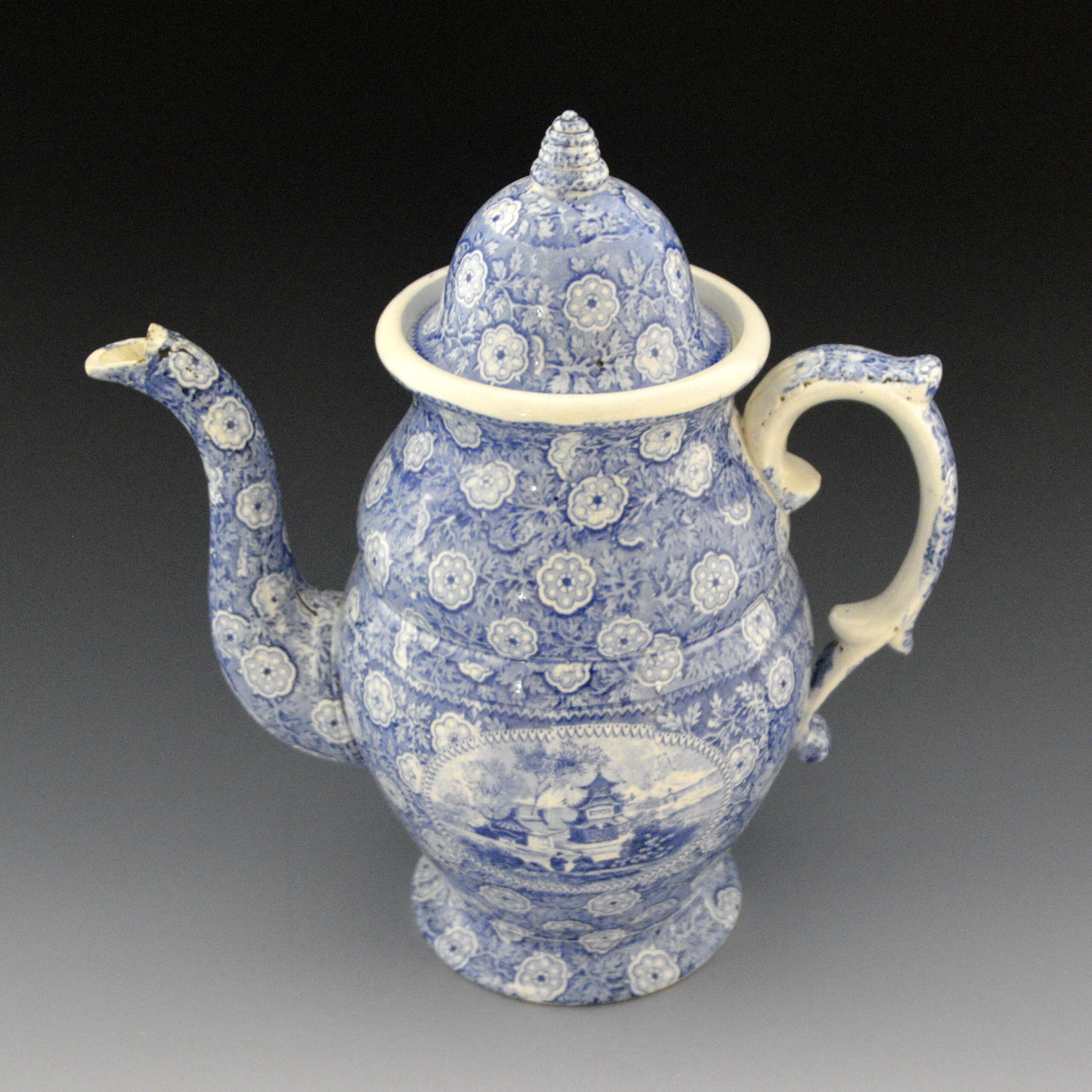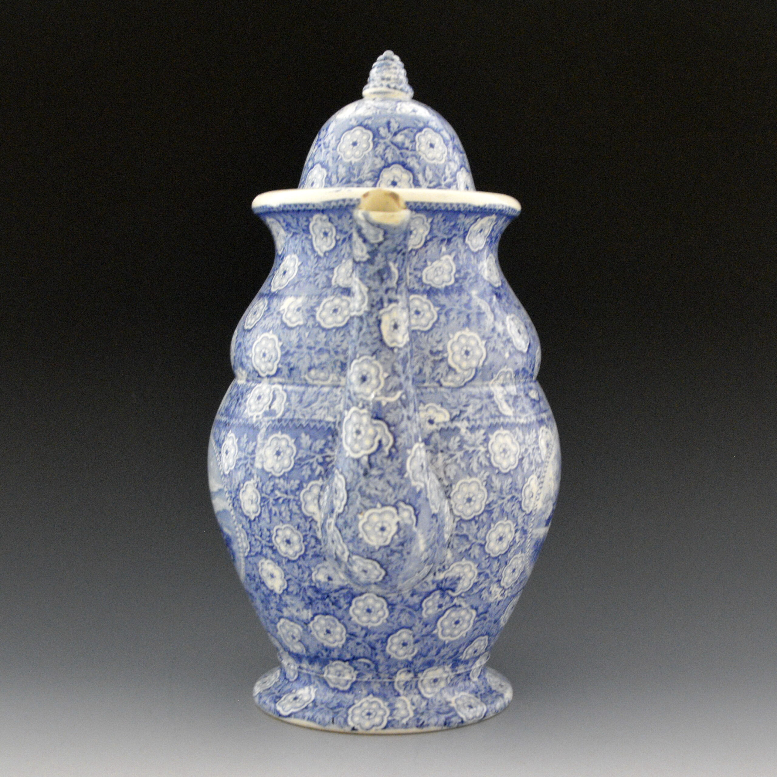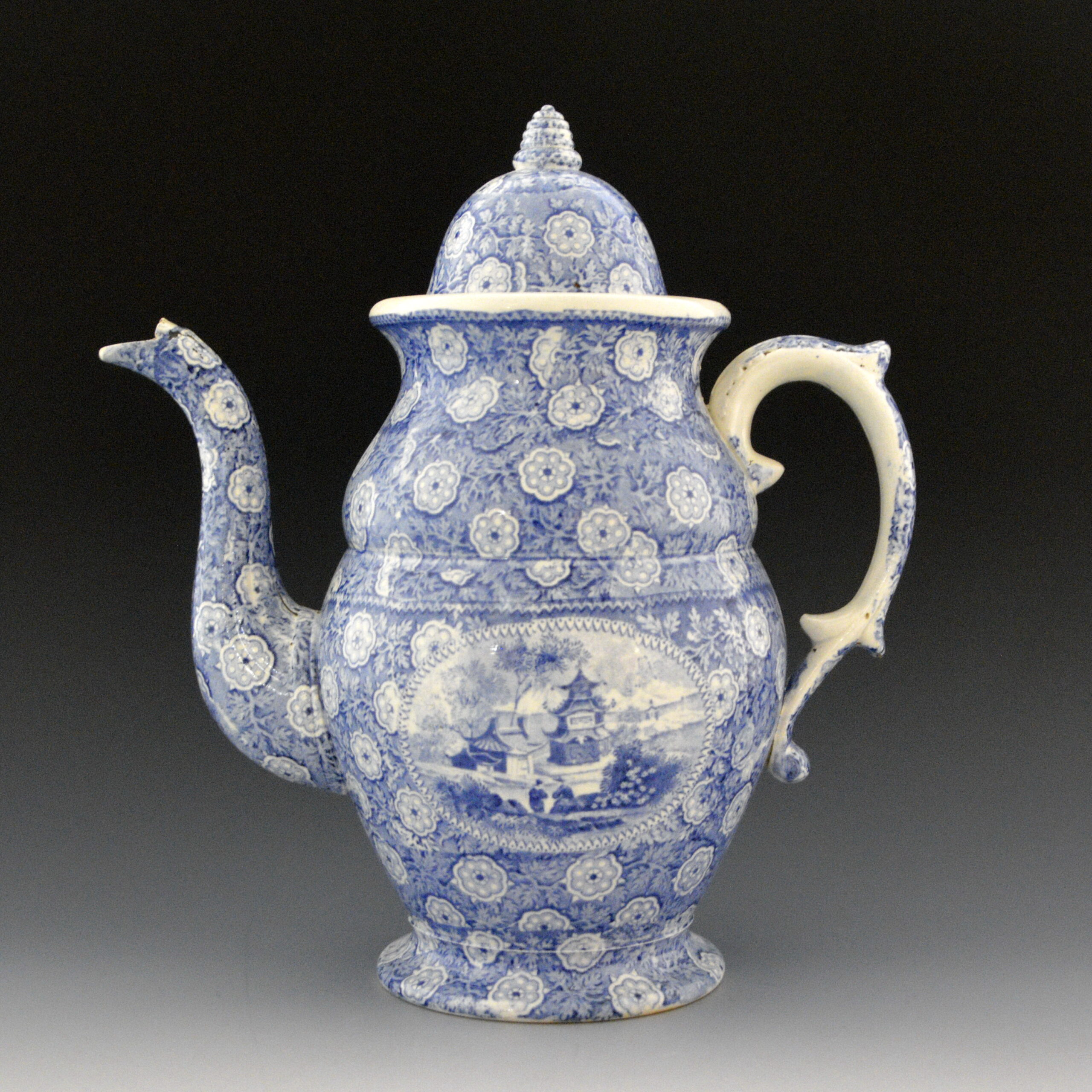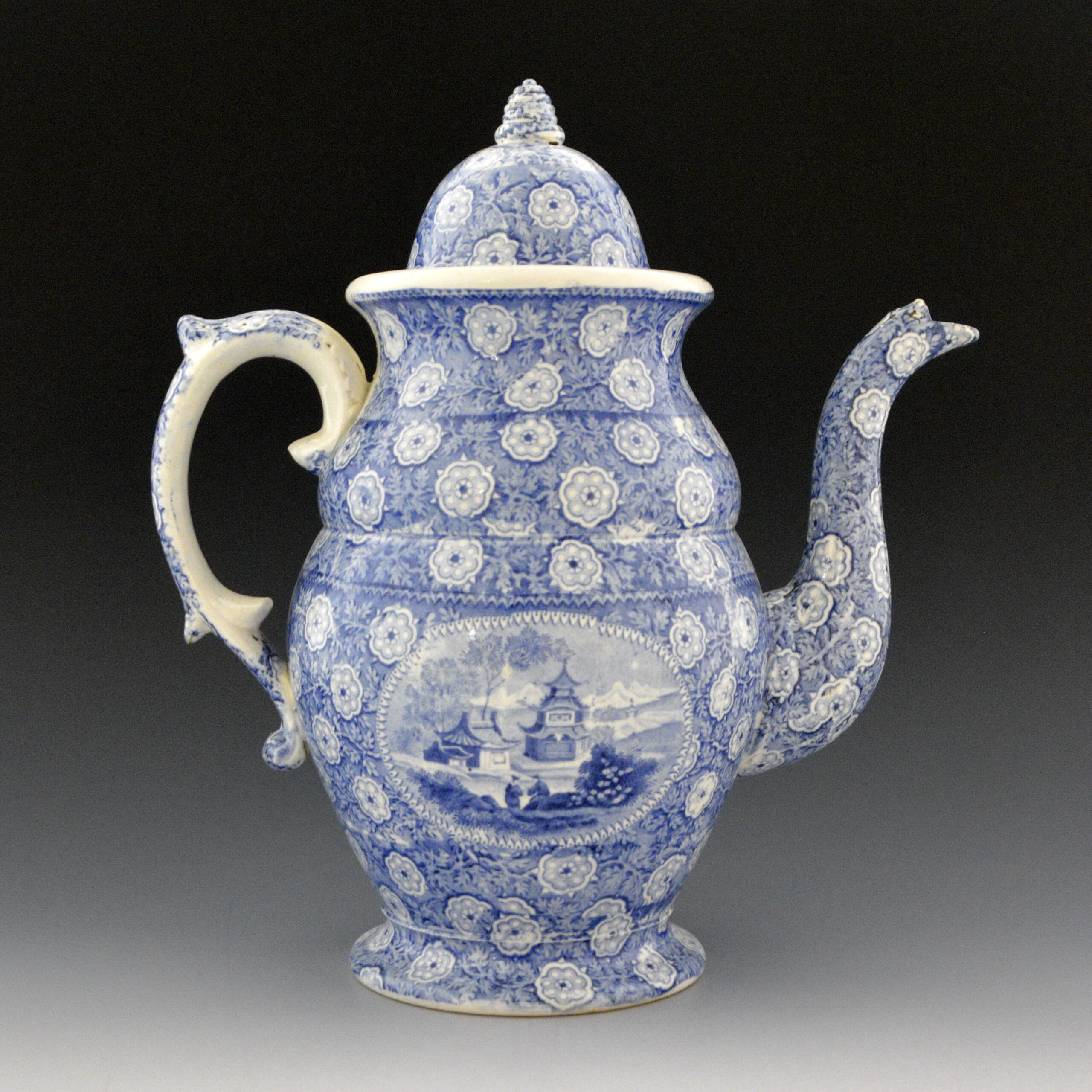 An earthenware coffee pot with the central pattern printed in a medallion surrounded by an all-over floral chintz underglaze. Also seen on tea wares. Possible attribution to Enoch Wood & Sons. A teapot in this same pattern with an impressed “WOOD” mark was auctioned on eBay.