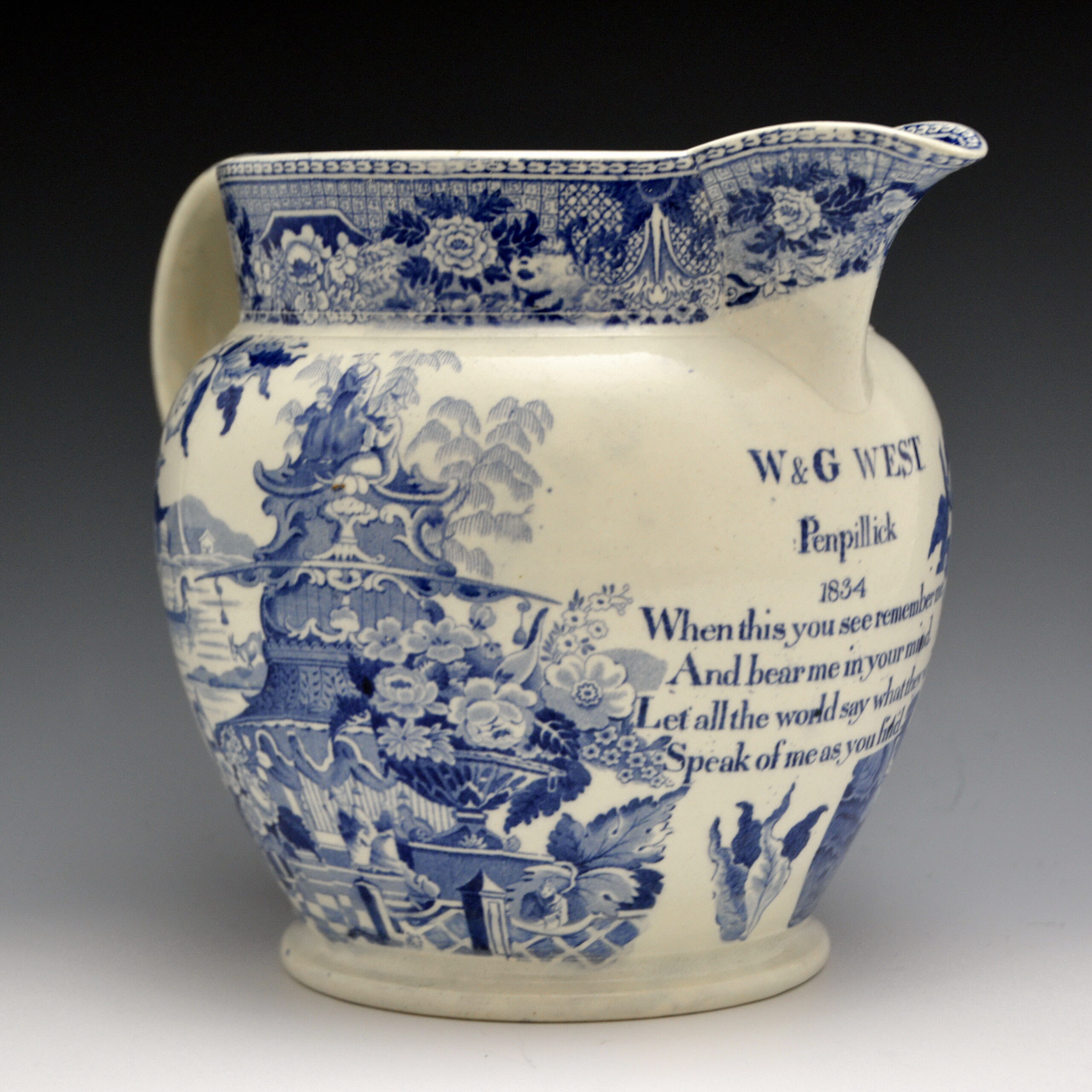 The hamlet of Penpillick, inscribed on the jug, is in Cornwall. While one might suppose that the jug would have been ordered from a factory regionally situated near this village, it is impossible for me to speculate as to the factory that might have made it. The rhyme found on the jug is referenced in Baker’s 1984 book titled Sunderland Pottery, p. 132. It is rhyme #318 and is known to have been used on Sunderland wares.