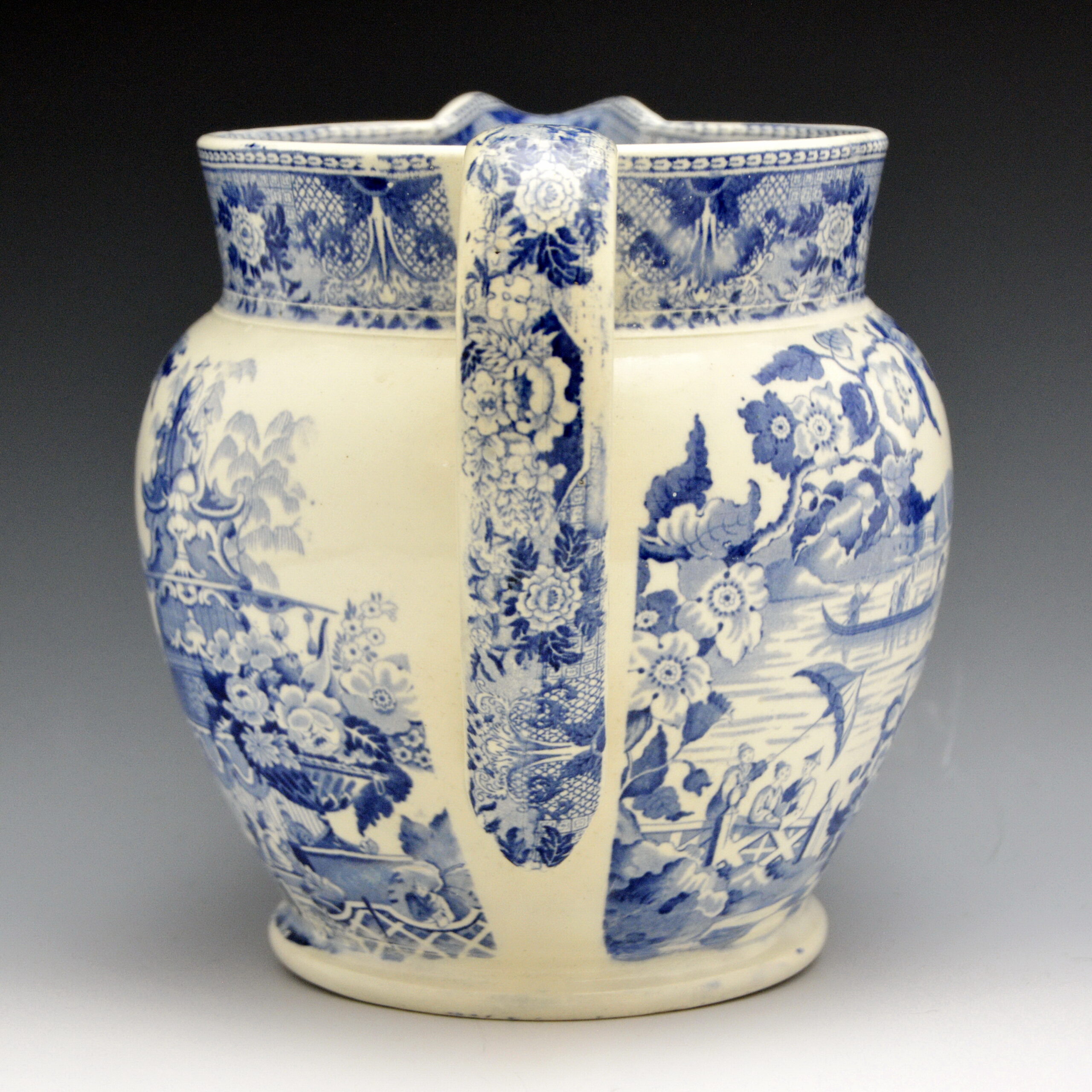 This pattern is a good example of late transitional Chinoiserie style. It presents a lakeside setting with a highly ornate pagoda in a lush garden, a parasol figure and a large jardinière with flowers, all framed with a floral and scroll border. Along with others like Ornate Summer House, also by an unknown maker, and Clews’ Weeping Willow Border Series, these designs can be considered precursors to what would become patterns that exhibit a more romanticized idea of Chinese landscape and genre scenes popular during the Romantic Period.