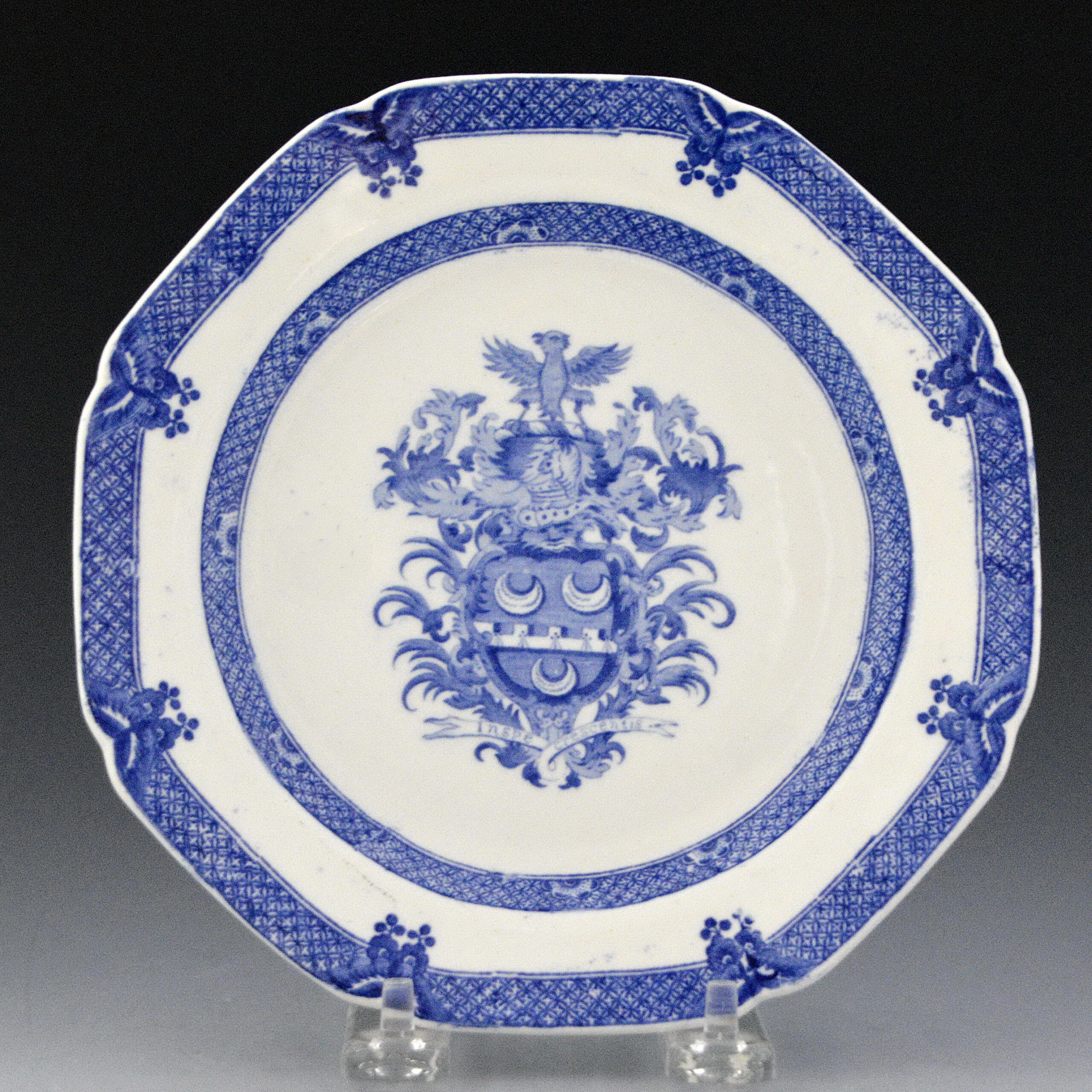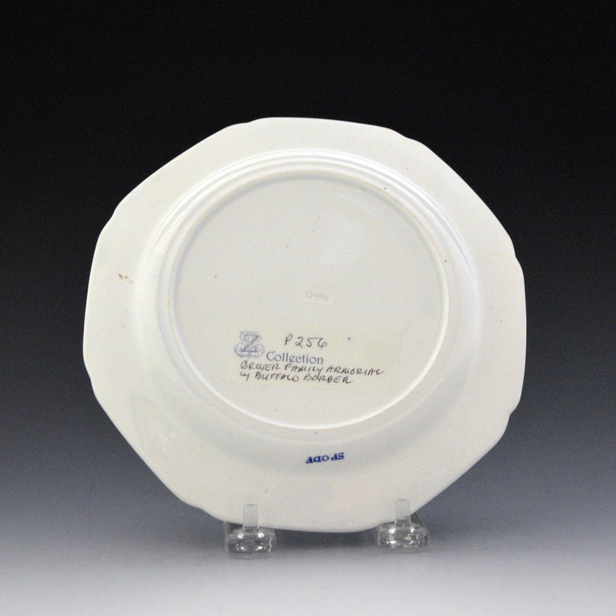 Earthenware plate printed in blue. The border patterns were copied from an earlier Spode Buffalo pattern. The center has a beautifully-engraved armorial or badge that pertains to the Glover family of Norfolk. Pottery manufacturers often produced special order services that relied on an existing border pattern, then added a family crest to the center of every piece. This was very much in the tradition of Chinese porcelain makers who had provided this service to wealthy European clients in the 18th century. Caughley and Spode were known to produce replacements for broken Chinese-made ceramics bearing a family crest.