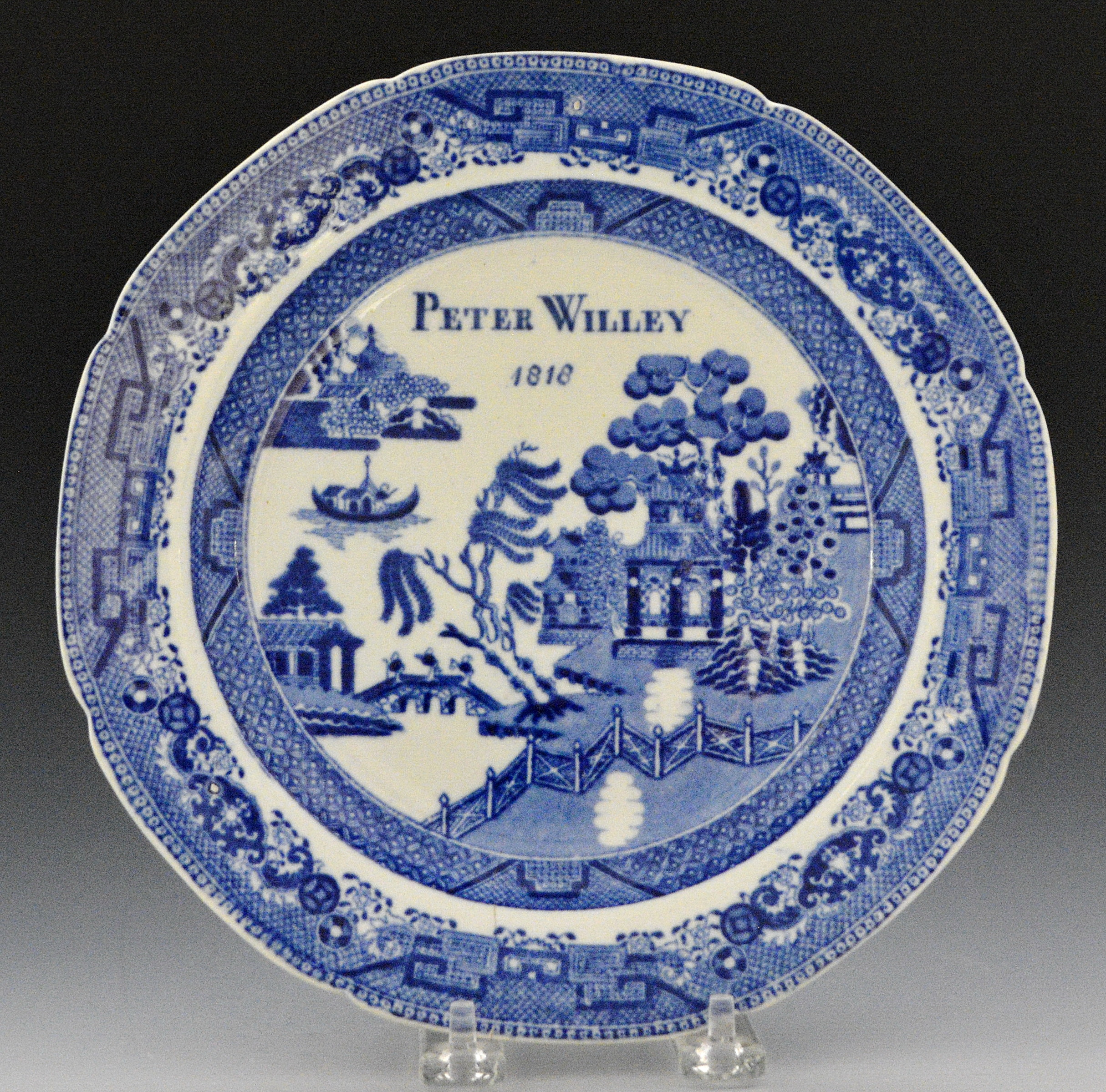 An earthenware indented plate printed underglaze in blue . The name “Peter Willey” and the date “1818” were painted underglaze in the uppermost center of the plate. The Willey family is said to have been of Cornish decent. Dedicated flatware pieces are less commonly found than hollow ware pieces which makes this plate a rare example of commemorative flatware. Two other plates with the names “Thomasine” and “Grace Willey” from this same family is also known to have survived. The former is in the Potteries Museum collection, Stoke on Trent. Condition note: Hairline in the lower rim that was professionally sealed .