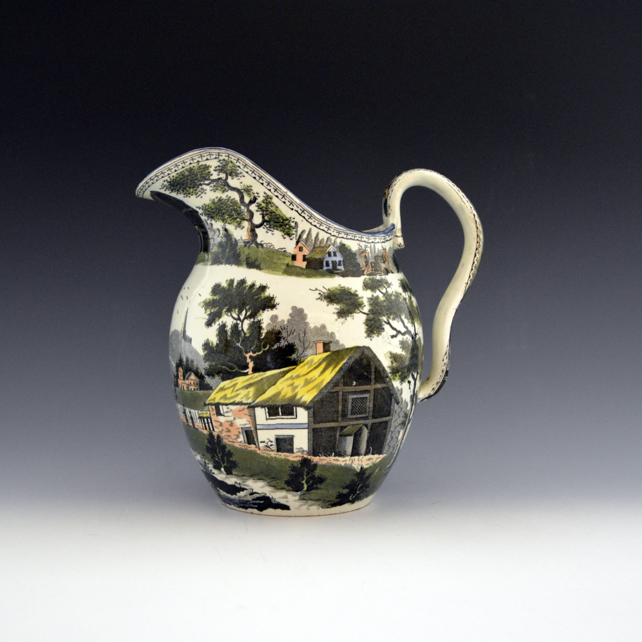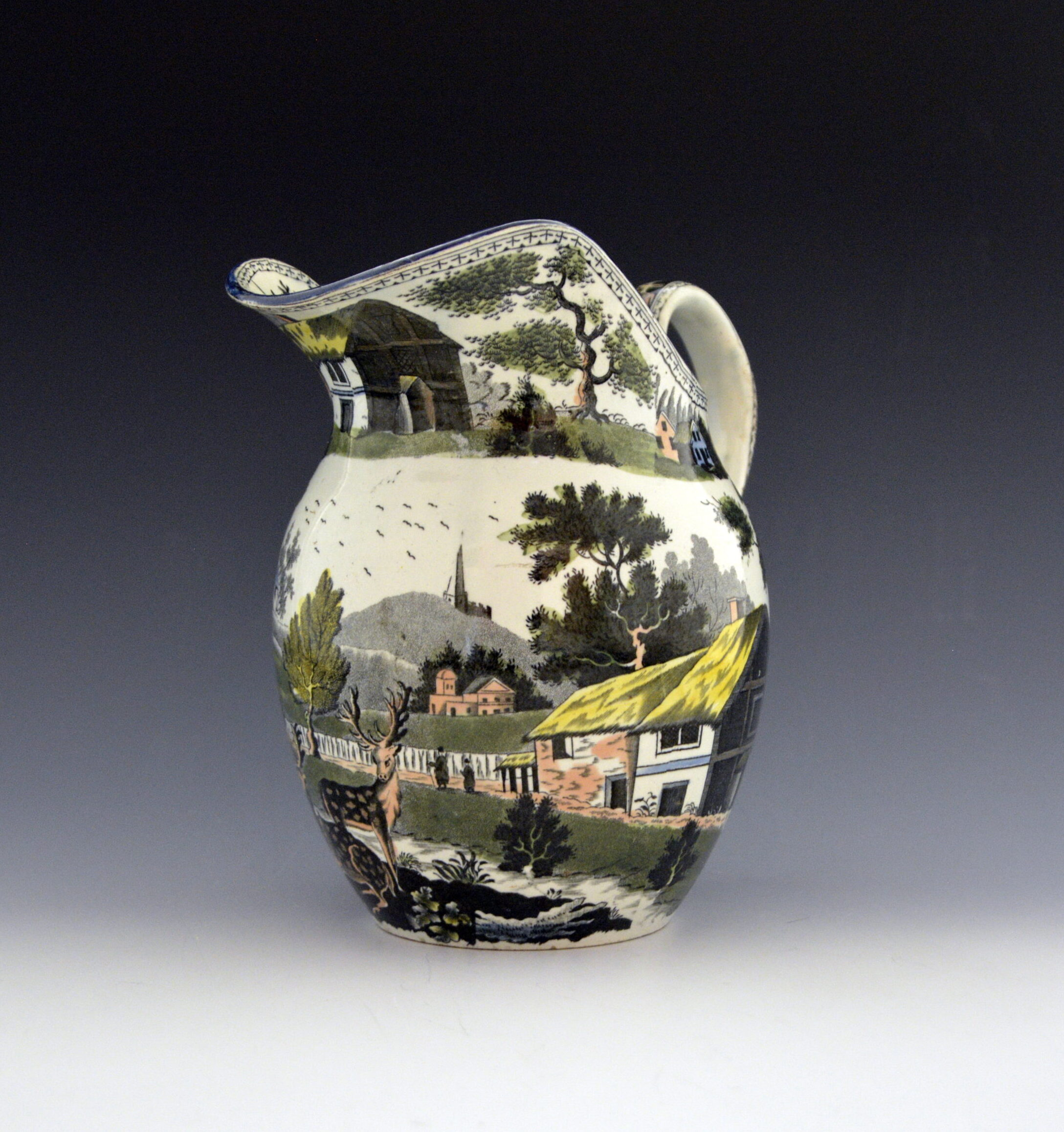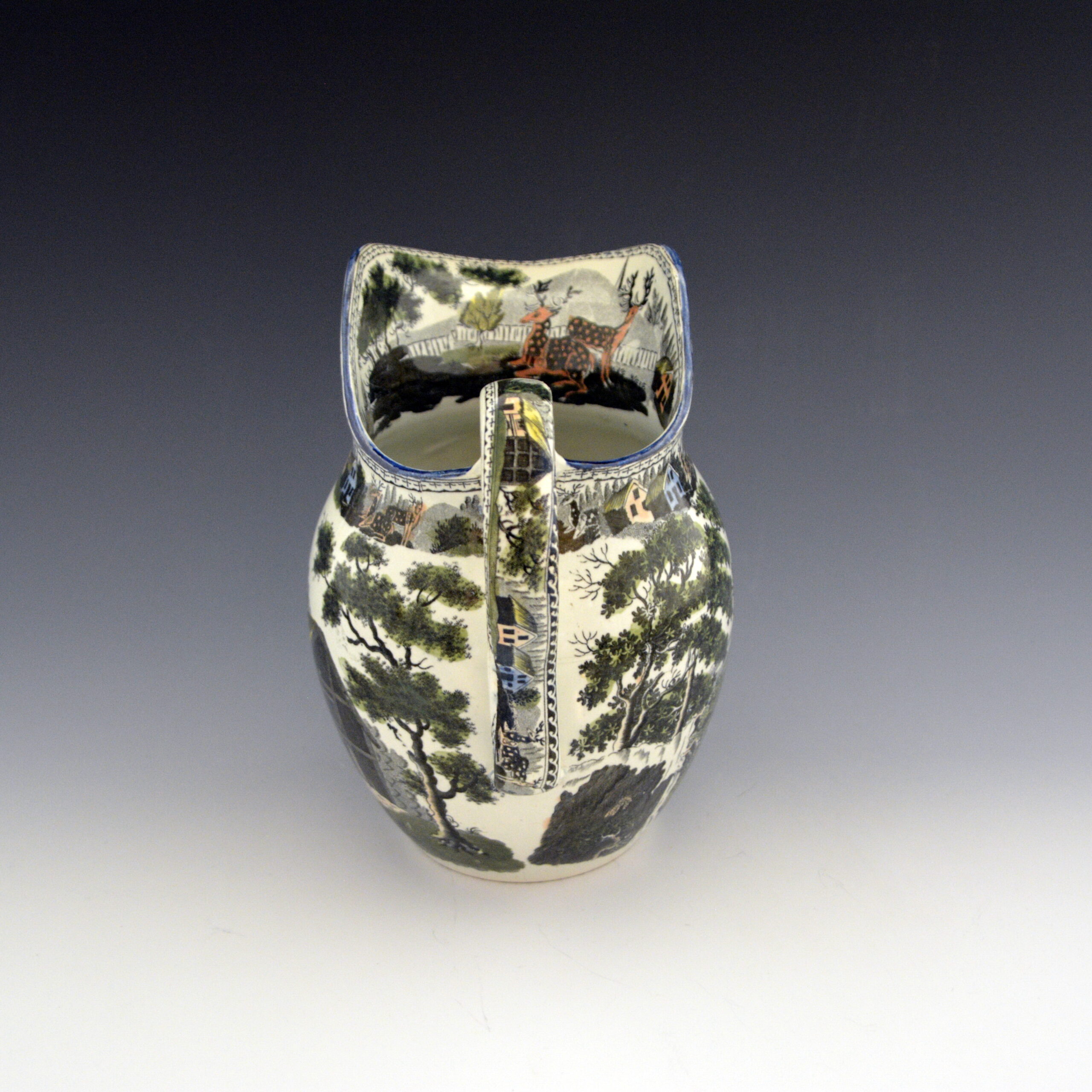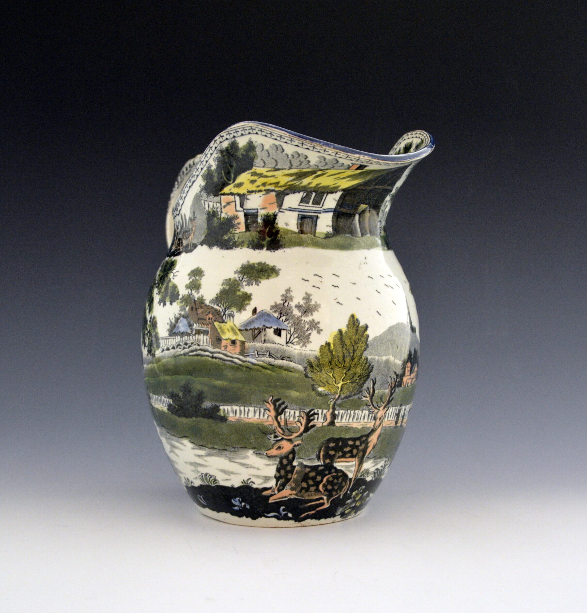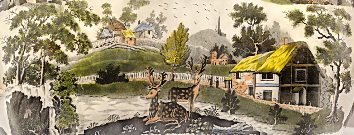This pattern is not considered Chinoiserie. I just happened to like it, so I added it to my collection. A tall earthenware ewer printed in black in the Fallow Deer pattern and colored in under the glaze in pink, yellow, green, and blue. This is a wrap-around or continuous pattern. Fallow deer are popular animals on transferware. The Fallow Deer was spread across central Europe by the Romans. They were introduced into southern England in the first century AD. It is not known whether these escaped to form a feral colony, or whether they died out and were reintroduced by the Normans. The Fallow Deer is easily tamed and is often kept semi-domesticated in parks today”.