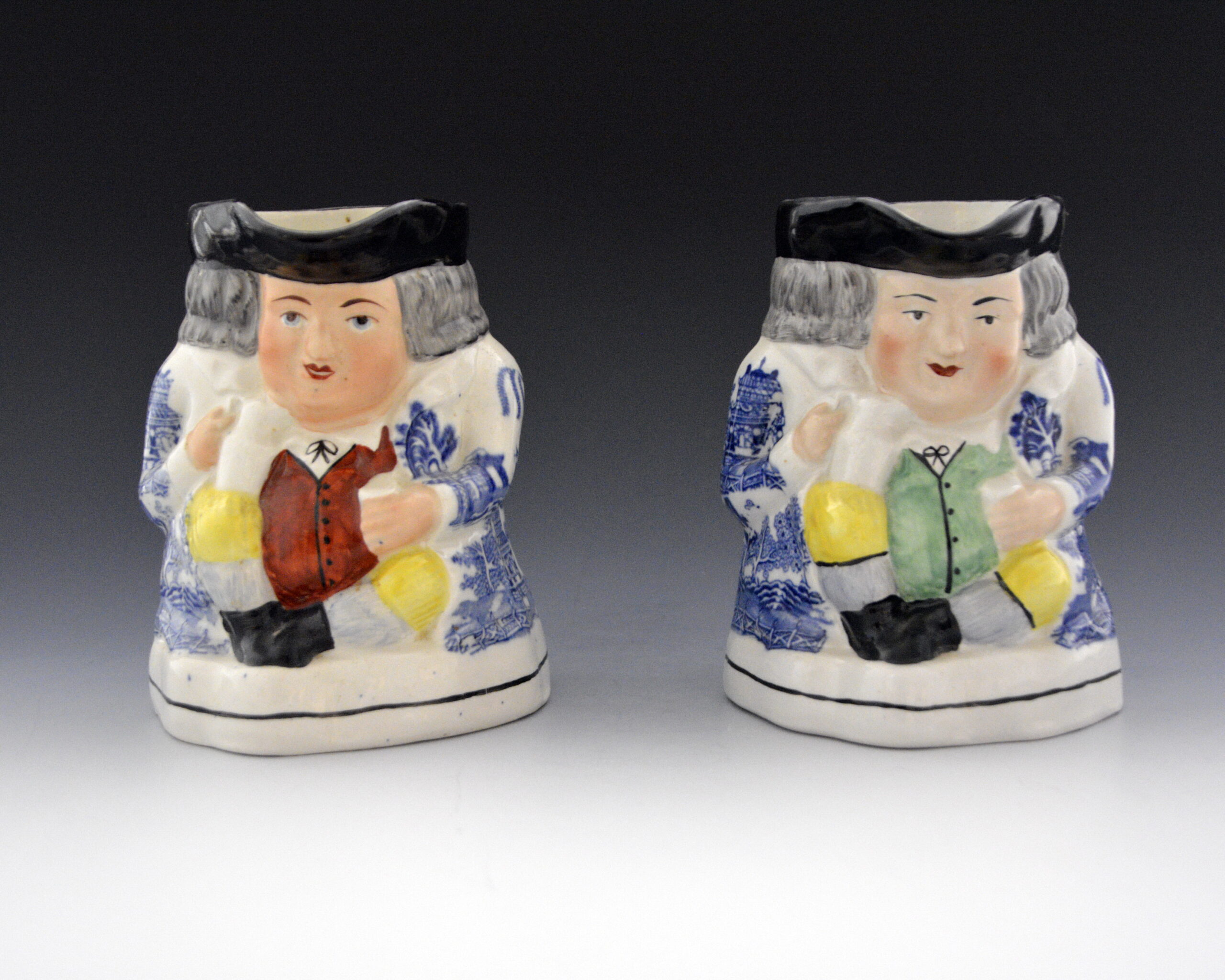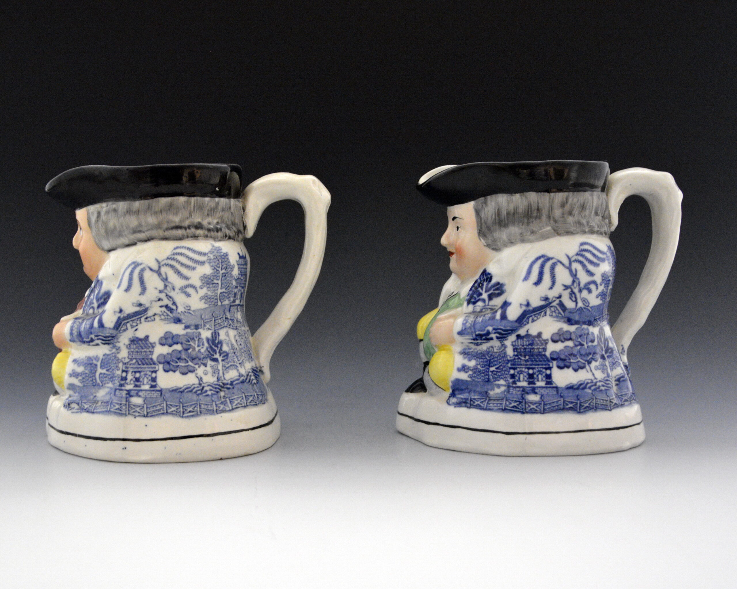 A pair of molded earthenware seated Toby jugs printed in blue underglaze on the jacket with the Standard Willow pattern. Other features were hand-painted under the glaze.