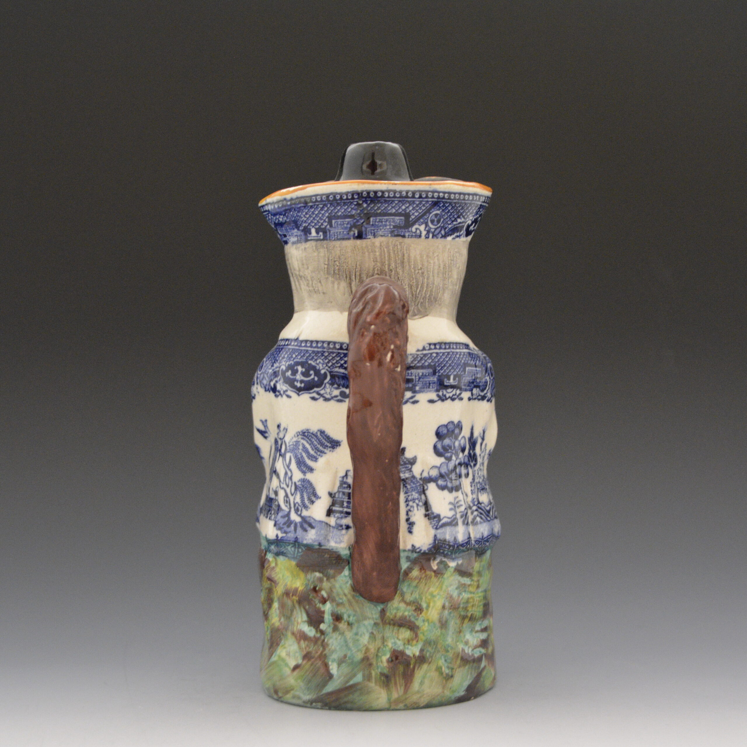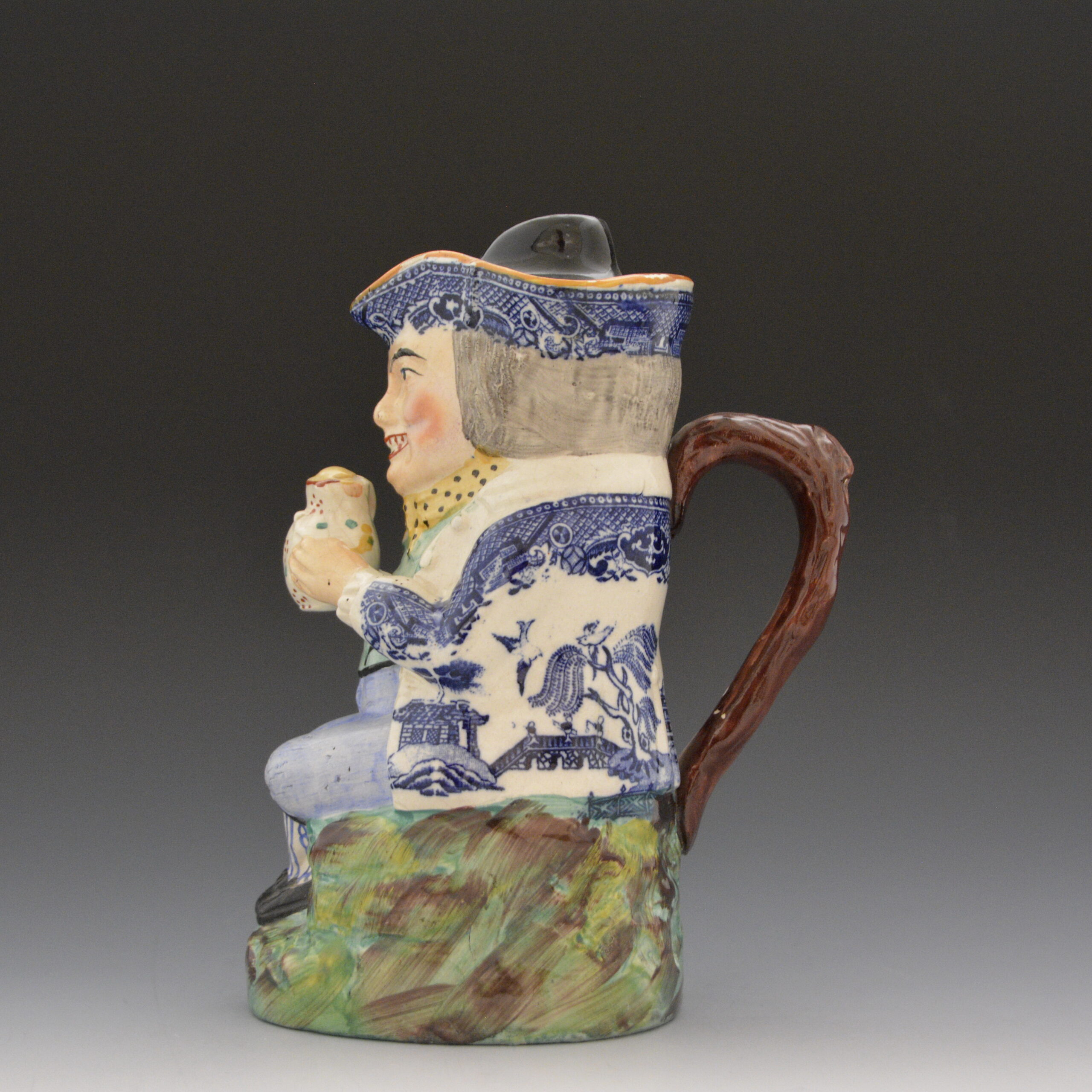 A molded earthenware Toby mug printed in blue with the Standard Willow pattern on the jacket and the companion border pattern on the brim of the tricorn hat. The other surfaces on the remainder of the body were hand painted overglaze . The original lid was painted underglaze in black. The figure holds a jug of ale.