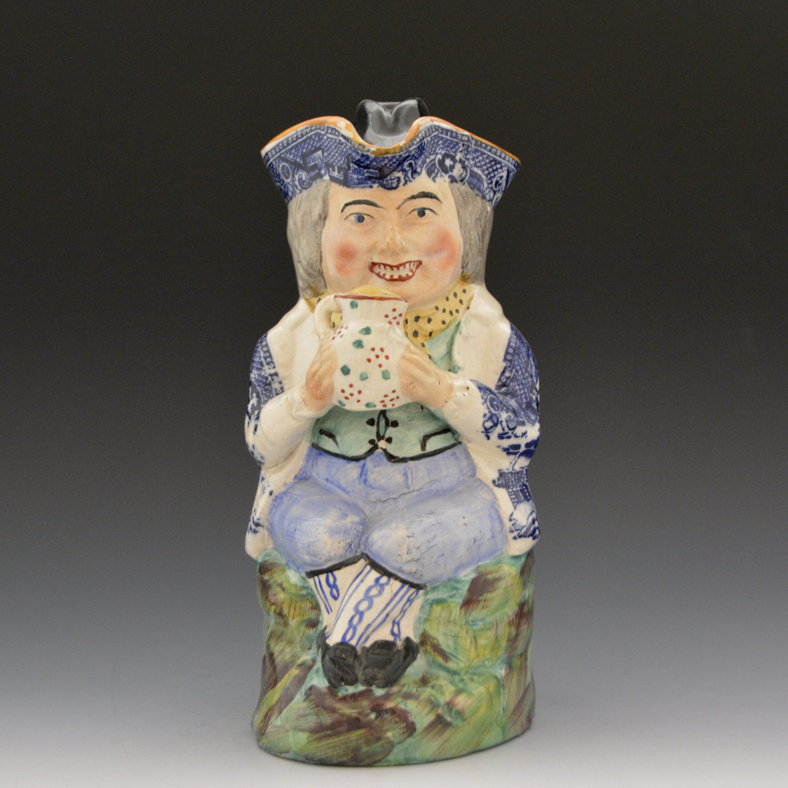Sampson Smith, Longton, produced a large number of Toby-shaped mugs, modeled after earlier versions of the seated Toby, but nearly all that remain in the market today were completely hand-painted. Few examples can be found on which the factory also transfer-printed patterns, suggesting that the printed and painted versions were produced in significantly smaller numbers. This is an earlier example of Smith’s Toby jugs. Blue britches, green vest and yellow bandana with black poka dots. This example has the original cover. Character holds a jug of ale.
