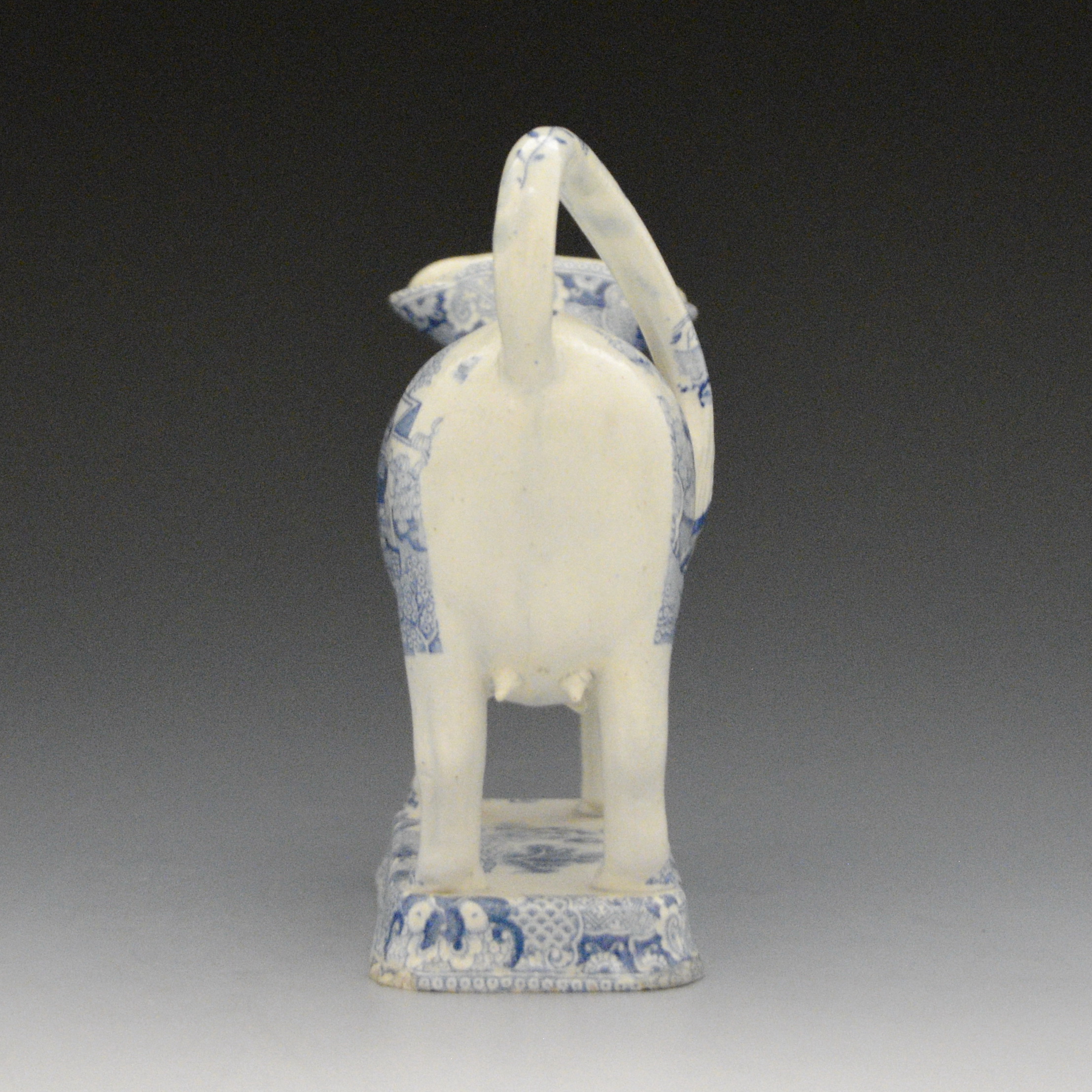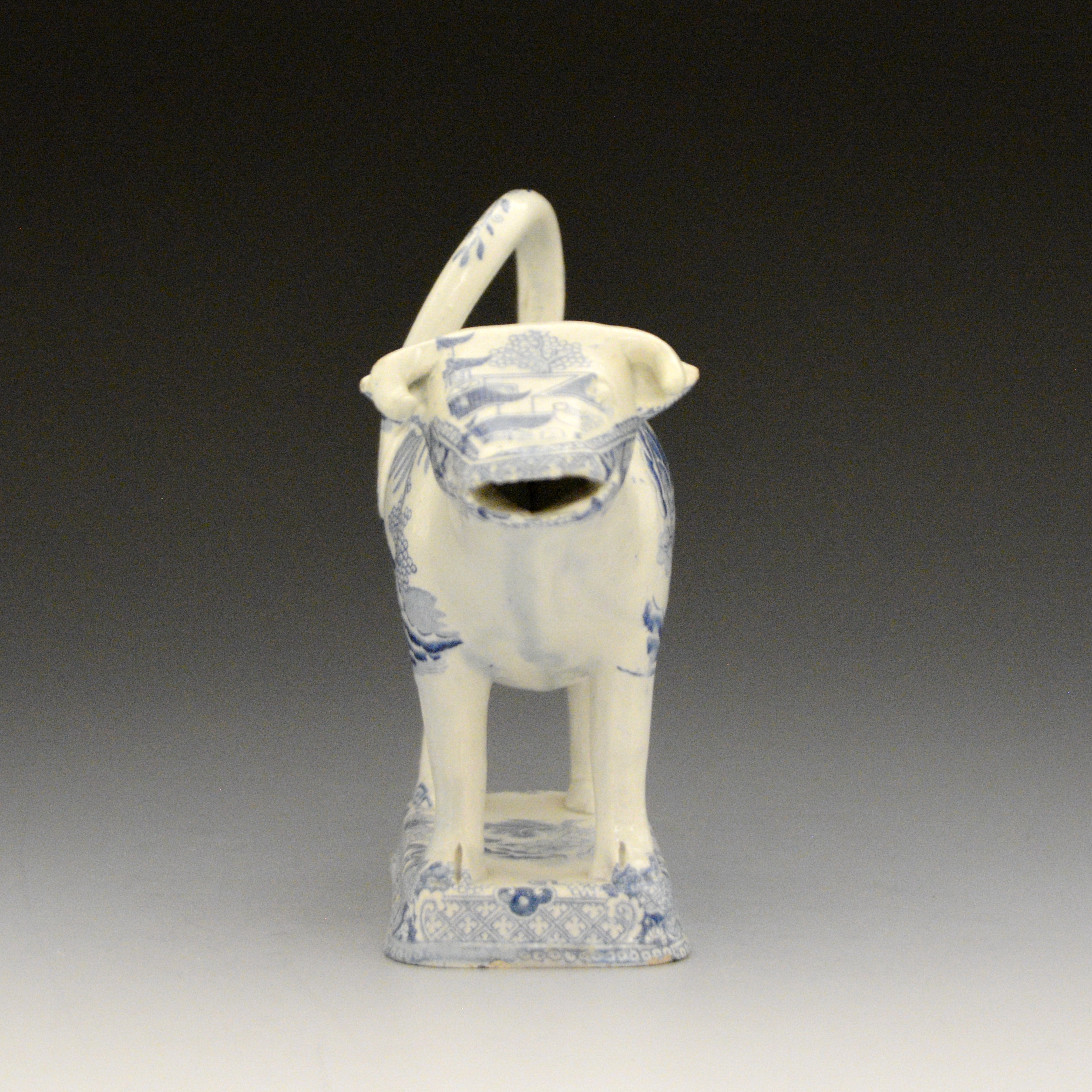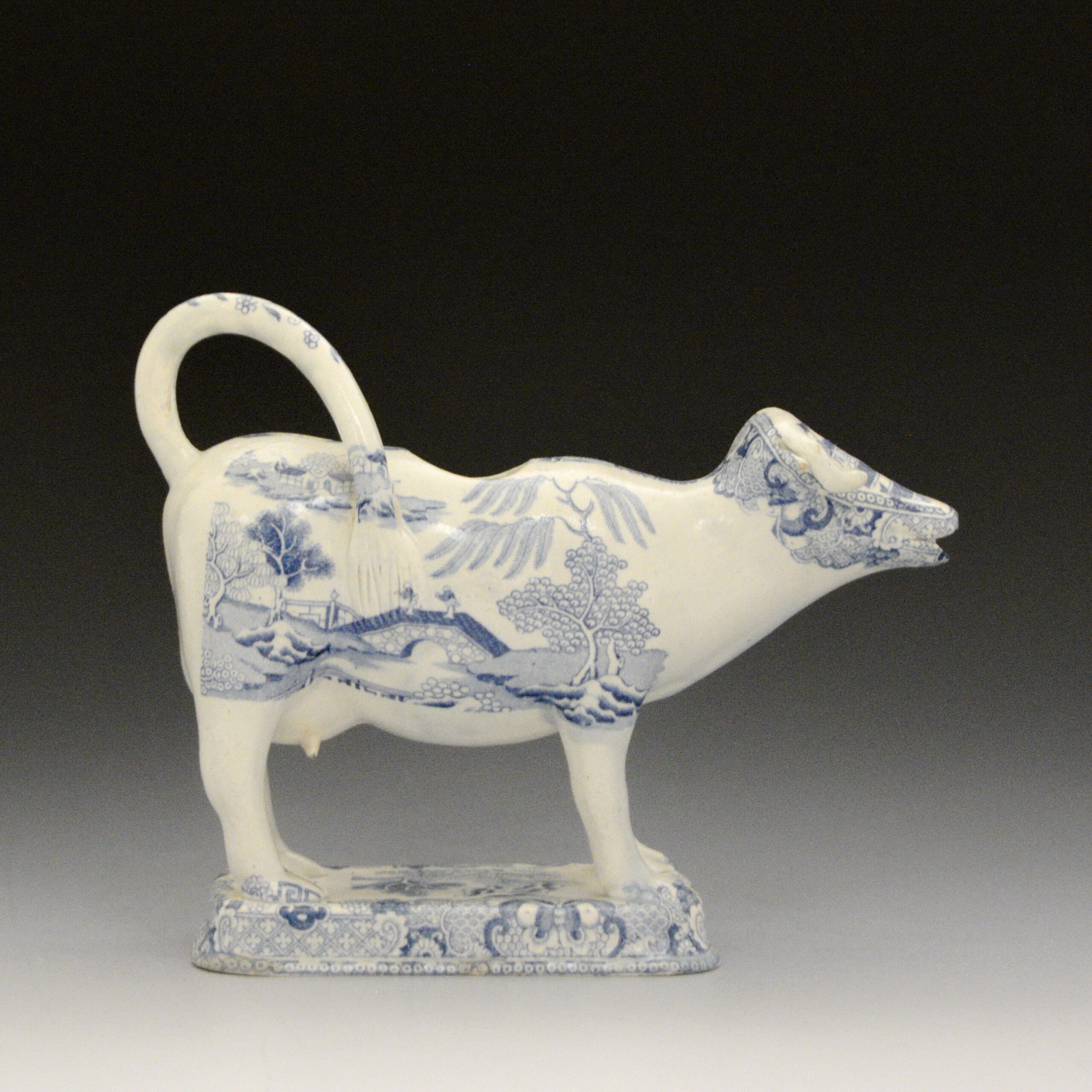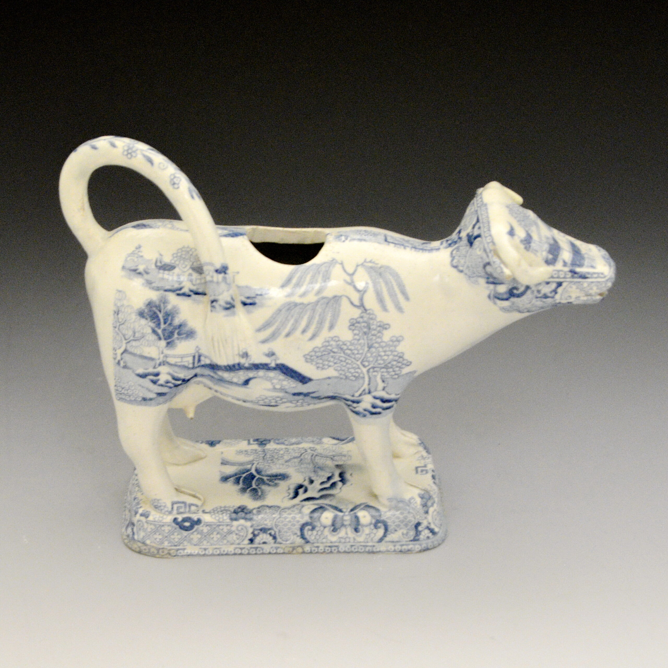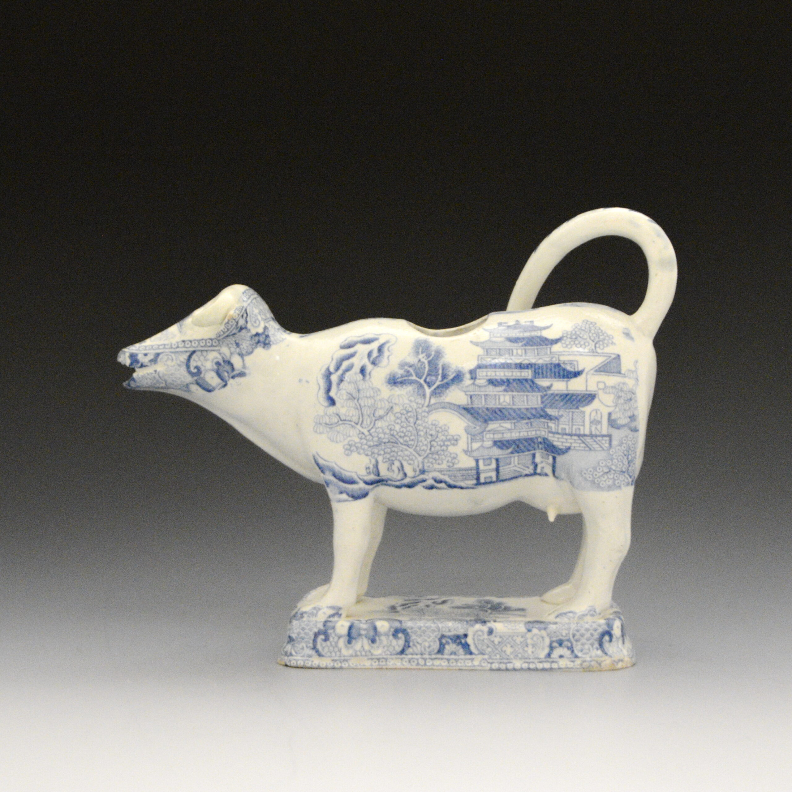 An early earthenware cow creamer without lid transfer printed with the Two Temples II, Variation Broseley pattern. The shape is like one found in the cow creamer collection on exhibit in the Pottery Museum, Stoke on Trent. Same shape as F9 in this collection. S