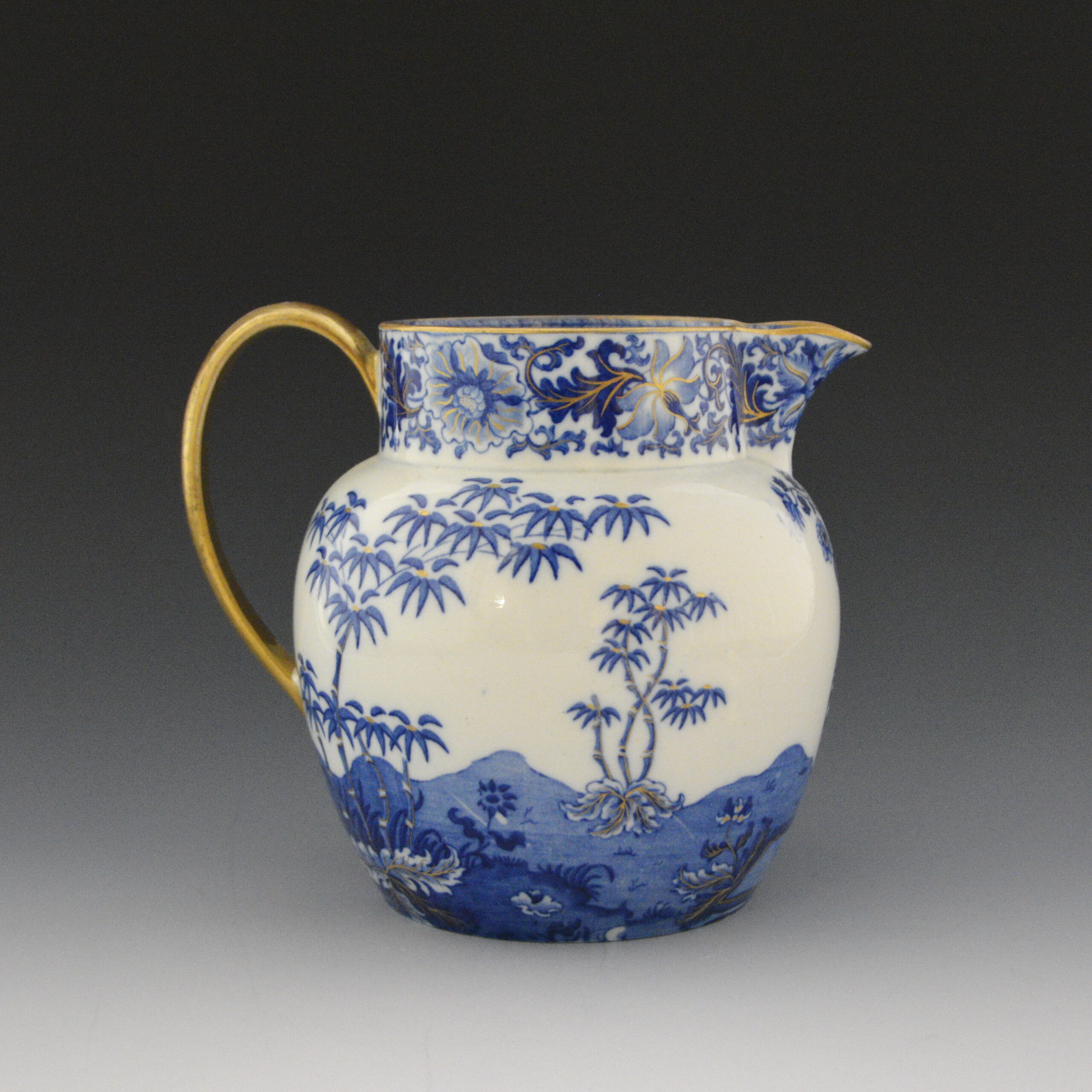 An earthenware milk or water jug printed in blue underglaze with the Blue Bamboo pattern with gilt decoration added. This pattern is also known as “Chinese Vase.” The focal point is a Chinese musician seated within a large vase and playing a mandolin. The vase sits on a large table in a garden and is surrounded by a large flower on the right and tall stylized bamboo plants on both sides. The border consists of a floral pattern in the outer rim and a geometric pattern on the inner rim. This example has an impressed WEDGWOOD mark. The pattern was engraved by William Brookes for Wedgwood & Co. in 1805.