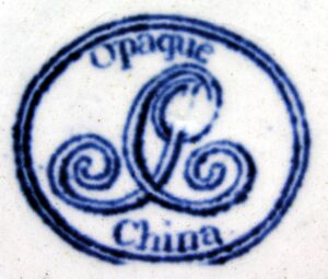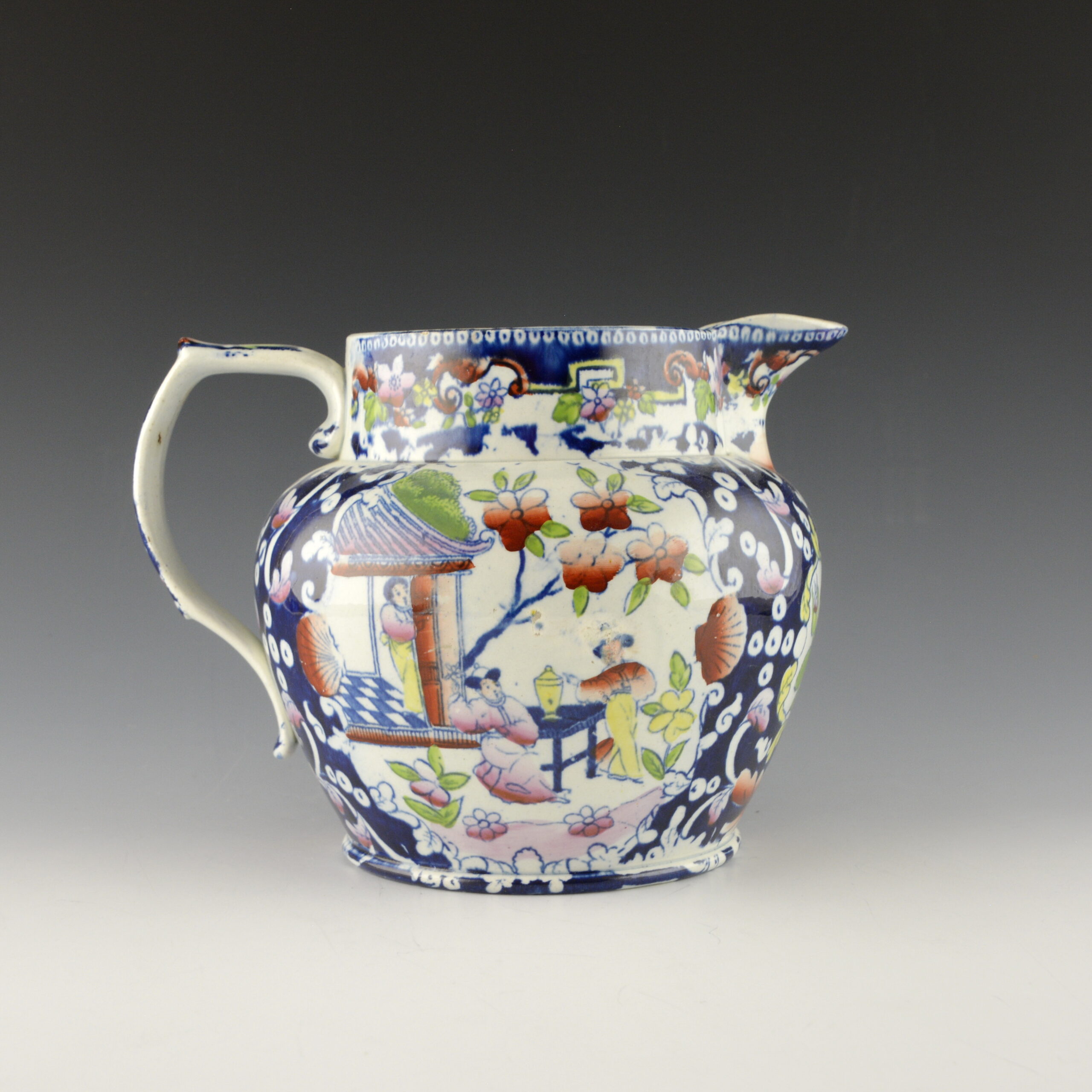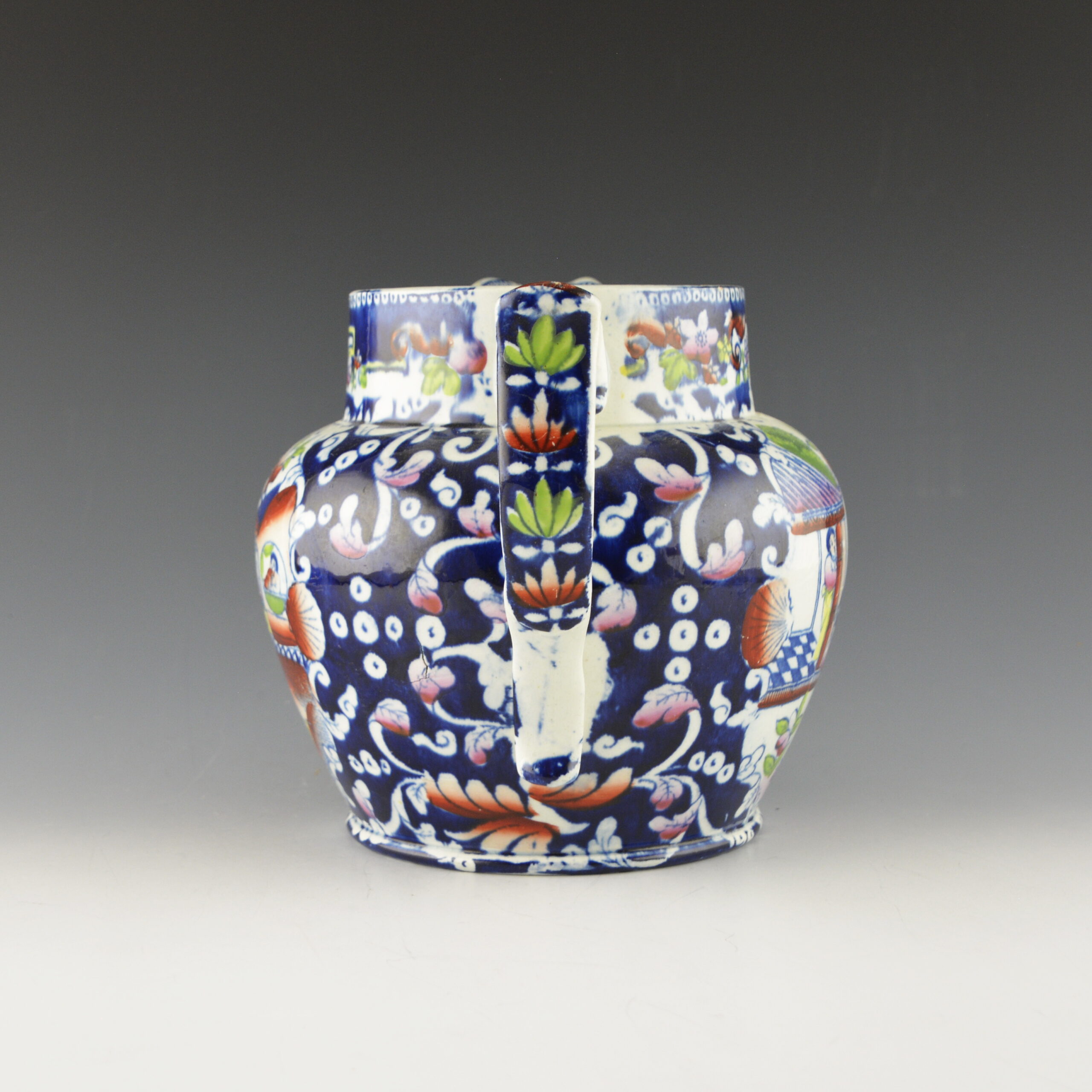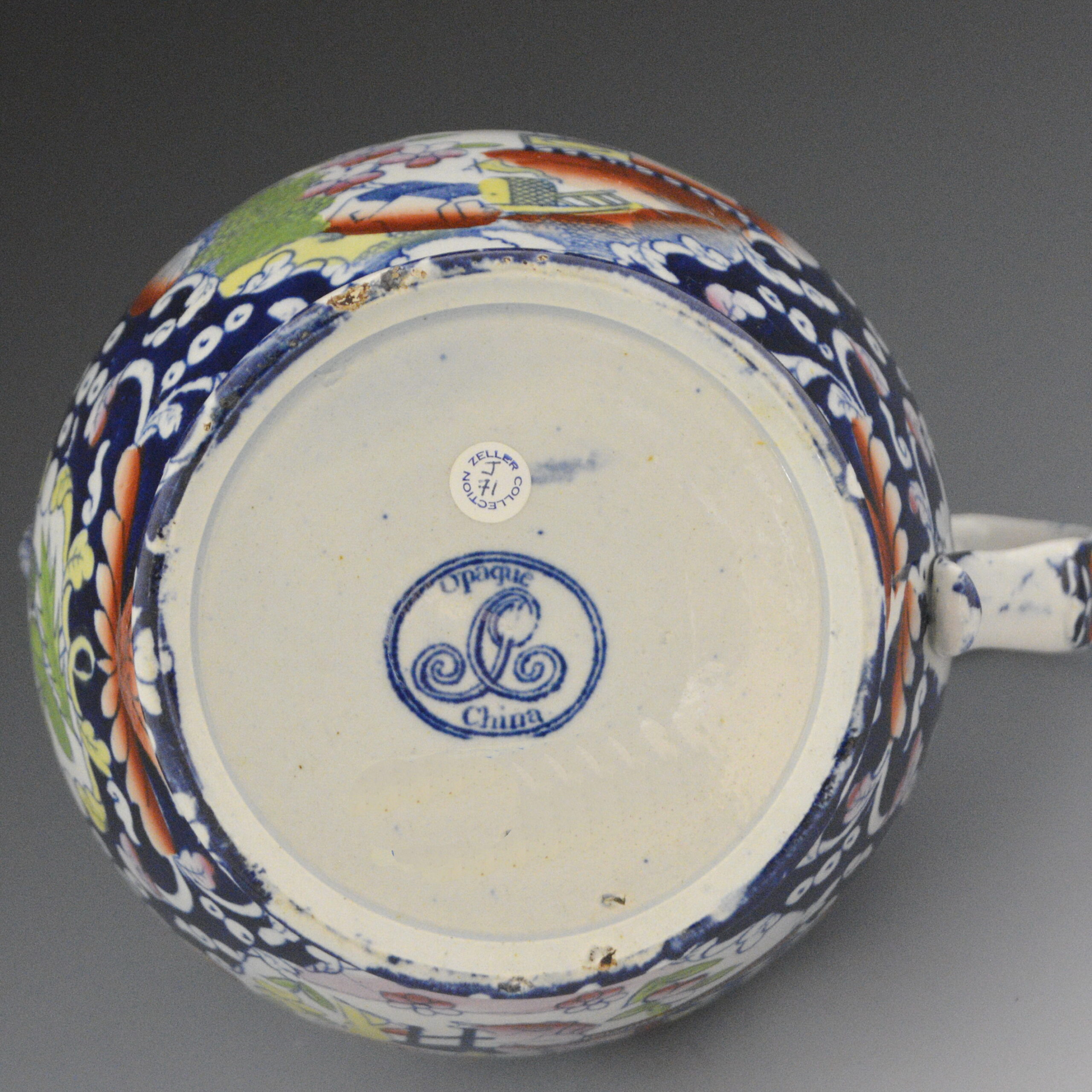 An earthenware jug printed in blue underglaze with a blue ground added. Overglaze clobbering in rust, yellow, green, and pink. A second garden scene is printed on the opposite side and in a cartouche under the spout are symbols of the British Empire: England, Scotland, Ireland and Wales. The “JC Opaque China” mark may be attributed to John Carey. c. 1823-1842.
