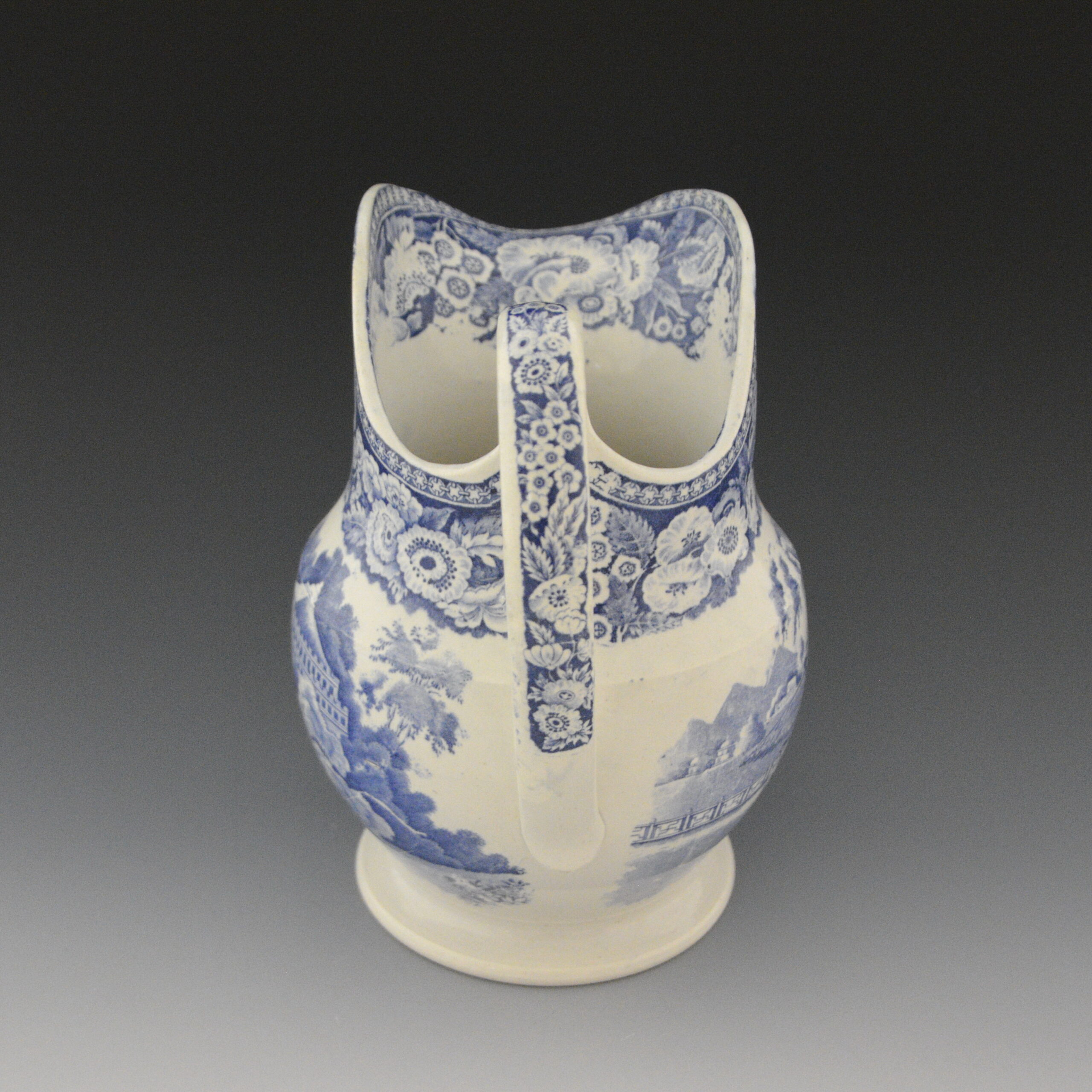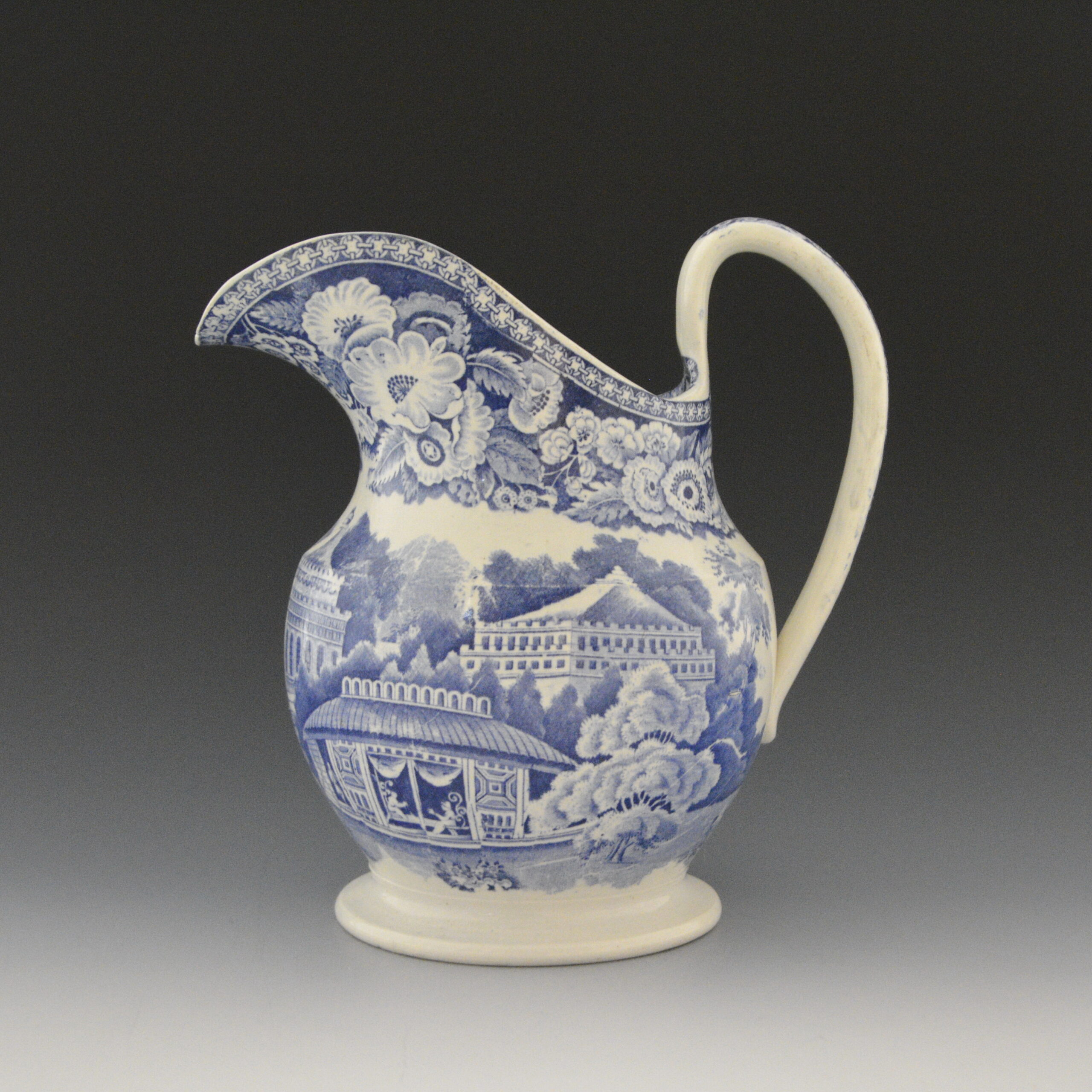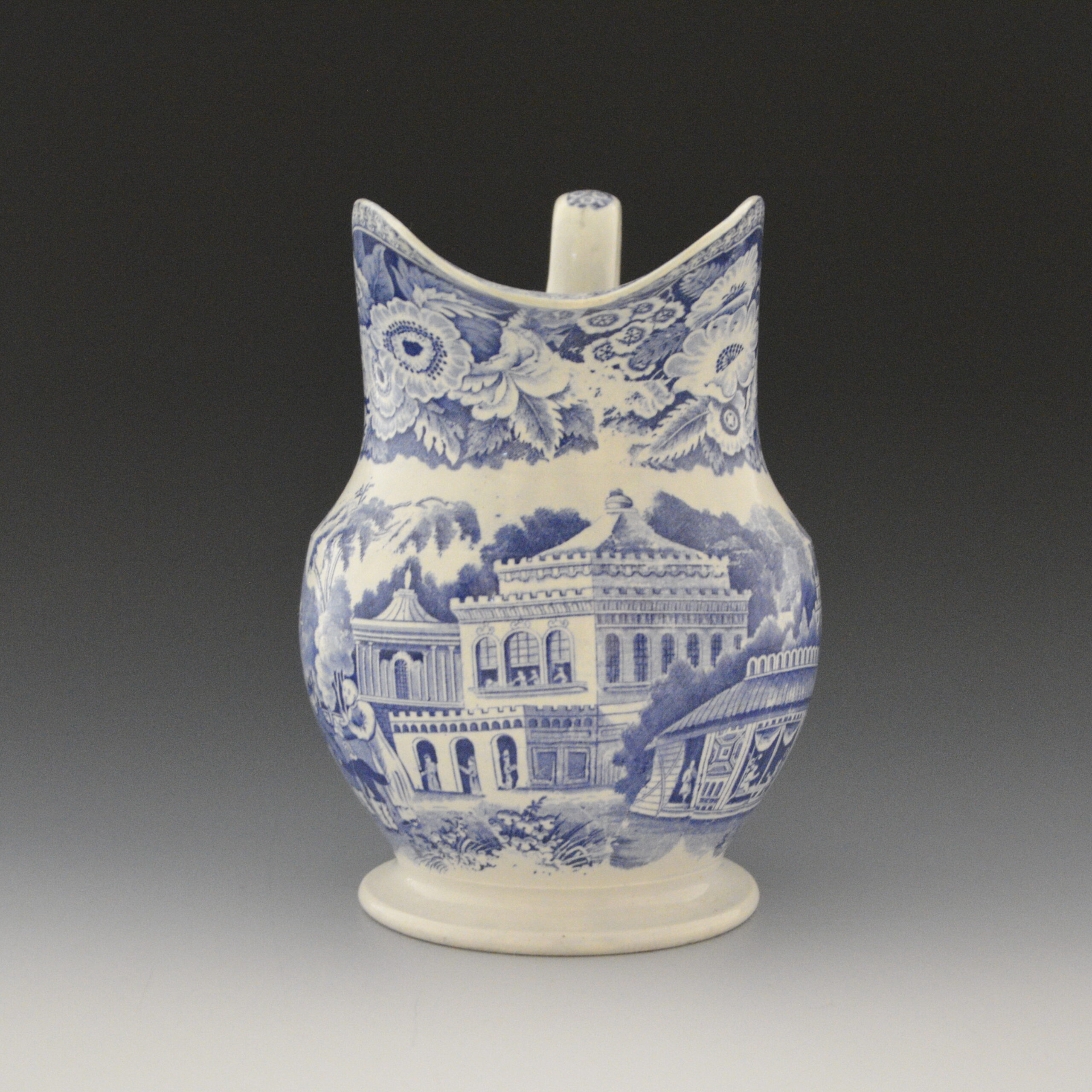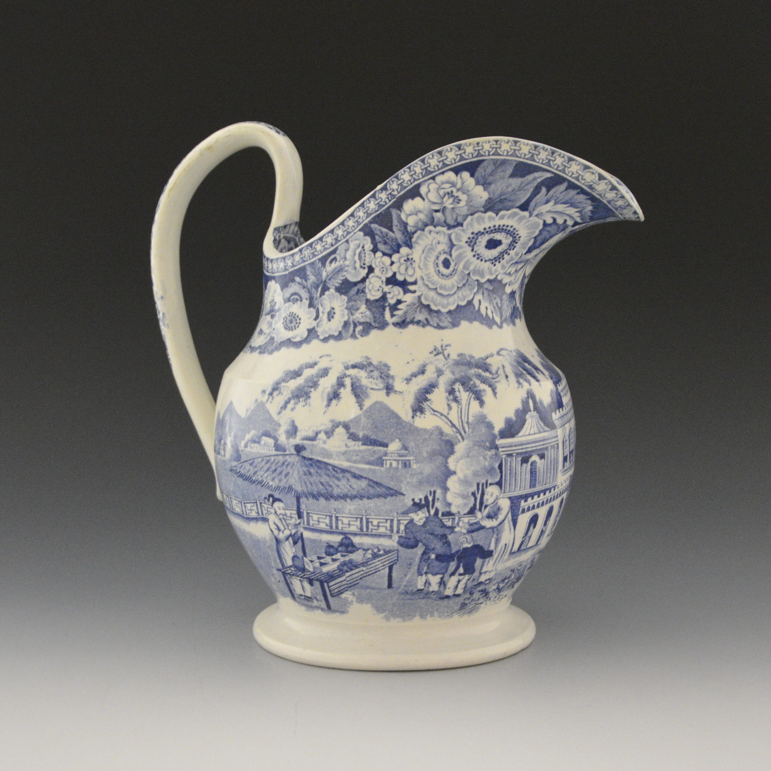 An earthenware ewer printed in blue underglaze with a variation of an earlier pattern known as Chinese Market Stall. Floral border. Footed base.