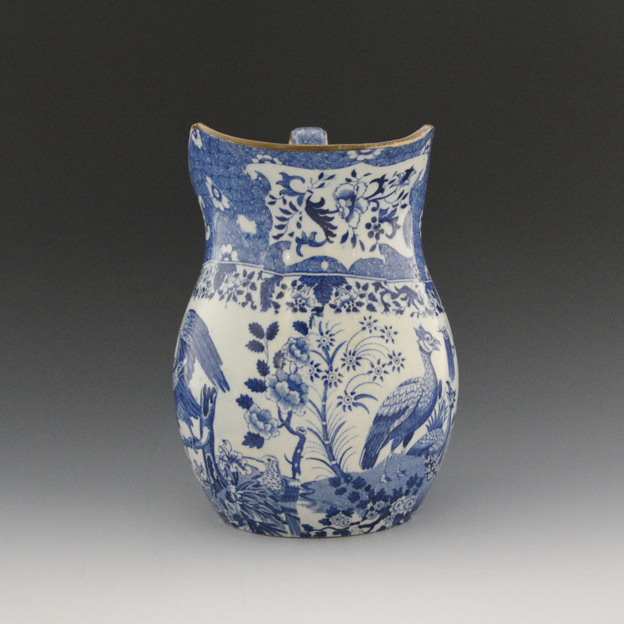 An earthenware ewer printed in blue underglaze with the Eagle pattern on one side and the Turkey pattern on the other. This pattern is part of an ornithological series of bird images that was made by more than one factory. The Turkey and Other Birds pattern is seen on the opposite side of this jug. The eagle is similar to eagles found on American historical items. The wide border consists of decorative floral cartouches on a circular geometric background below which is found a second intricate floral and botanical border. The rim of the jug and the handle is enameled in brown. While there is a blue printed circular mark on the base it can not be attributed to a particular maker, therefore, the maker is unknown.