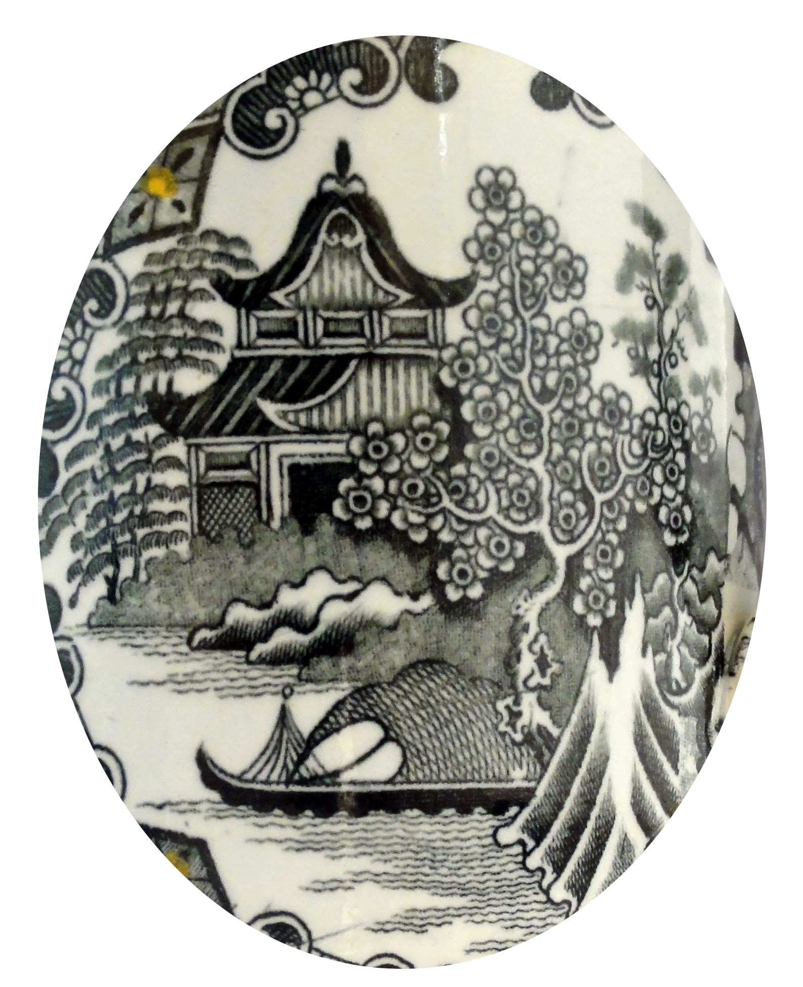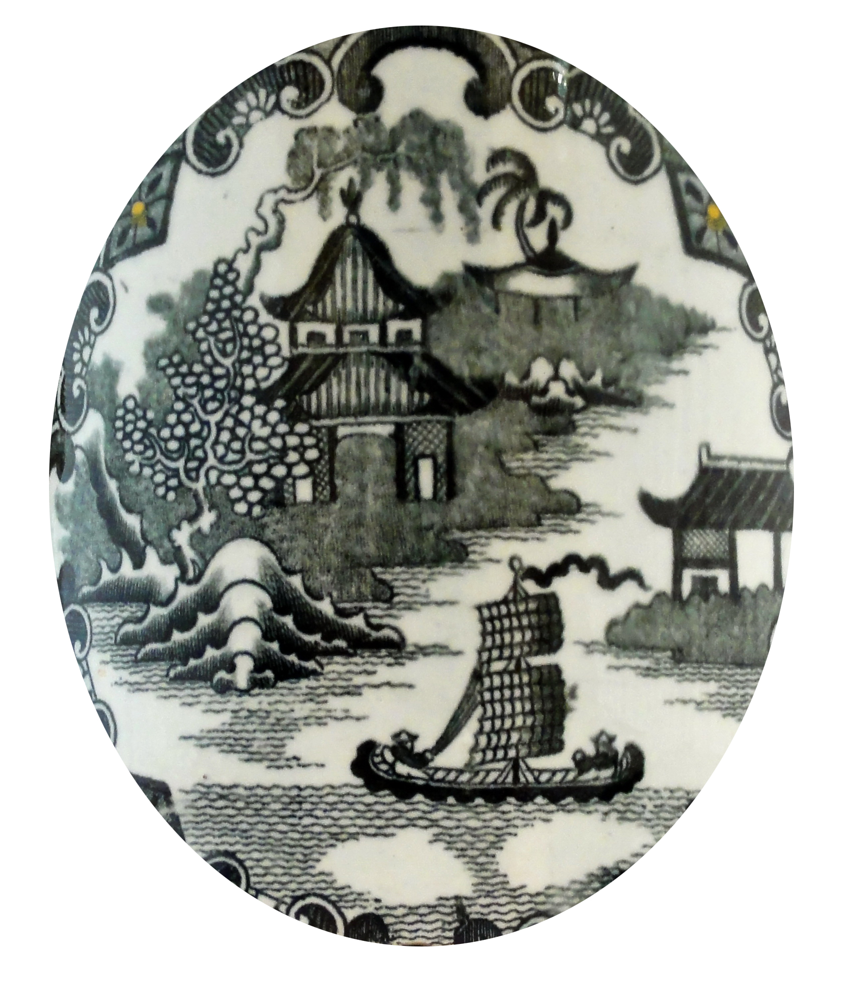 An earthenware cylindrical mug printed in black with colors painted in underglaze. Ocher enameling on the rim. This unusual transitional Chinoiserie design borrows much from the early Net Pattern, produced by Spode, Ridgway and Herculaneum. It copies two of the boat scenes, one on each side of the mug, as well as the elaborate floral pattern. The large floral and leaf medallion centered between the two boat scenes on the mug varies from the Net Pattern center medallion on the earliest pieces and the net design itself is not present on this mug’s pattern. However, this floral pattern is a perfect match to one found on the large foot bath jug by an unknown maker, also in this collection. The inner border consists of a delicate string of leaves overlaid on a traditional honeycomb pattern. The handle is printed with the same floral design. It is an interesting example that demonstrates how a transitional Chinoiserie pattern borrows from a late 18th century design.