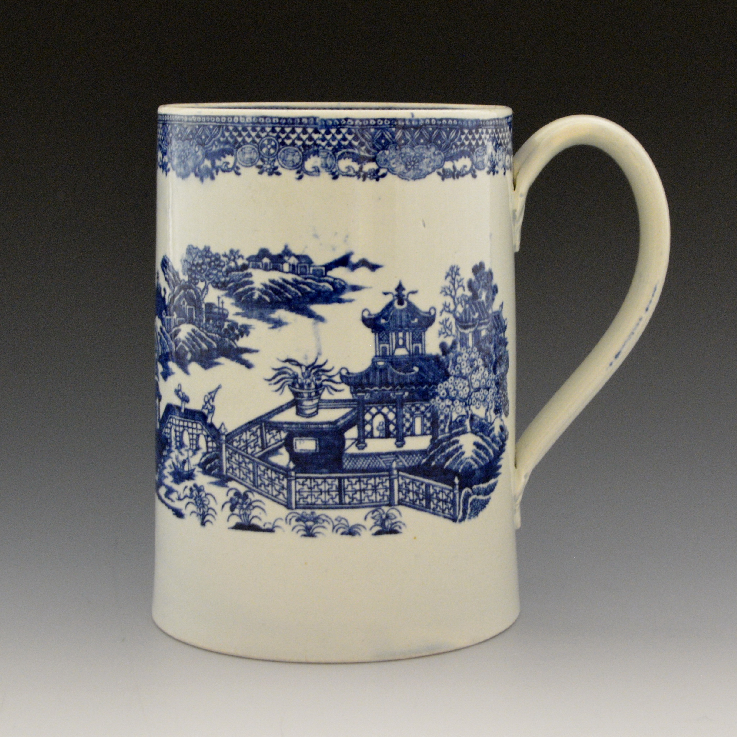 An earthenware tankard printed in blue underglaze with the Striped Temple pattern. The pattern is printed twice on the piece This pattern was inspired by an original Chinese porcelain design which was also the source for the Chinese Flag Bearer pattern. It was initially used by Caughley which gave it the pattern name as a result of the striped roofs on the pavilion. The same border consisting of geometric shapes and symbols is used on the interior and exterior. The terminals on the handle are hand molded. It is an early, line-engraved pattern.