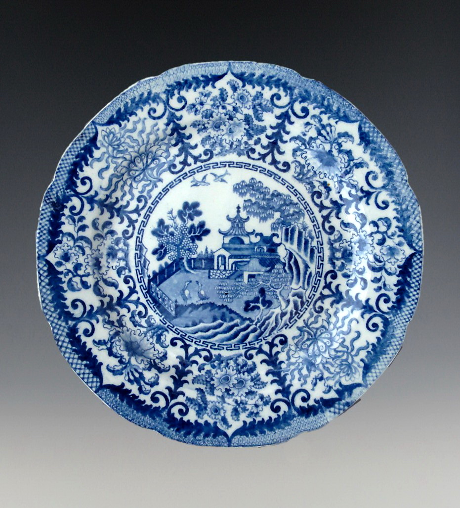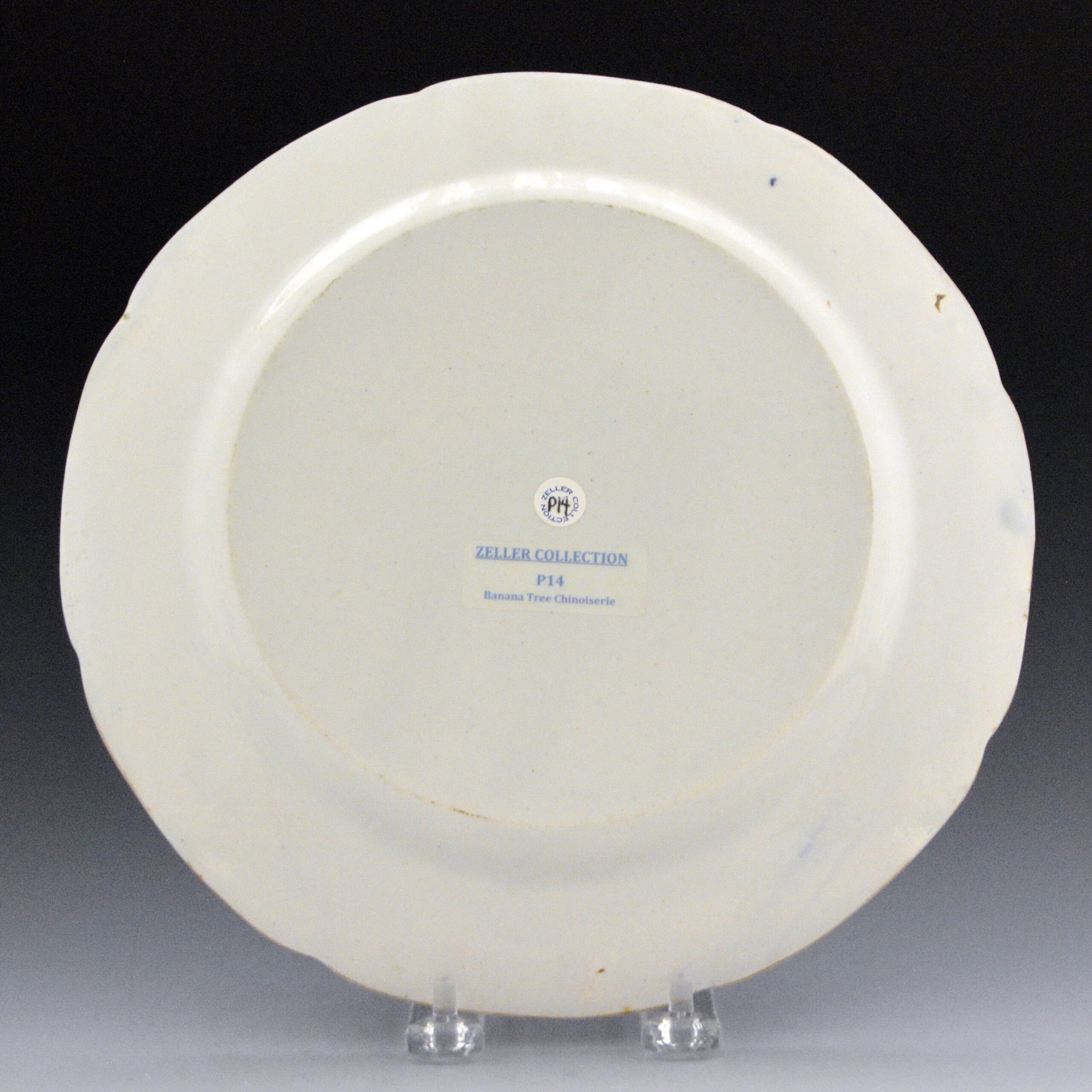 An earthenware dinner plate printed in blue underglaze with the Banana Tree Chinoiserie pattern. Octagonal shape.