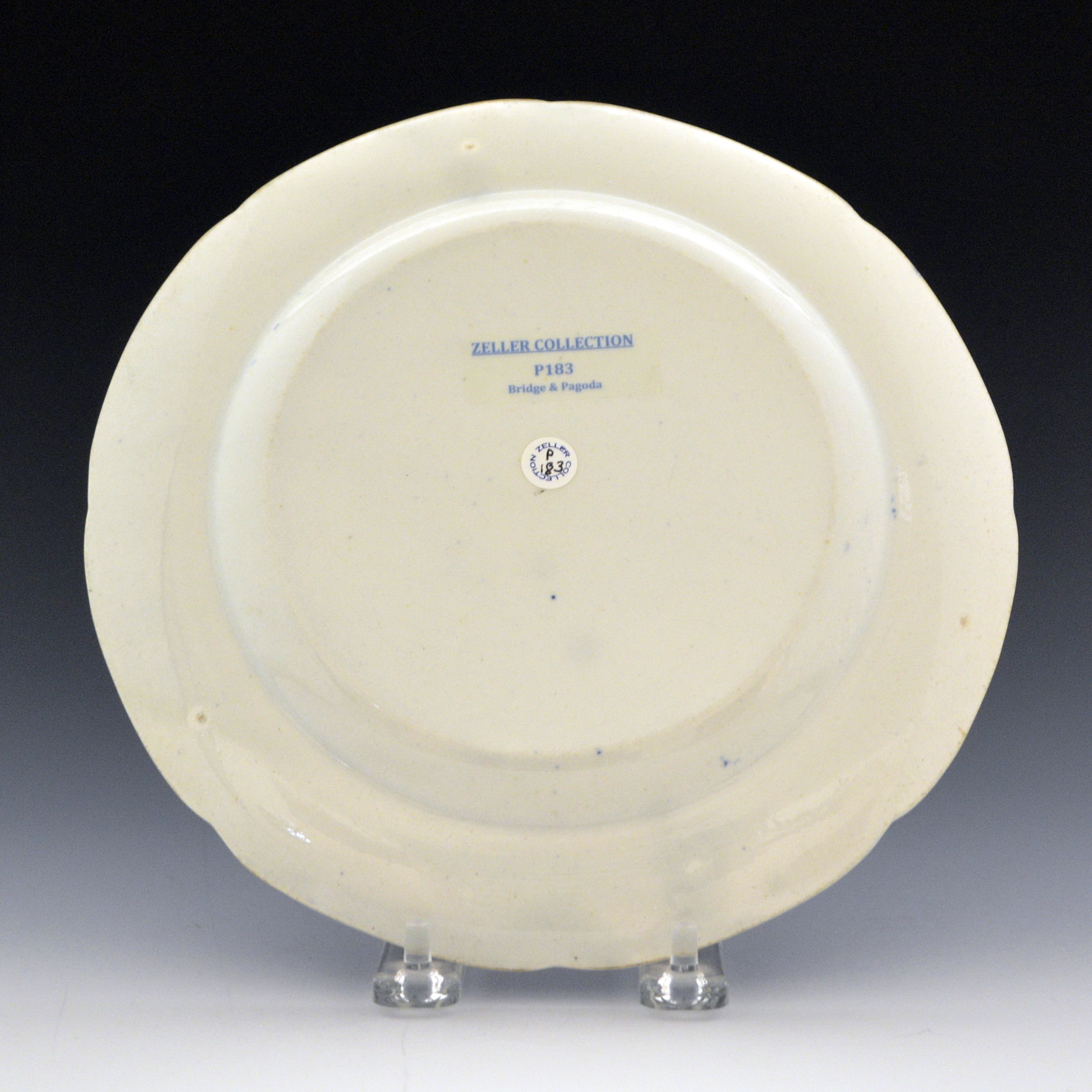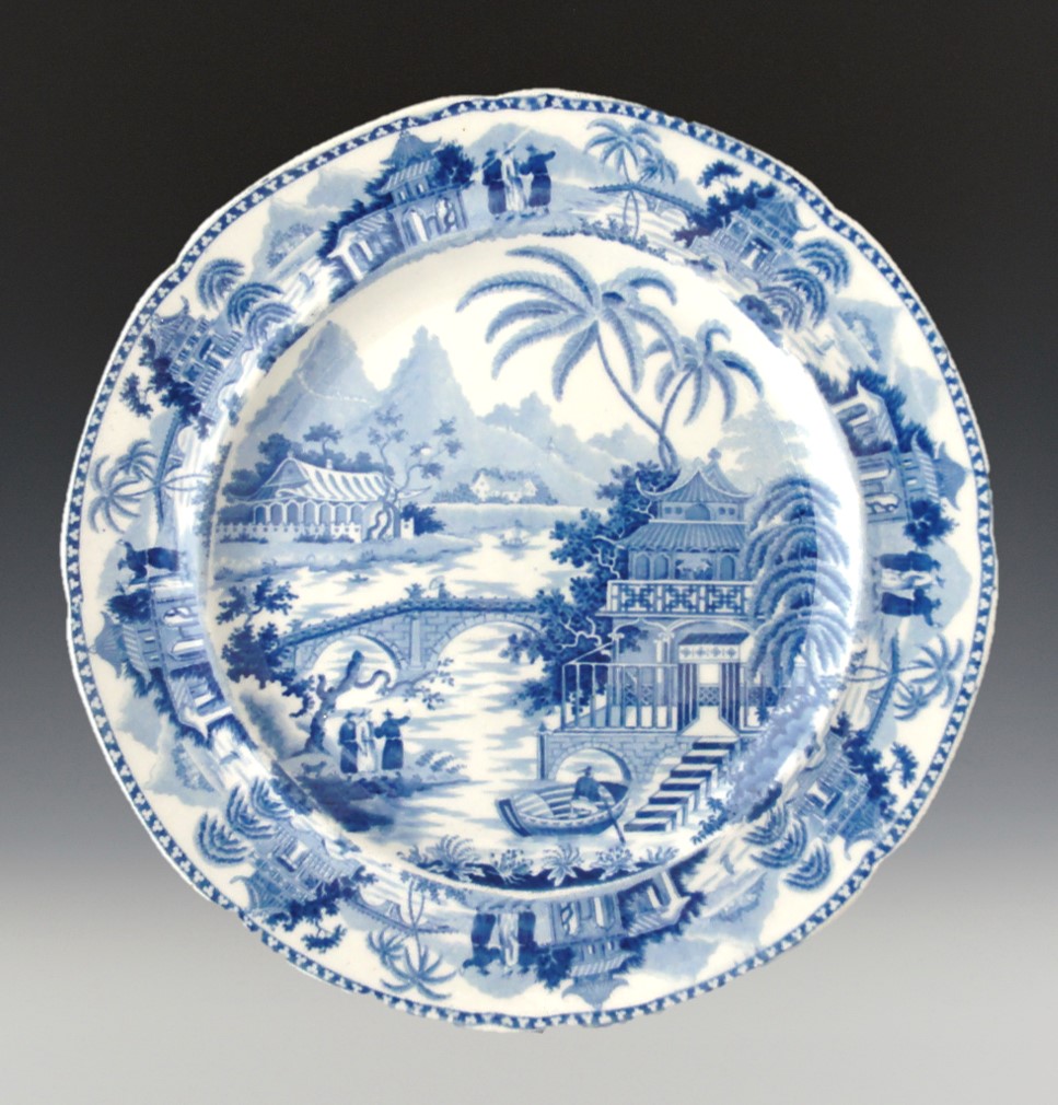 An earthenware dessert plate printed with the Bridge and Pagoda pattern. A man in a boat is approaching the steps leading up to the veranda in front of a large 3-storey pagoda. A long two arch bridge connects the side of the pagoda to the opposite bank of the river where 3 figures are standing. Two very tall palm trees behind the pagoda hold a place of prominence in the pattern.