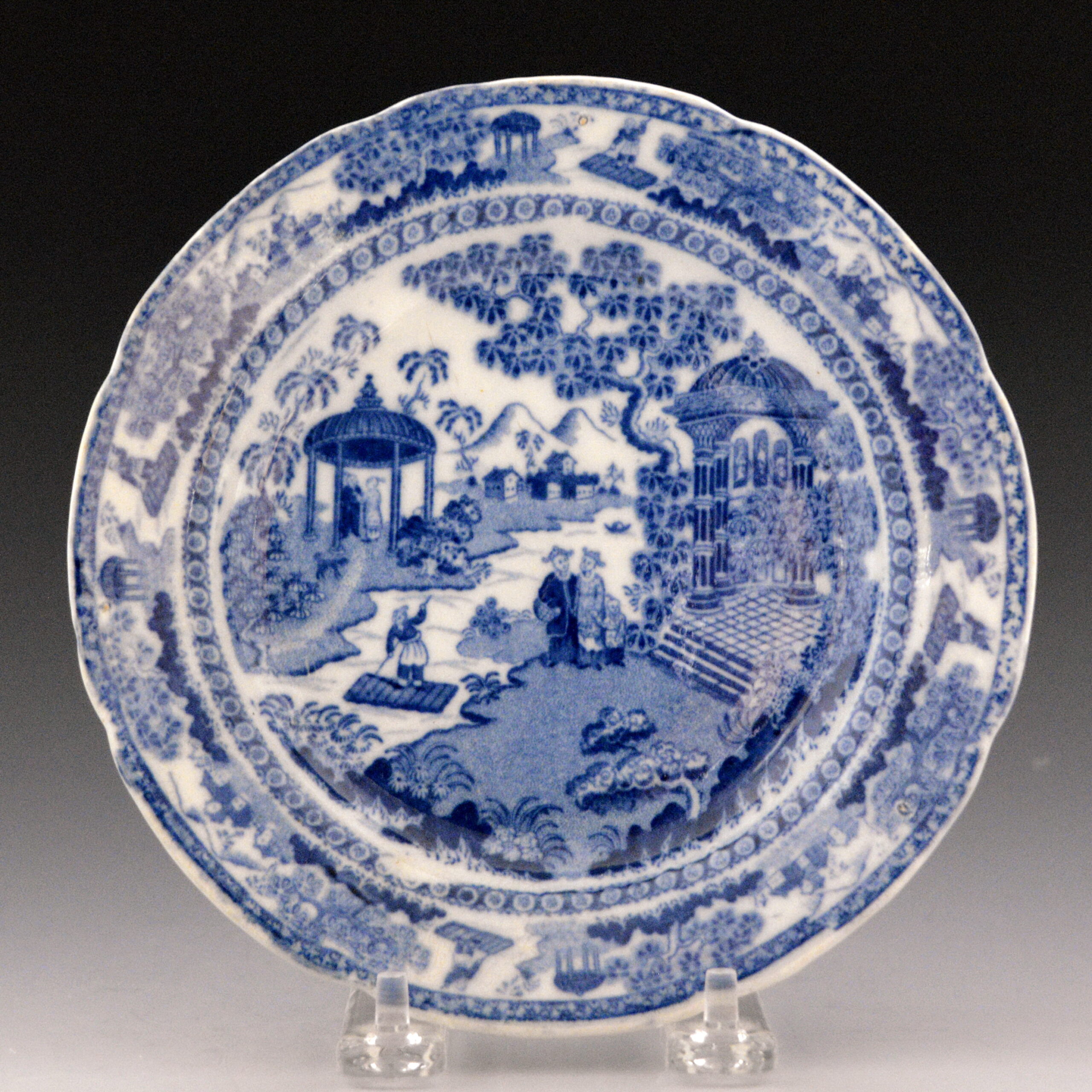 An earthenware plate printed in blue with the Chinese Raft pattern. Round shape. This Chinese scene, with the prominent feature being a boy on a raft, is a variation of Chinese Raft. In this version, the engraver chose to adorn most of the figures with hats. Additionally, the interior of the summer house is now decorated with three statues set in individual, arched niches and with paneling on the lower half of the interior. The border of the “Chinese Raft” pattern, which is framed with a very simple line and fish eye pattern, is replaced with two, more complex and stylized floral and fruit patterns. The outer pattern appears to consist of small rounded fruits with leaves and the inner is made up of a circular floral pattern.