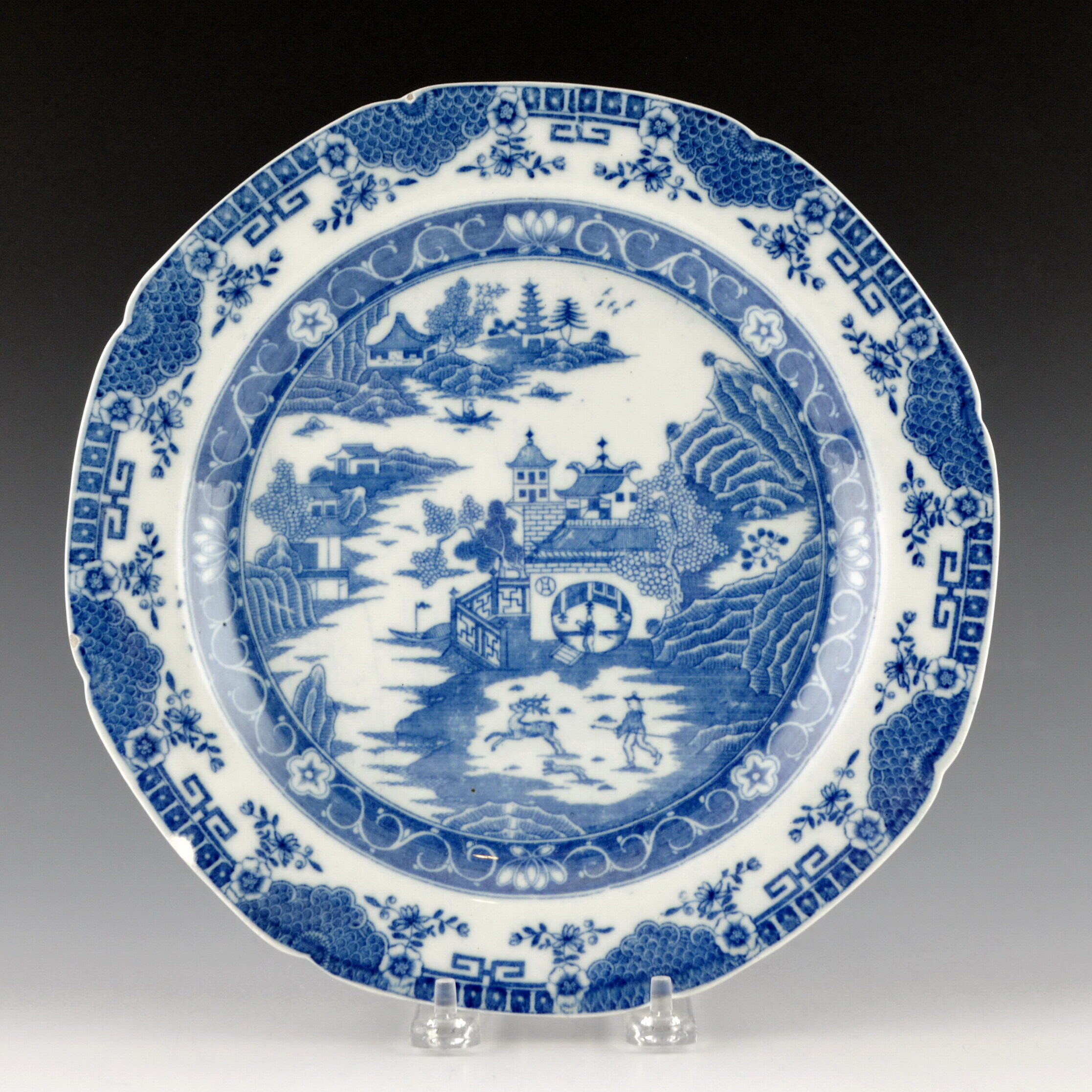 An early line engraved pattern on a dinner plate printed with the Chinese Stag Hunt pattern.