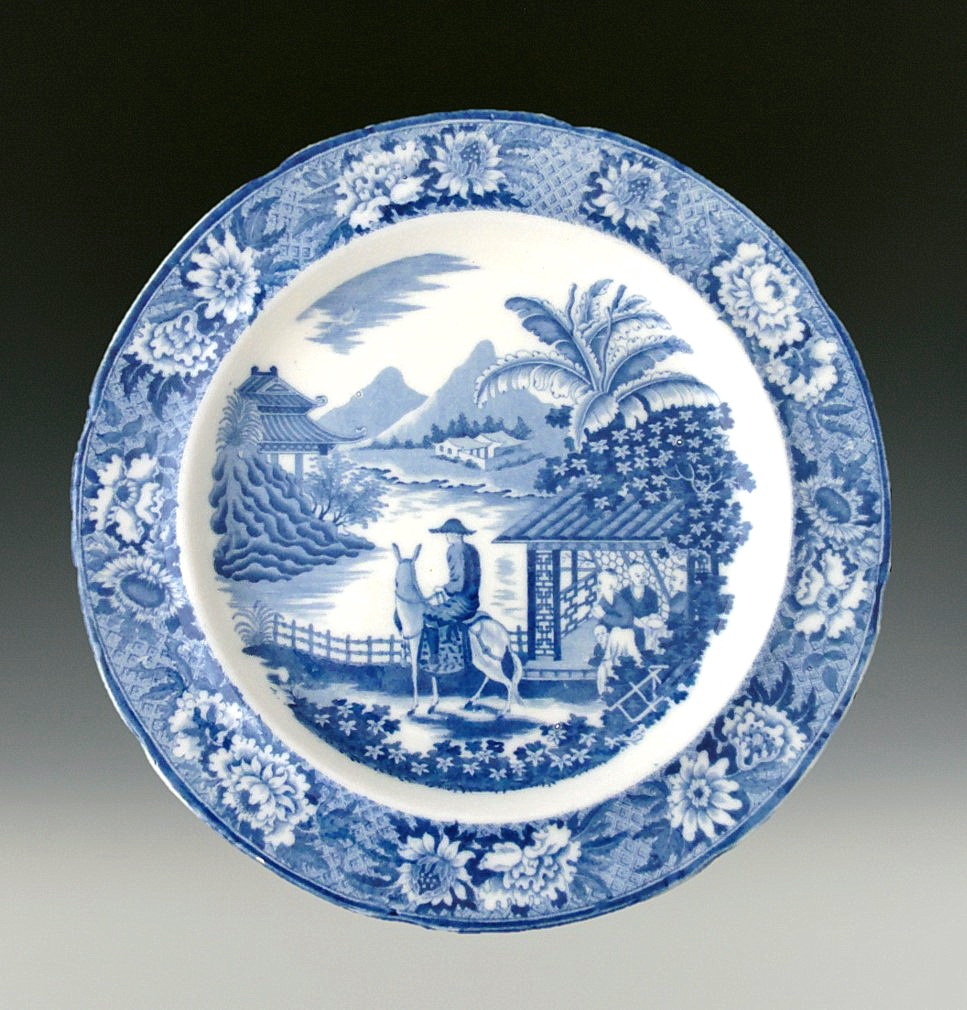 An earthenware plate printed in blue underglaze in the Departing Traveler pattern. This is a Chinoiserie pattern that is seen occasionally and recognized by many. In FOB Bulletin #100, p. 7 (Summer 1998), the pattern is illustrated, named, and discussed. “It is an oriental scene with a traveler leaving an inn and wending his way into the unknown. Four faces watch him go, apprehensive for his safety. The long ears of his mule set against the water beyond seem to emphasize the loneliness of this intrepid traveler. Where will they be tonight?”