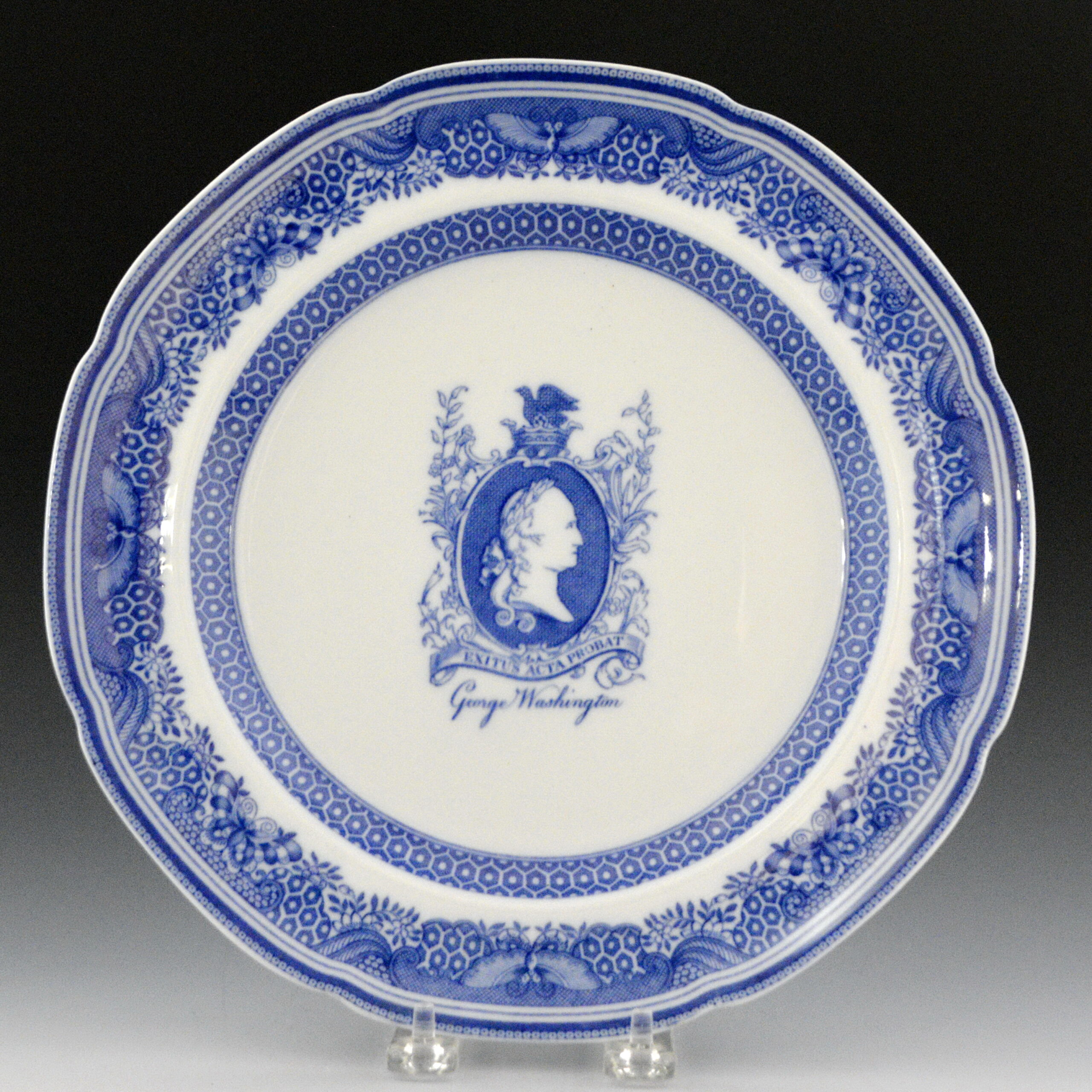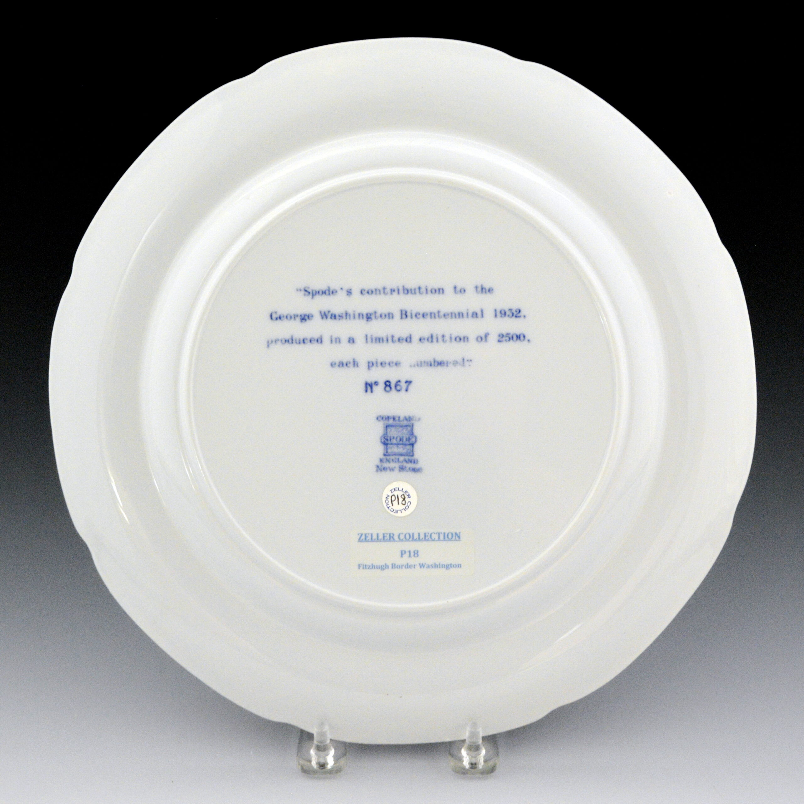 An earthenware dinner plate printed with the Fitzhugh border pattern.  This Spode plate was made for the George Washington Bicentennial in 1932. One of a limited edition of 2500. See the inscription on the back.