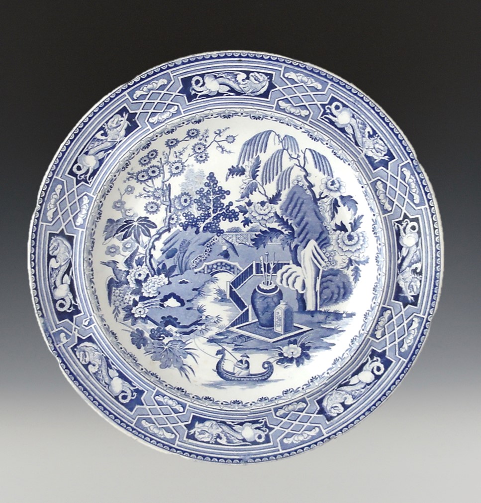 A slightly indented earthenware dinner plate printed in medium blue underglaze in the Jar and Fisherman pattern. The border consists of a series of cartouches that feature a mythological winged dragon figure set in a very formal linear pattern of crisis-cross lines and floral scrolls. The plate has been attributed by some to Hartley Greens & Co., Leeds.
