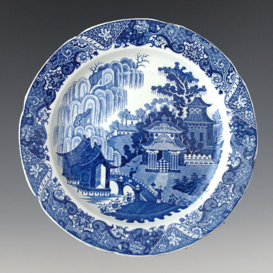 An earthenware plate printed with the Ornate Pagodas pattern. Unmarked, but may be attributed to Richard Woolley, Longton, Staffordshire. See a 19-inch well and tree meat dish with Woolley impressed mark also in this collection. Pattern contains three ornately decorated pagodas with C-scrolls and other western motifs. This pattern is also attributed to Taylor, Harrison & Co., Castleford and a documented Herculaneum Pottery version is also known.