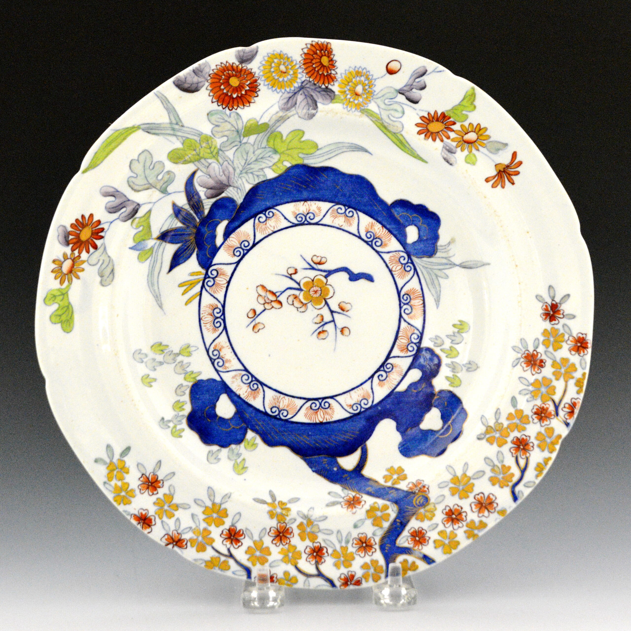 An octagonal indented stone china dinner plate printed in blue and colored in underglaze with additional colors.  Overglaze enameling and gilding.  It is an interesting pattern with dark blue ribbon-like motifs combined with a branch design beginning at the edge of the plate all of which surrounds and extends from the narrow inner border that surrounds a small floral spray. The outer border has several sizes of flowers with the smaller ones to one side. These floral groups are interrupted by the dark blue ribbon and long green leaves.