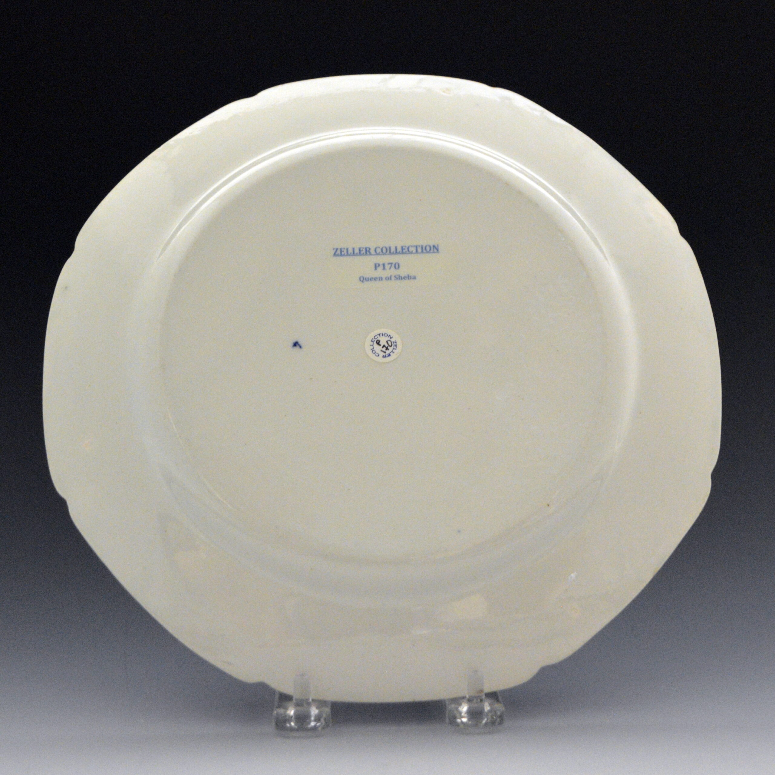 An indented earthenware dinner plate printed in blue underglaze in the Queen of Sheba pattern. The pattern is a strange amalgam of Chinoiserie, Gothic and classical elements. Attributed to Minton by Geoffrey Priestman