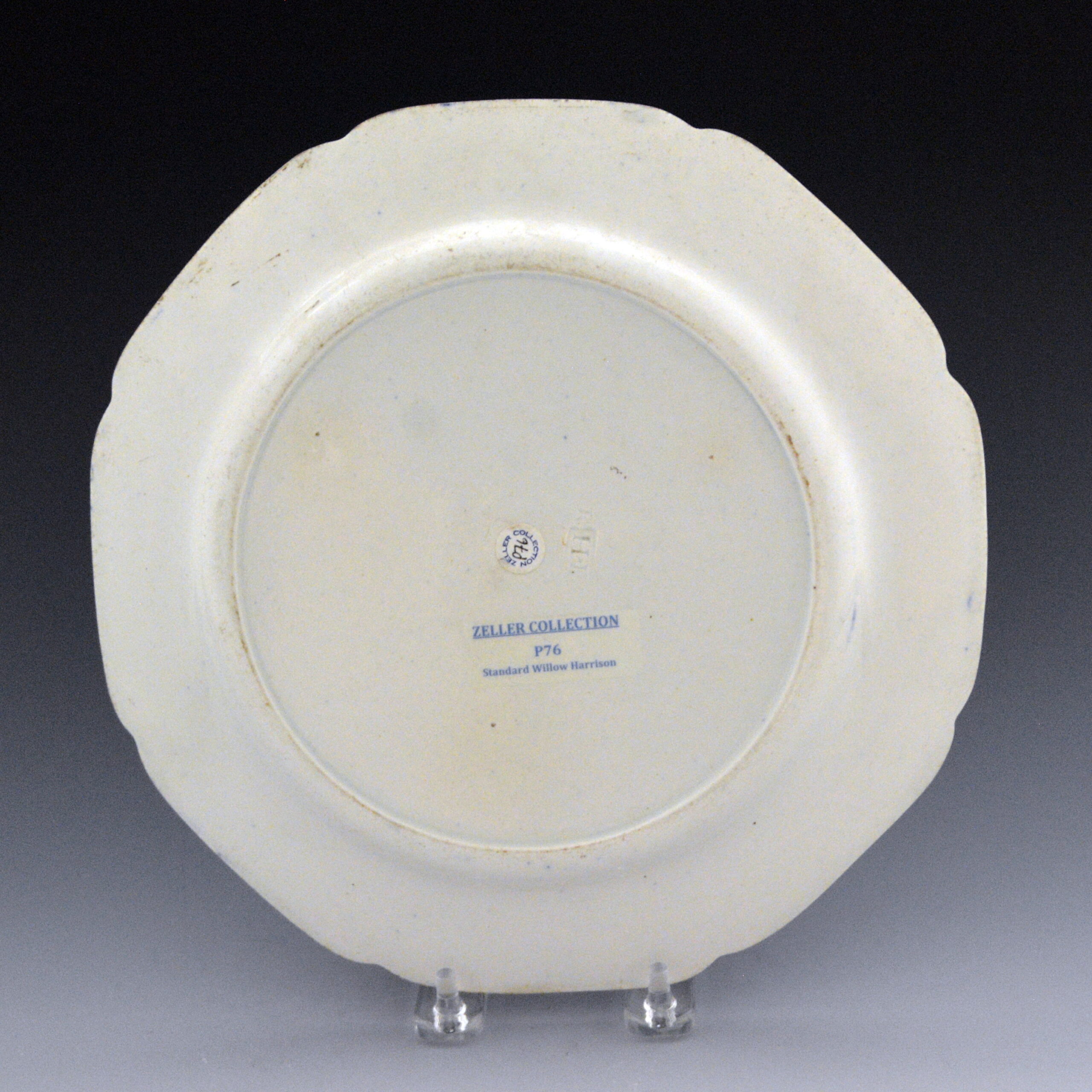 An early indented earthenware dinner plate printed with the Standard Willow pattern. Octagonal shape. It is another fine example of a Willow pattern plate with an early 19th century impressed mark.