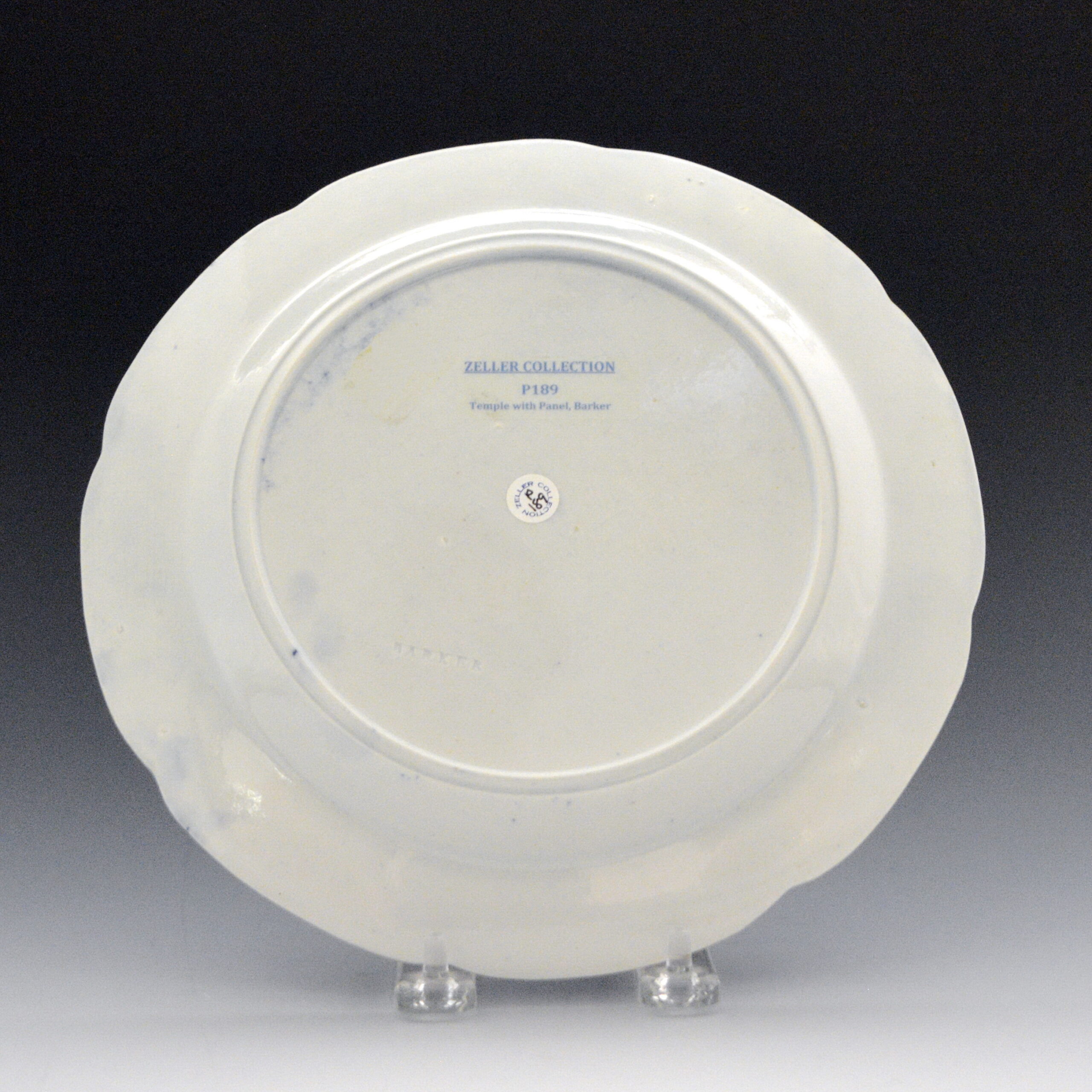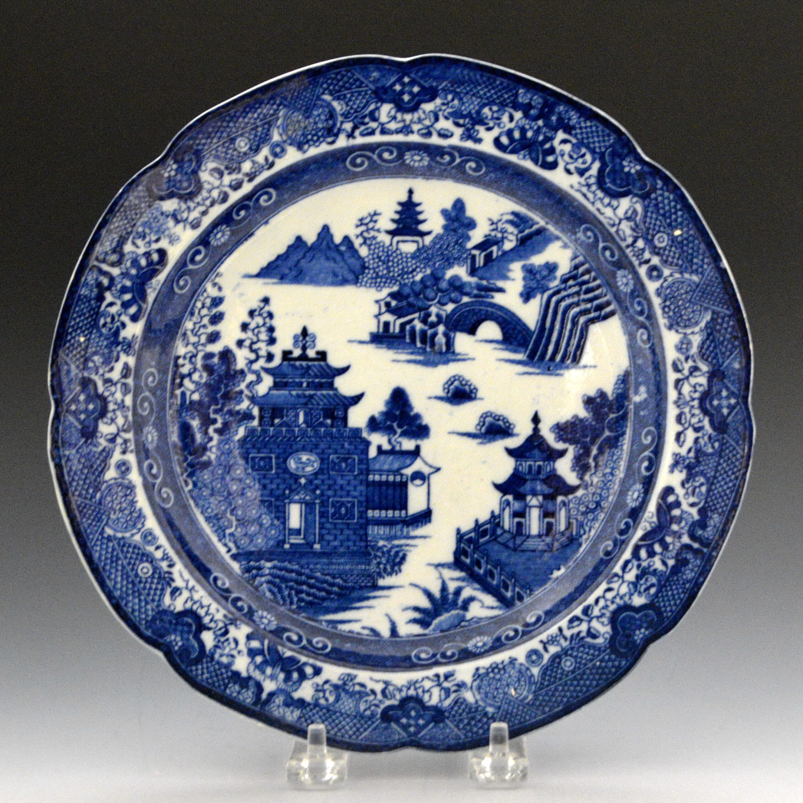 This earthenware plate was printed with a line-engraved pattern known as “Temple with Panel”. It varies somewhat from the pattern as it appears with IH impressed mark noted in the references below. One marked difference is the space given to the butterflies in the border by IH. The pattern has also been called “Palladian Pagoda”,