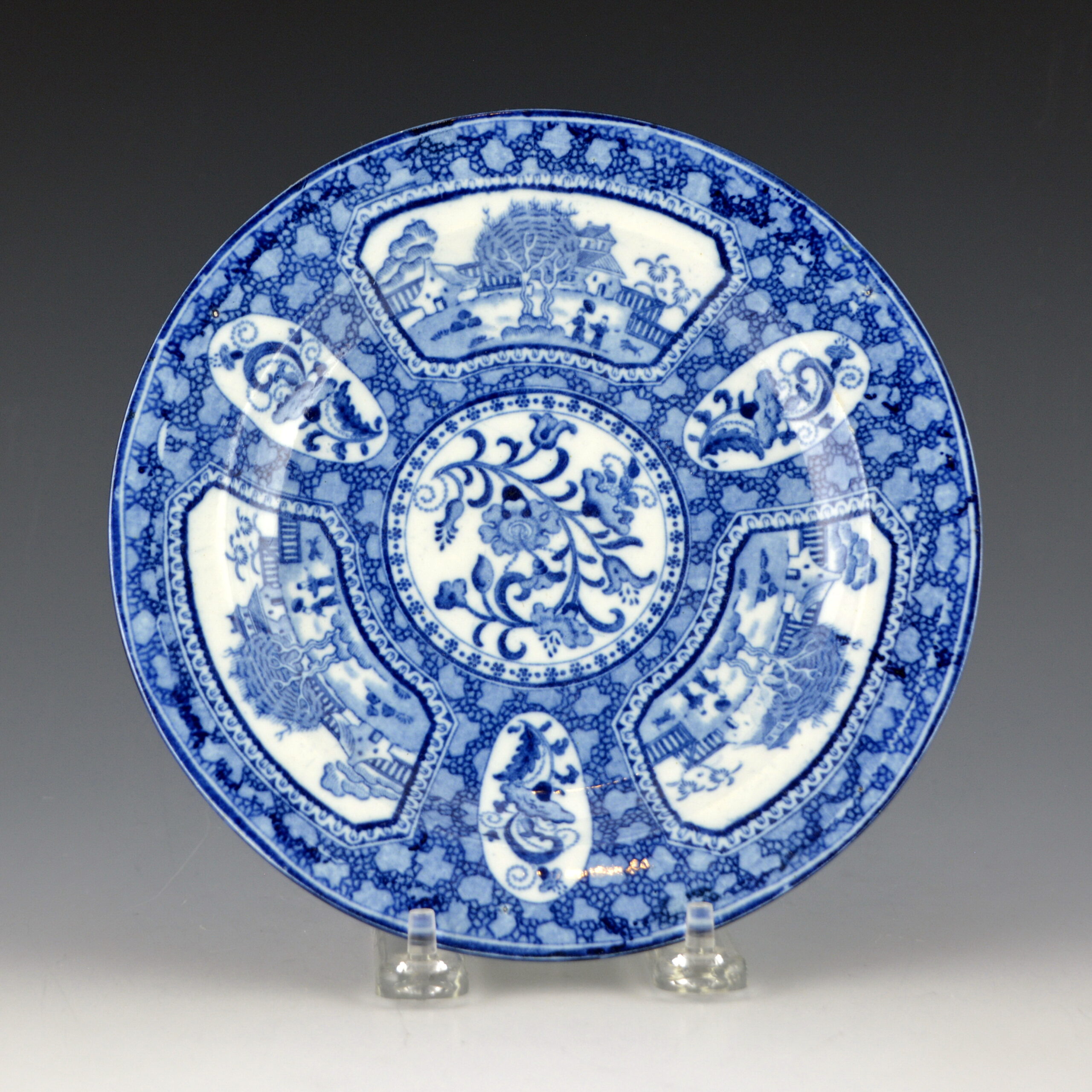 An earthenware dessert plate printed with a pattern found on tea and coffee wares. The pattern is repeated three times in a circular fashion around the plate. Alternating scroll and floral oval motifs complete the outer circular design. In the center is a circular floral spray design. The pattern consists of two small Chinese figures, one with an umbrella, a small dog, trees and buildings. All of these design elements are framed by an overall chintz-like pattern. Another example of this pattern can be found on a large coffee pot in this collection, see item C15.