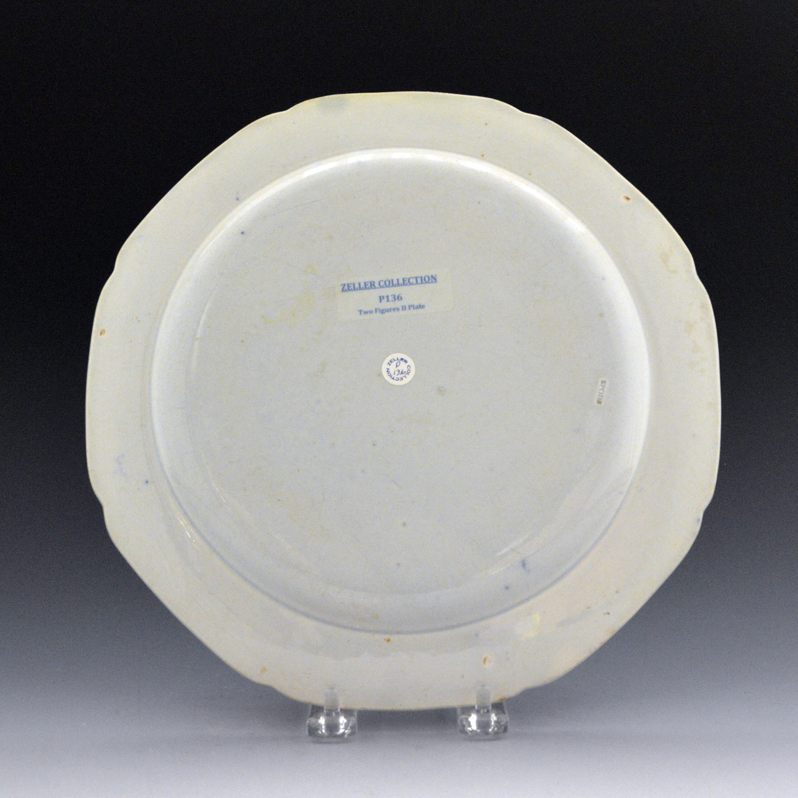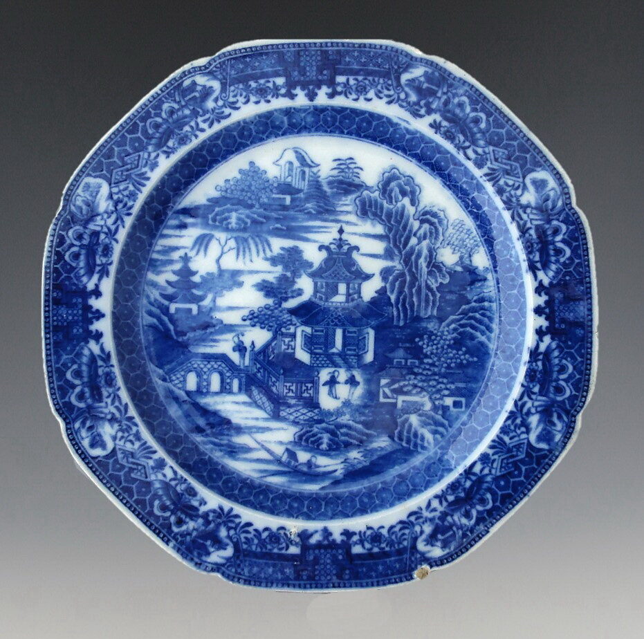 An octagonal indented earthenware dinner plate printed in blue with the Two Figures II pattern. An earlier form of Two Figures was produced by unknown potters; however the only marked examples are by Spode and known as Two Figures I. The 2 figures in that pattern appear to be moving from right to left whereas they are facing each other in this pattern. This plate represents the ‘standard’ version of Two Figures II. The border on this plate is actually the border most often found on Full Nankin pattern by Caughley and others.