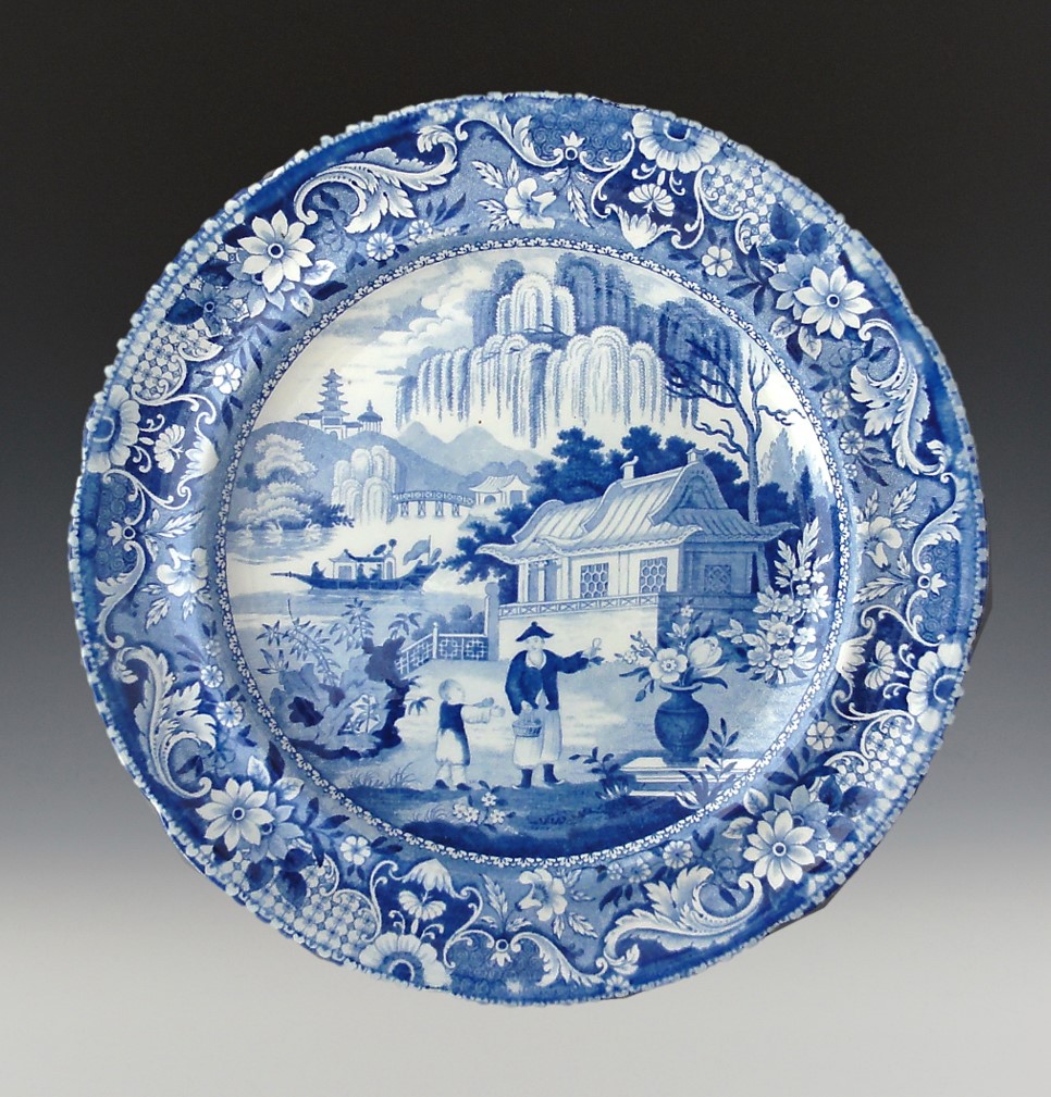 An indented earthenware dinner plate printed in blue underglaze in the Gardener pattern. An example marked E. Wood is known, but this example is unmarked.