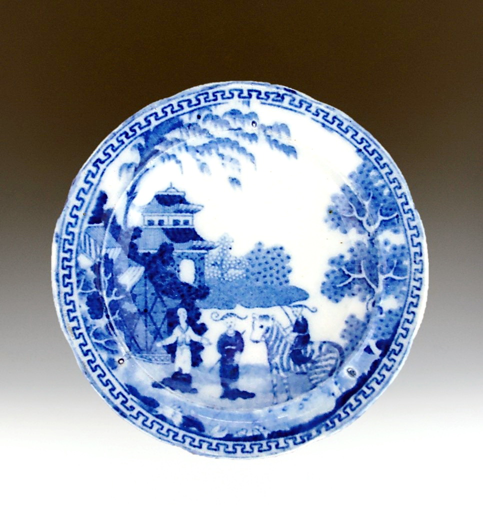A small round earthenware toy plate printed in blue underglaze in the Zebra pattern. Only the exterior geometric shaped border design was used. Possible attribution to Rogers.
