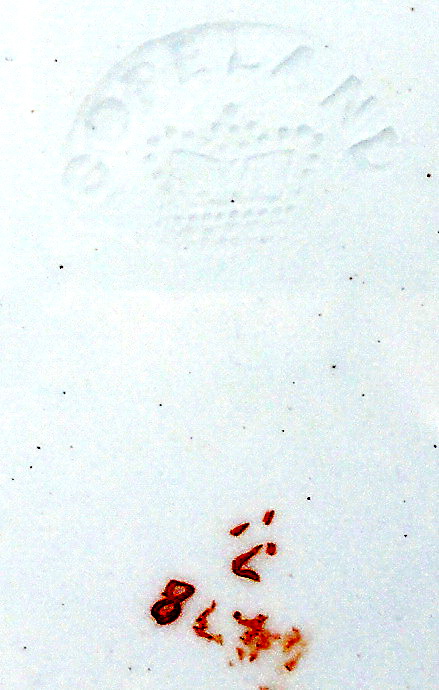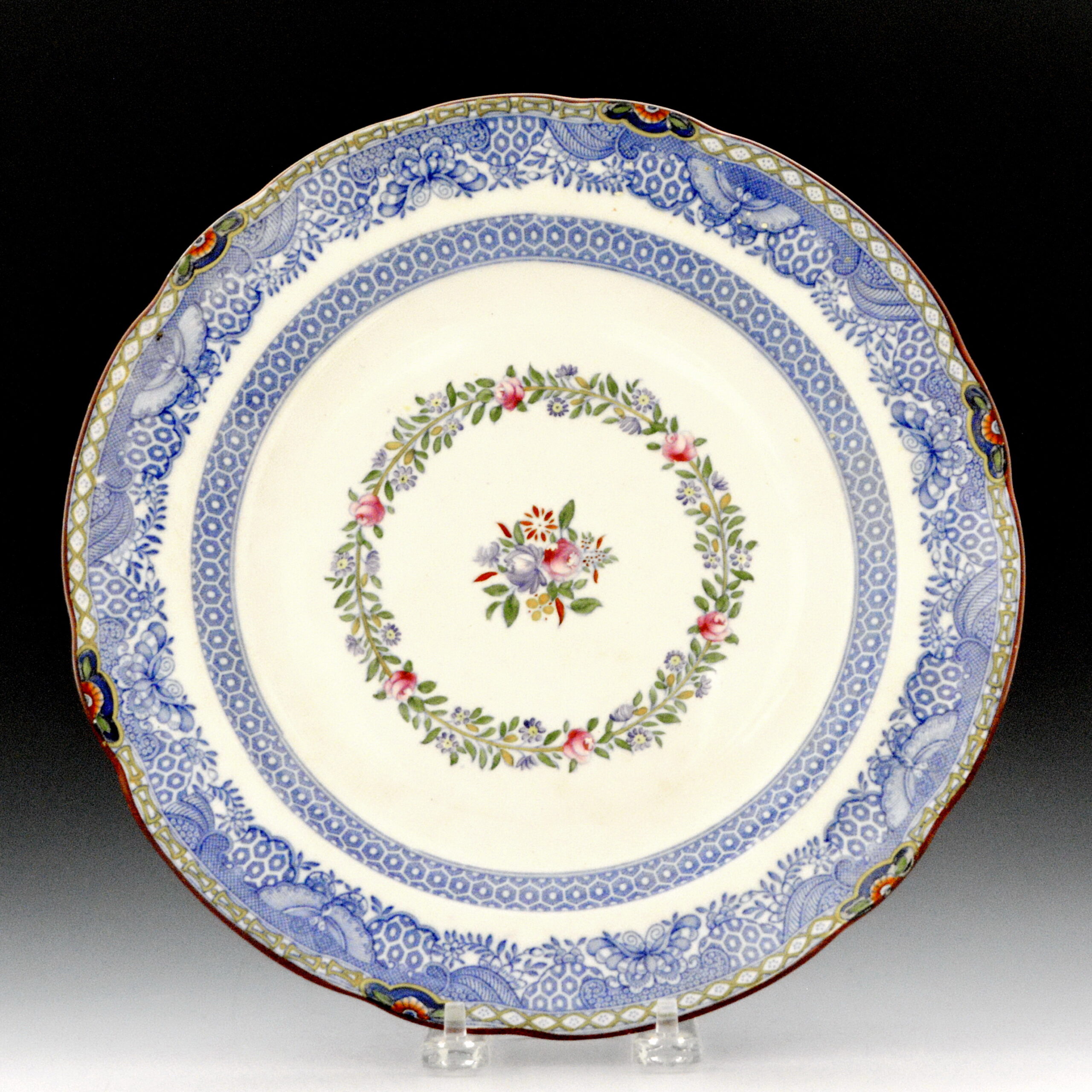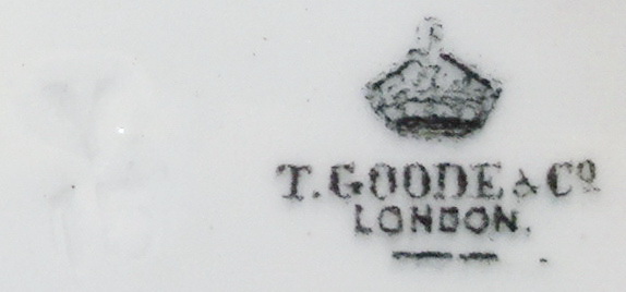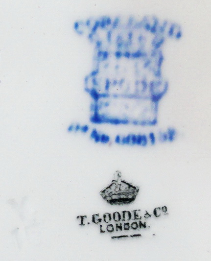 Six earthenware dinner plates in medium blue printed with a circular floral pattern, pattern 2/6787, with “New Bridge” border pattern. Overglaze enameling in several colors with brown enameling on rims. Round shape, Impressed dates are U 14, T 15, Y 15, A 16, and U 23 (one has no date mark). Printed Copeland mark 256, “occurs on earthenwares from 1890 onwards.” Printed mark includes a registration number: 608158. Also impressed Copeland Crown mark, Copeland mark 207. Three plates have pattern no. 2/6479, two plates have 2/6478, and one has no pattern number. Two plates also have a blue printed “T. Goode & Co./ London” mark. Two plates have the same retailer’s mark printed in black.