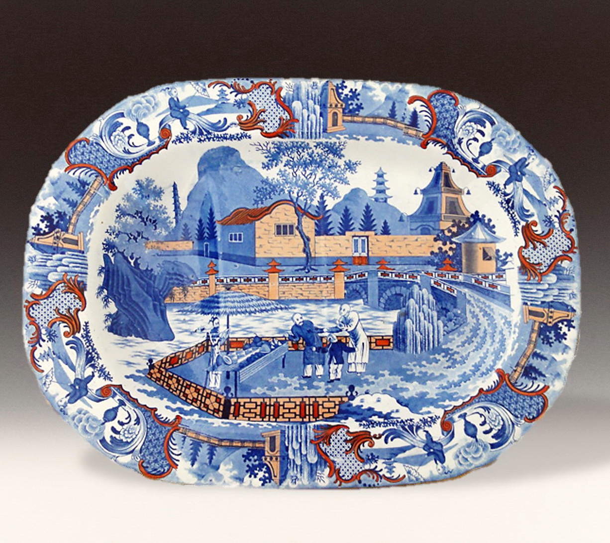 An outstanding earthenware well and tree meat dish printed in blue underglaze with the Chinese Market Stall pattern with overglaze enameling in two colors and yellow enameling on the edge. The added coloring is most unusual on a pattern of this type. Rectangular shape. This is a pseudo Chinese pattern showing figures at a market stall. The border is of strip form including rococo motifs. Examples are known both with and without the name ‘Wear Sc.’ at the end of a fence in the design. See P191, a soup plate in this pattern with the Wear mark added. This pattern is very similar in both style and layout to the Chinese Traders pattern by Stevenson which is also known with the Wear signature (also included in this collection ).