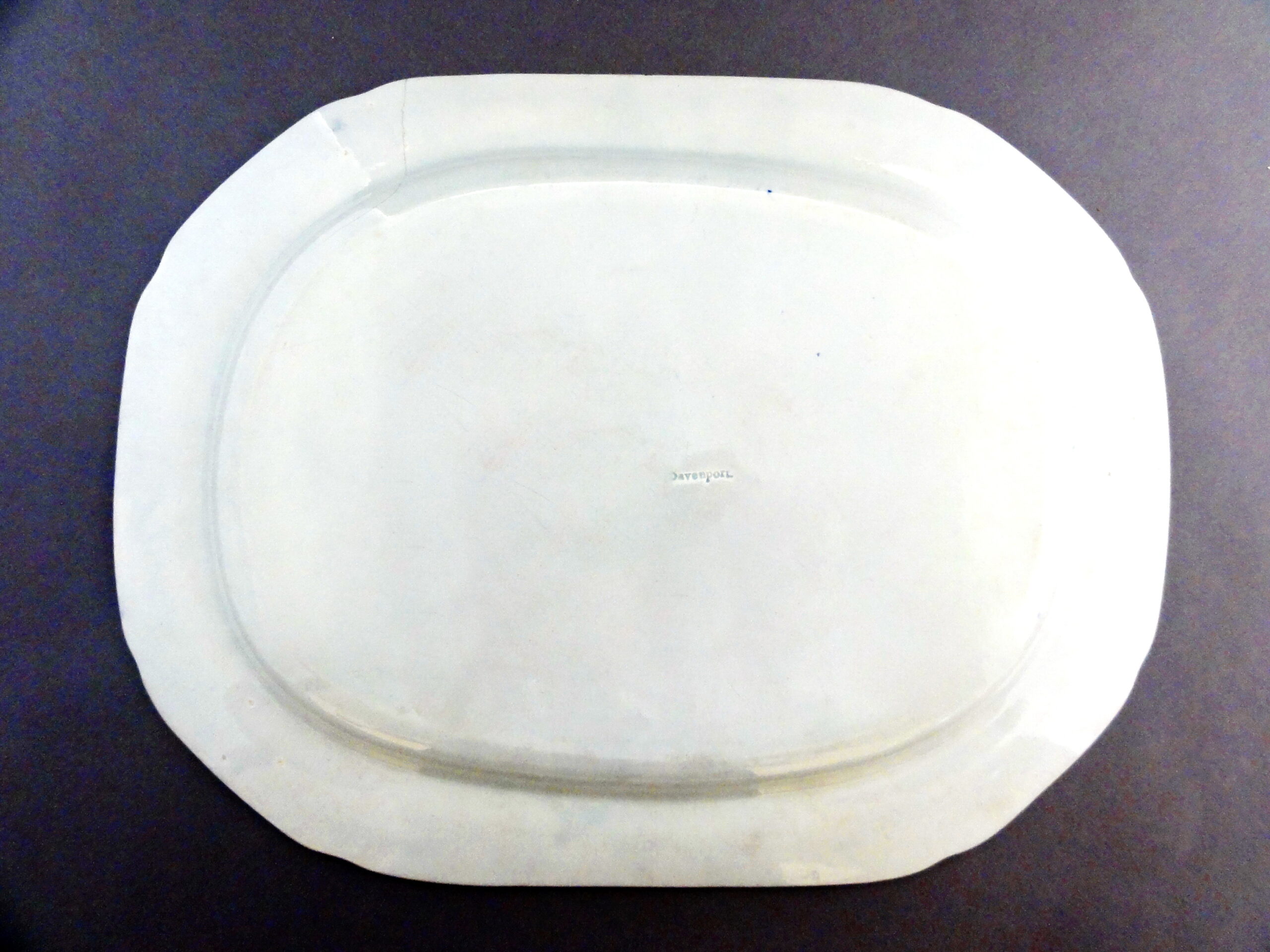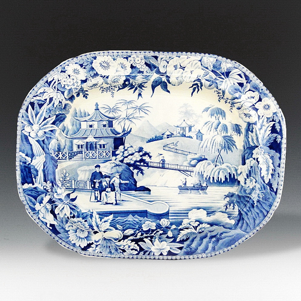 An earthenware platter printed in blue underglaze with the Chinoiserie High Bridge pattern. Michael Sack is credited with identifying the source prints for this pattern. The two left-most figures come from the source print titled “View of the Suburbs of a Chinese City”. The boat in the center comes from “Chinese Barges of the Embassy Preparing to Pass under a Bridge” from the same book: “An Authentic Account of an Embassy from the King of England to the Emperor of China: (with engravings by William Alexander) “, by Staunton, Sir George Leonard. See P200 for a marked plate in this same pattern in this collection.