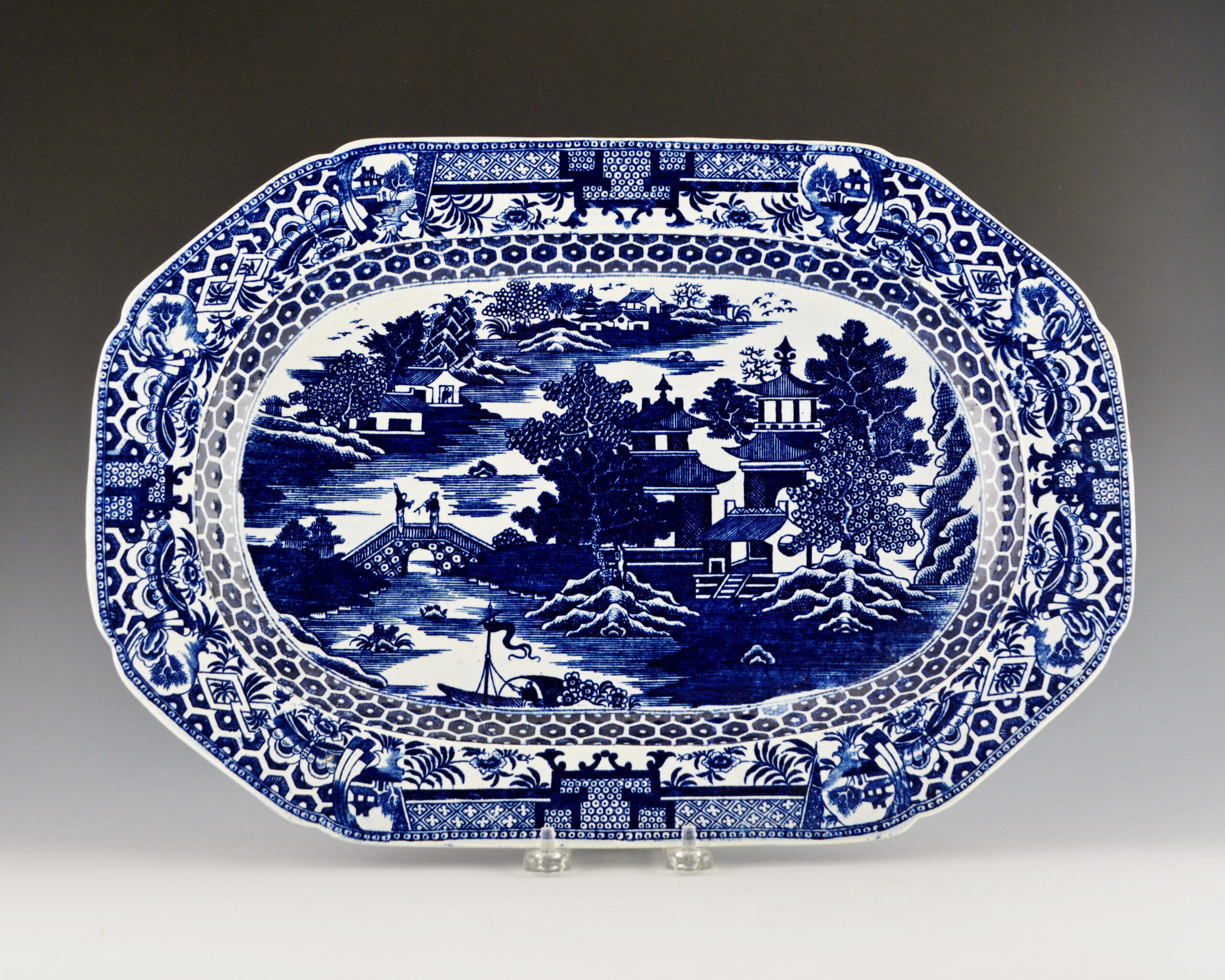 An exceptionally fine example of a late 18th century pearlware meat dish printed with a line-engraved Conversation pattern and border. This example is considered rare given it’s early date and fine condition. This version of the Conversation pattern is decorated with the border pattern commonly found on the Full Nankin pattern, examples of which are marked by Thomas Wolfe. The small impressed horn-like symbol on the back is likely a presser’s mark.