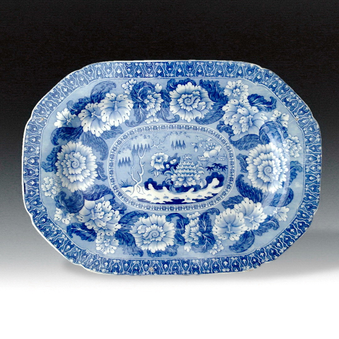 An earthenware platter. Marked examples by ADAMS exist while this example is unmarked. Known to have been printed in medium blue, green and in a clobbered version. The central pattern consists of a center medallion of peonies, rocks and willow-like shrubs. The medallion is surrounded by a wide floral border with peonies and an outer lappet border. the pattern was used for tableware.