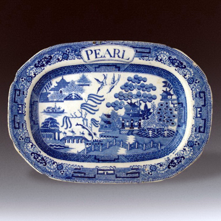 An indented earthenware platter printed with the Standard Willow pattern. Also printed in blue in a banner placed in the border is the word “PEARL”. I have not found any information about the name. It was probably a family name or possibly the name of a ship or a business. We will likely never know, but it can be fun just thinking about who it might have been.