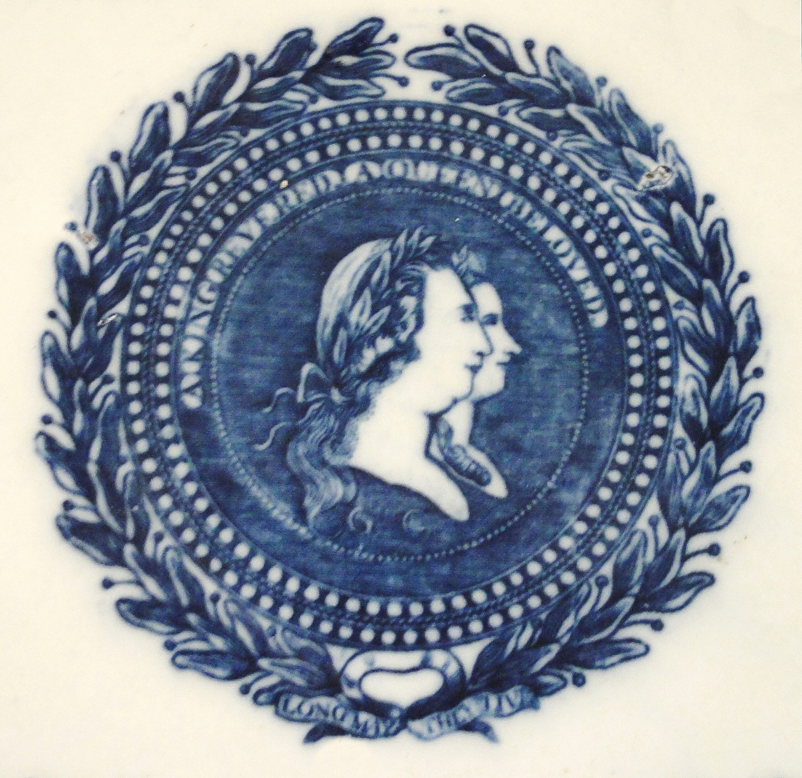 footed punch bowl printed on the interior with a commemorative pattern on the occasion of the golden jubilee of King George III. The center medallion features profiles of King George III and Queen Charlotte encircled by geometric bands within a garland. Added are the words. “A King Revered and a Queen Beloved” and “Long May They Live”. The medallion is surrounded by six floral groups. The inner border is made up of diamonds between scrolls with pendants. Although an earlier version was produced c. 1793 with reference to the war with France, the absence of an anti-Jacobean slogan on this pattern, according to Battie and Turner, p. 30, is an indication that this version was produced to commemorate King George’s golden jubilee and is considered to be c. late 1809 or c. 1810. Minnie Holdway attributed this example to Hollins. See Hollins Blue & White Printed Earthenware, Morely College Ceramic Circle, London Sealprint Ltd, Longon, 2001. It has also been attributed to the Swansea Pottery. This example is unmarked. On the exterior a Chinoiserie pattern, assigned the name Fisherman with Trap (see additional images), is repeated four times. This exterior pattern also appears on a named and dated jug that is recorded in the TCC database as pattern # 1498 and is in this collection.