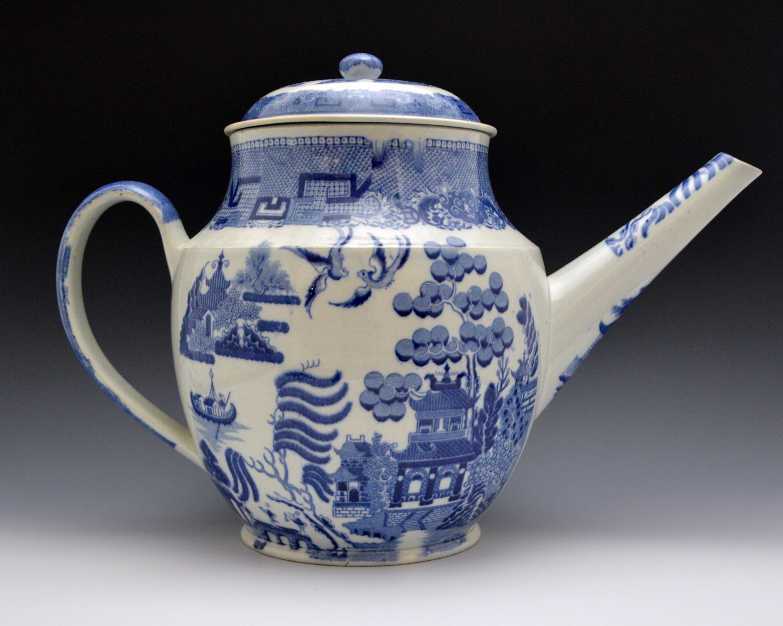 A large earthenware punch pot printed in blue underglaze with the Standard Willow pattern. Filled with liquid, it would have been quite heavy. Punch would have consisted of alcohol (often rum), fruit juices and spices.