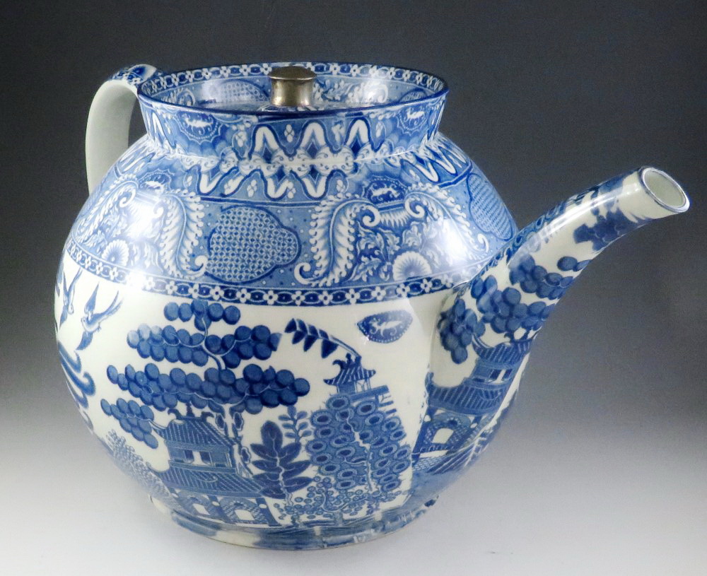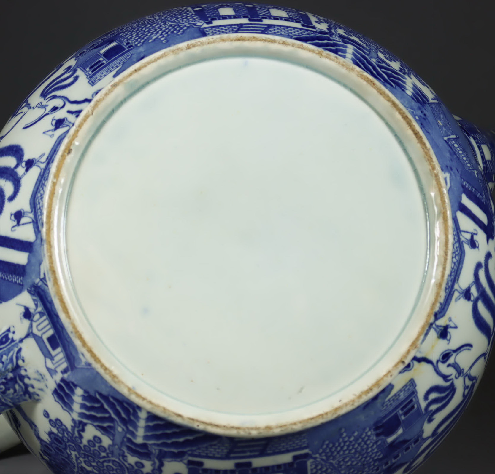 A large earthenware punch pot, printed in blue. In addition to its size, what makes this punch pot extraordinary is the bold border design consisting of scrolls, floral and geometric shapes combined with the Standard Willow pattern.