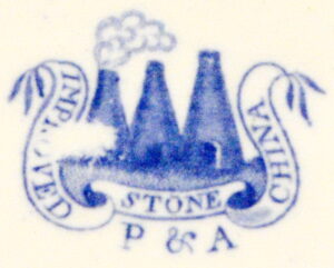 An earthenware sauce boat stand printed in blue in the Standard Willow pattern. What makes this example quite uncommon is its mark by Pountley & Allies which features three pottery ovens, one with smoke billowing from it.  The scene is wrapped with a ribbon containing the words”Improved Stone China”. Below it are the initials for the Pottery.