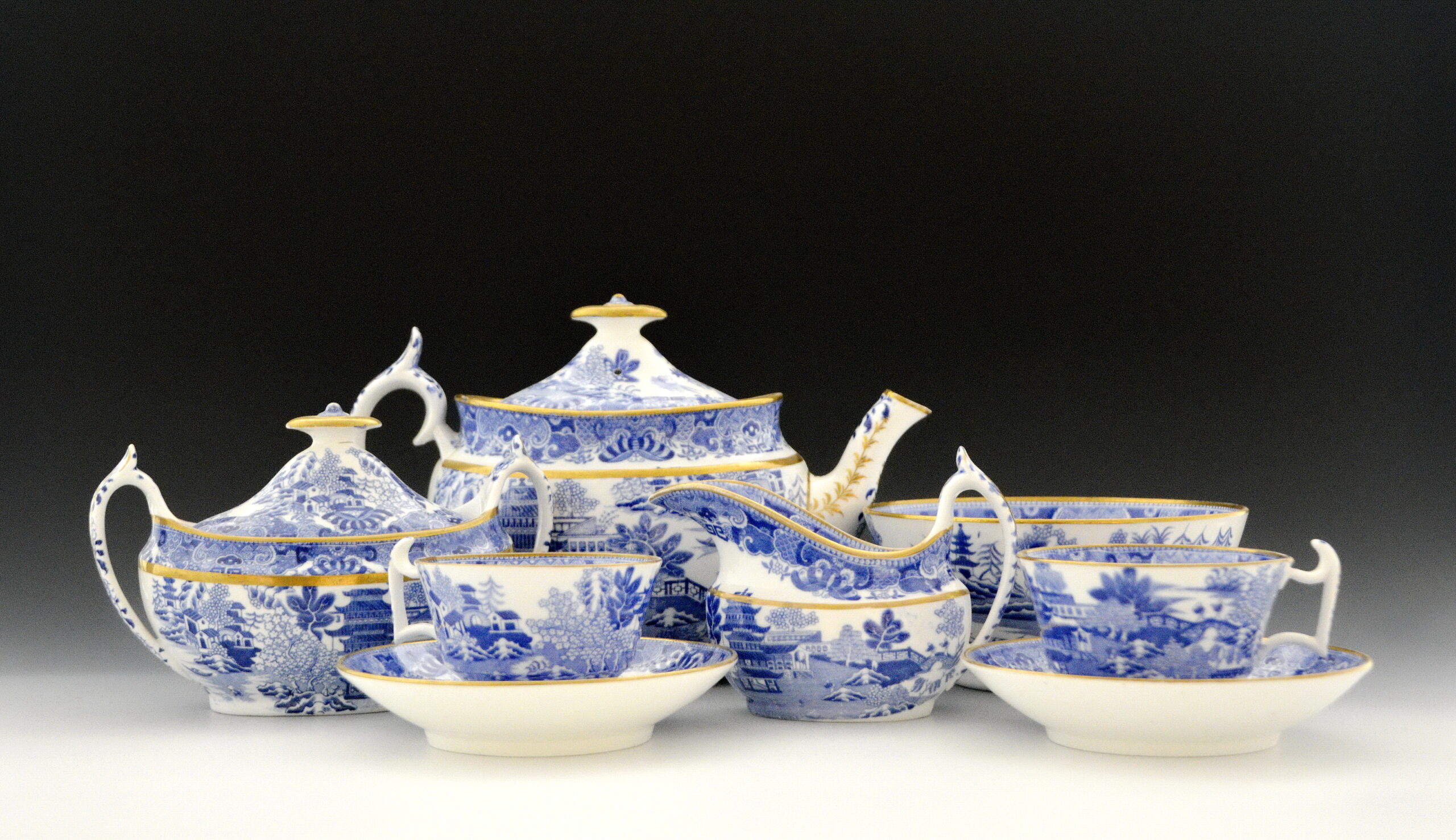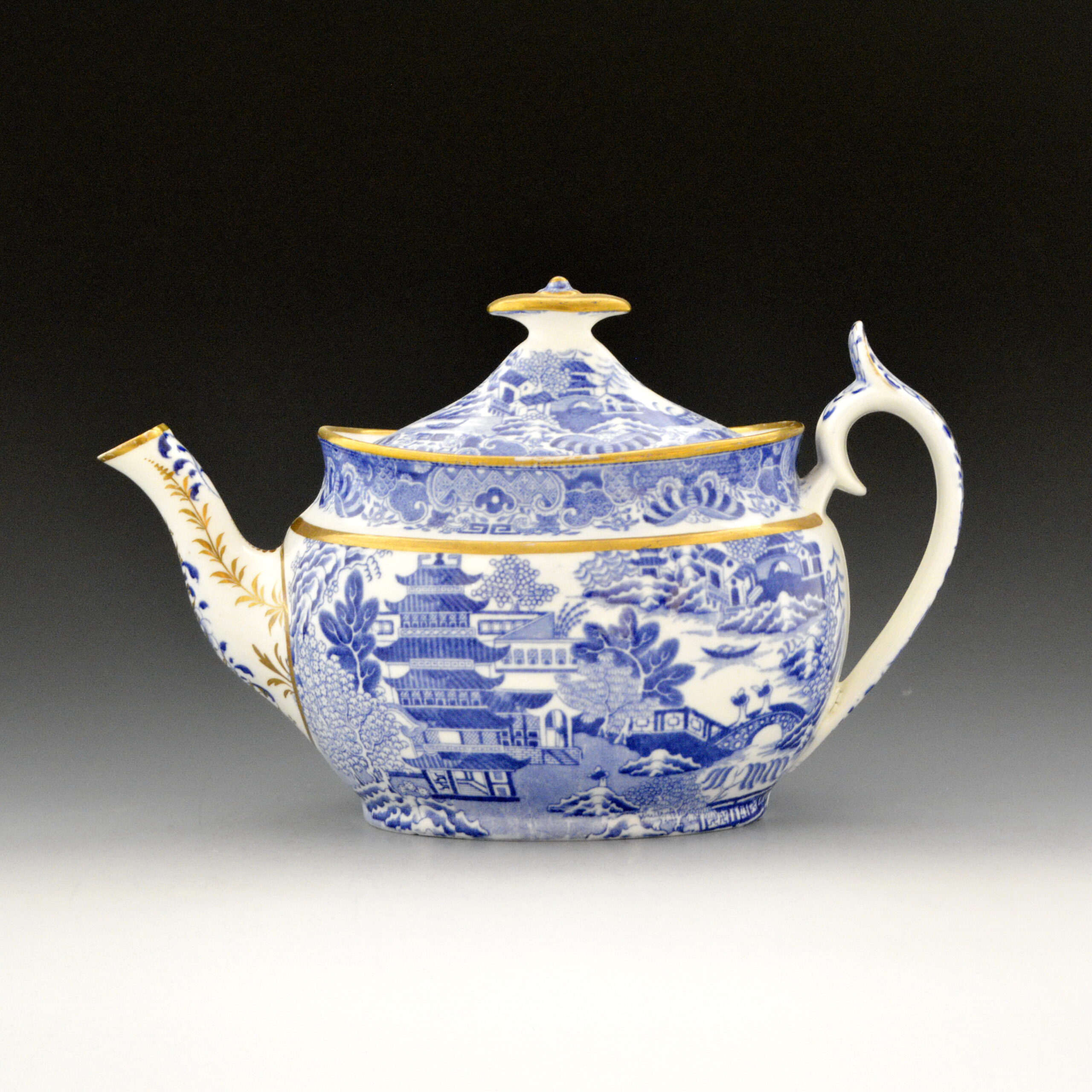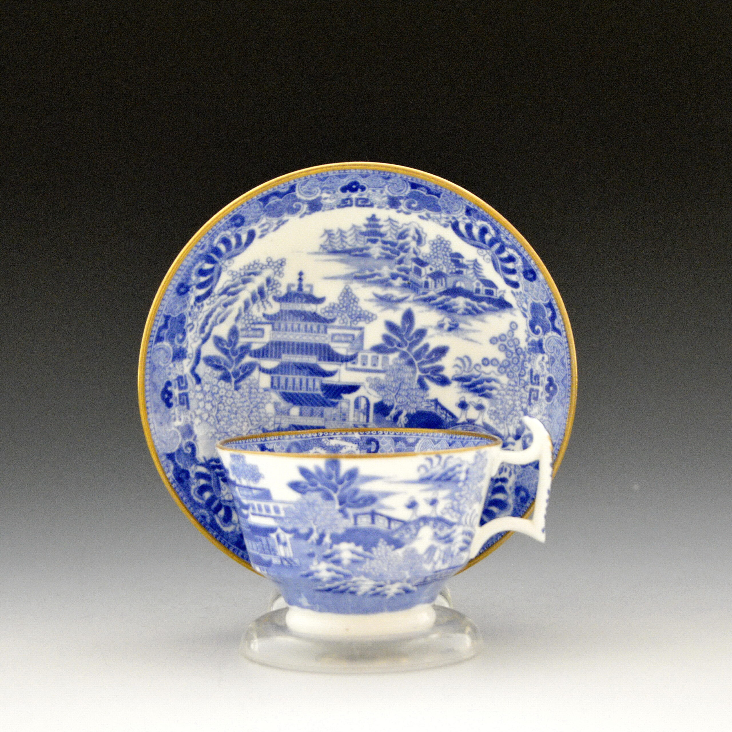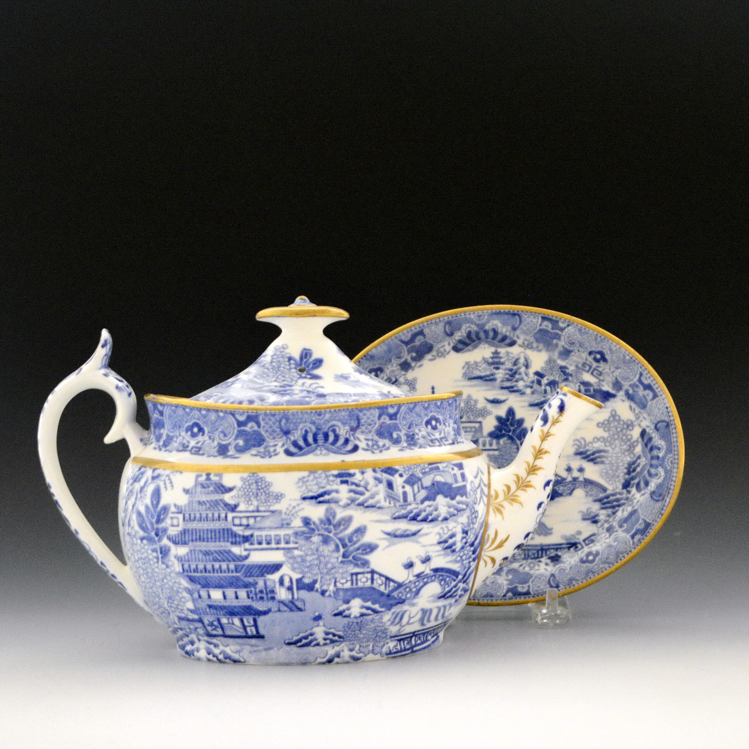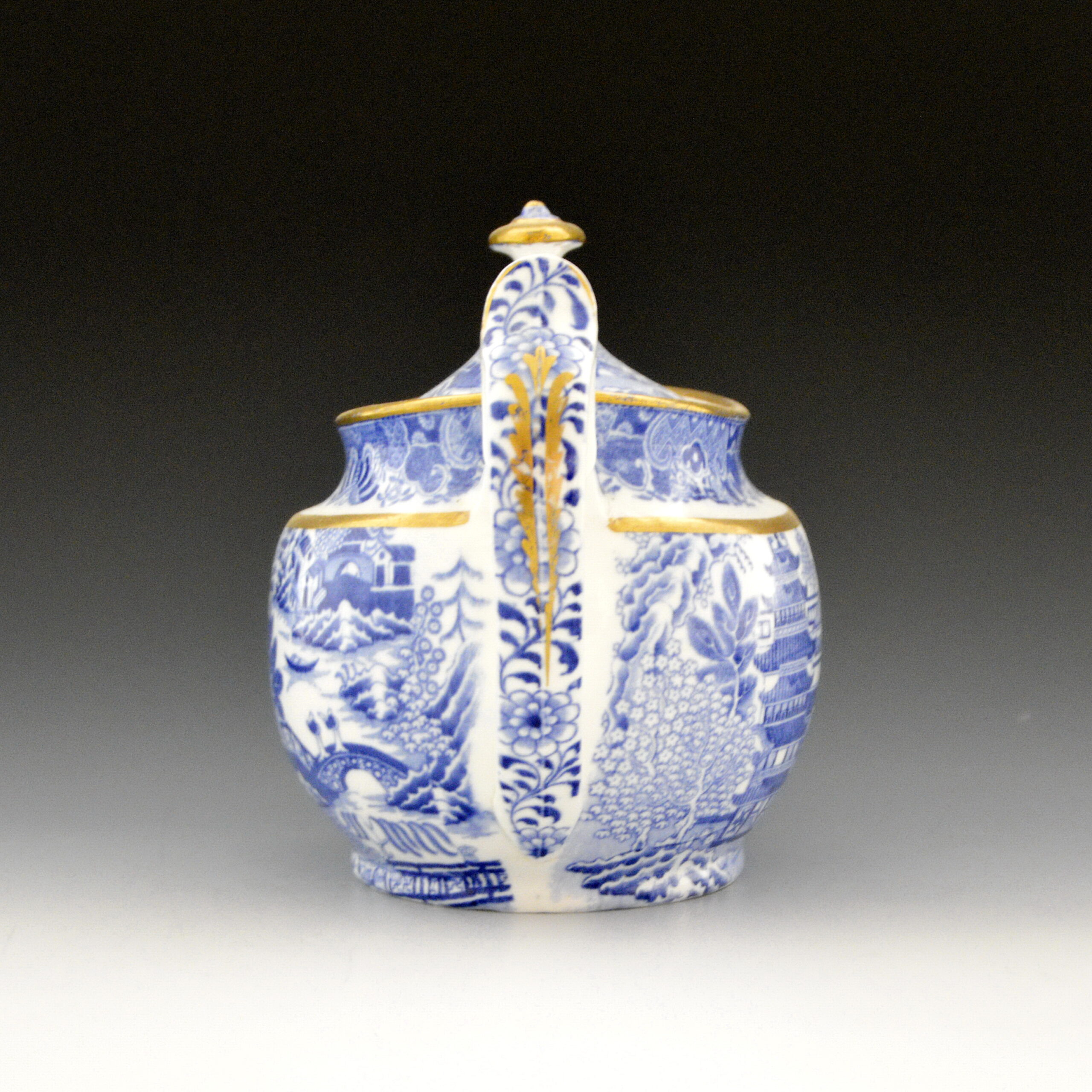 A very fine early Spode bone china tea set in the “new oval shape”. It was printed in Royal blue underglaze with the Two Temples I, Variation Temple pattern with gilt trim added. The set consists of teapot and stand (stand has a combed back), lidded sugar box, cream jug, waste bowl, and six cups and saucers. The cups and saucers are in the London shape. The teapot is 6.75″ high. An impressed “06” can be found on some saucers. Robert Copeland confirmed that the number was a maker’s mark identifying the individual who made the set. Also found is a printer’s mark, Copeland’s mark WMT11, on the same saucer.