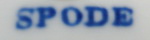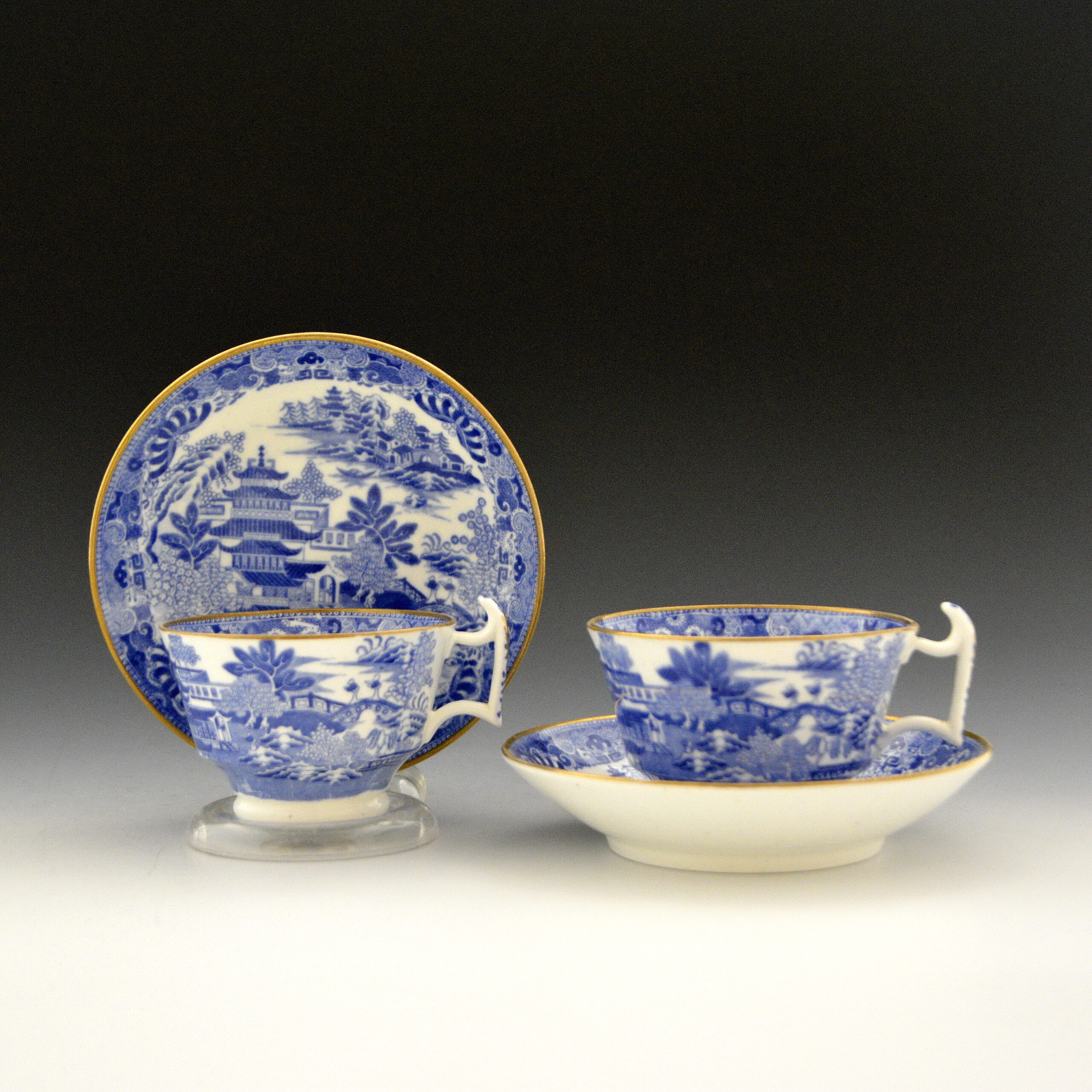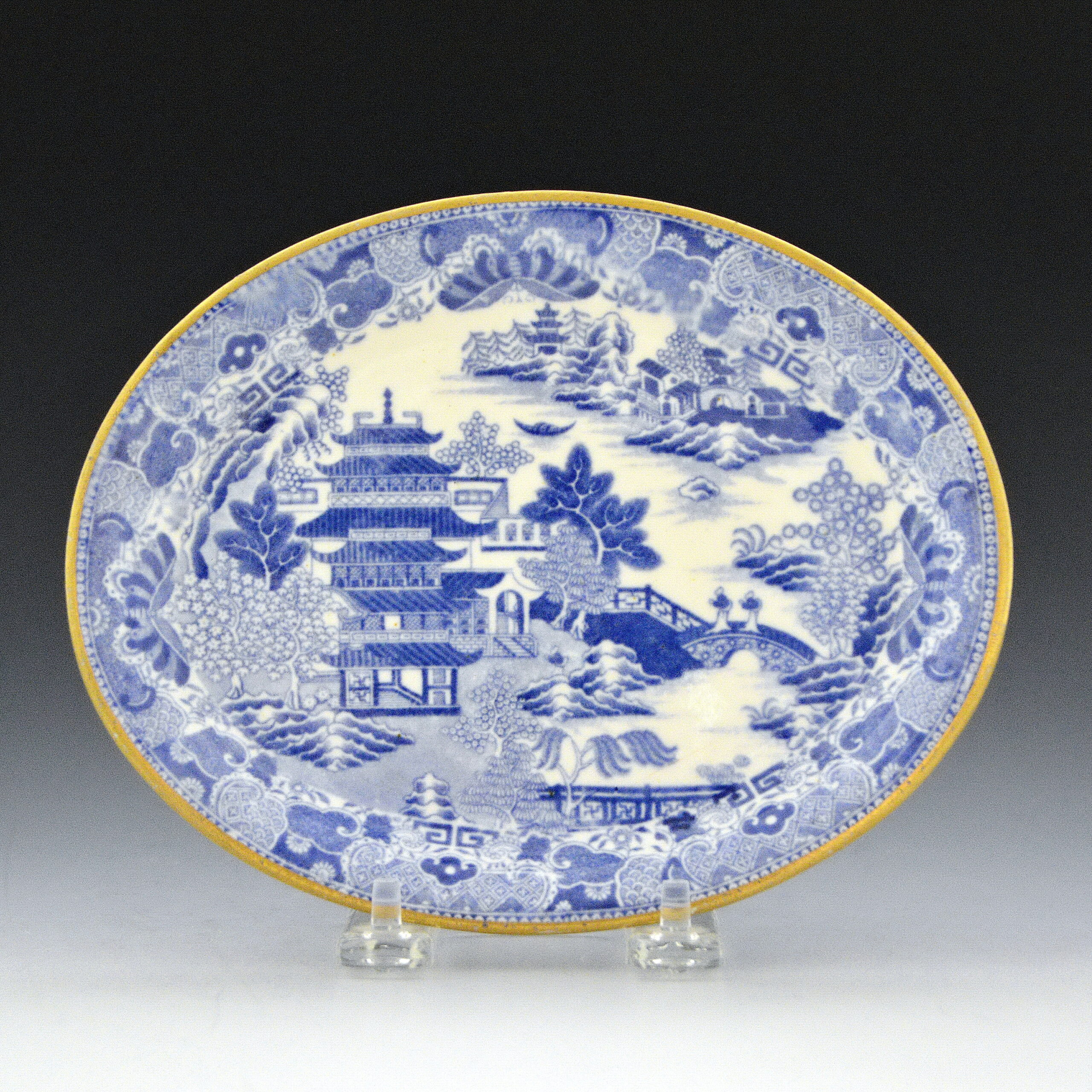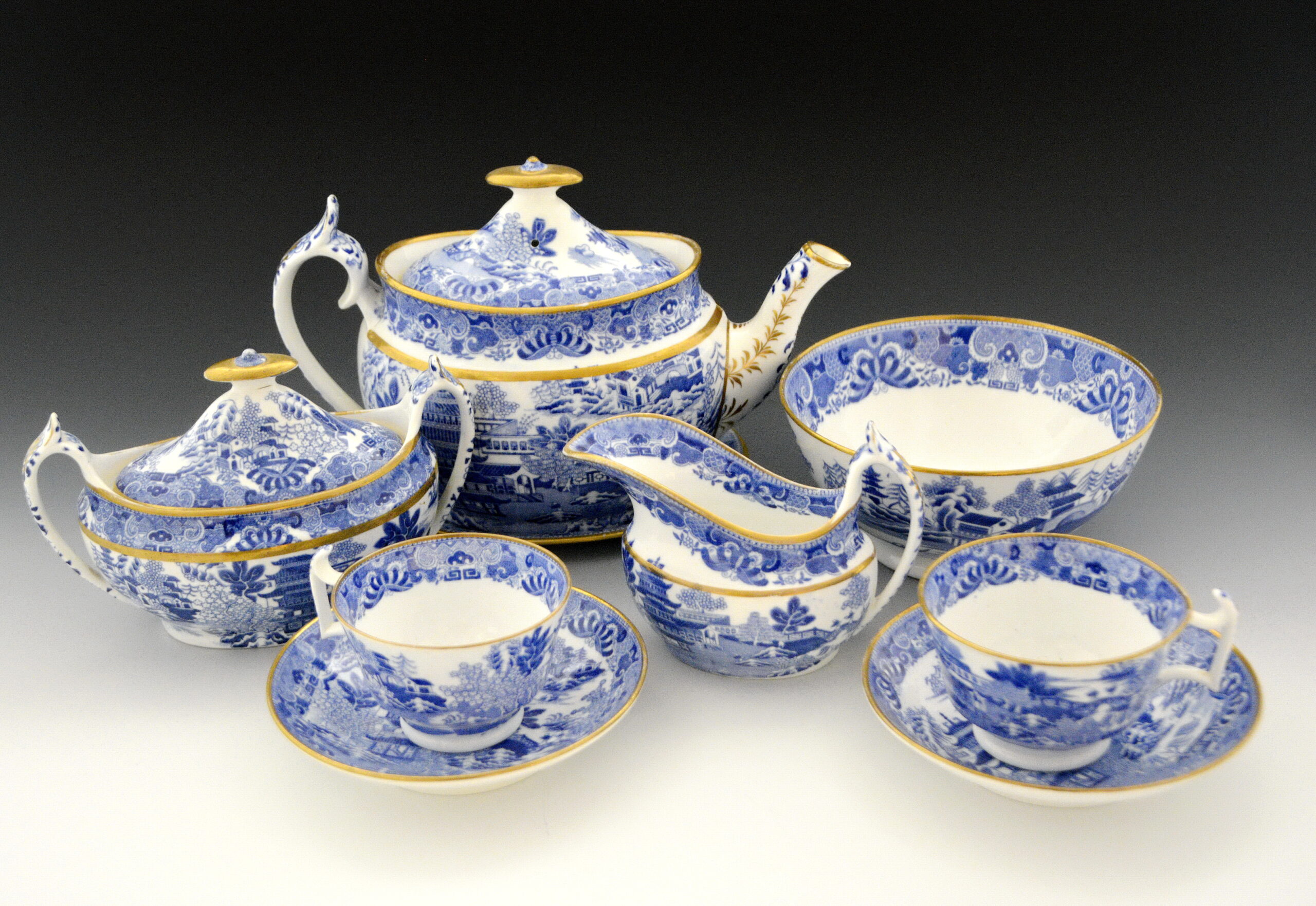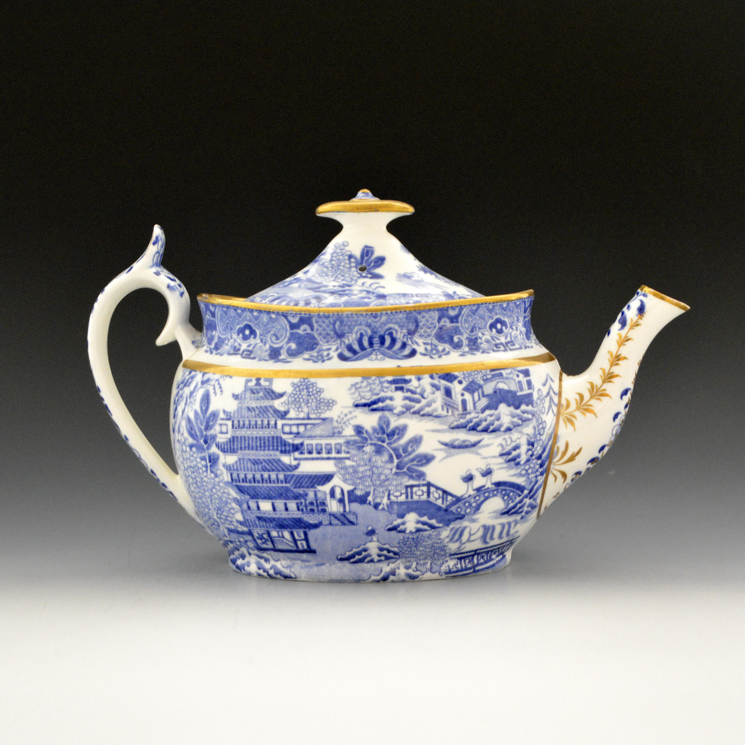 A very fine early Spode bone china tea set in the “new oval shape”. It was printed in Royal blue underglaze with the Two Temples I, Variation Temple pattern with gilt trim added. The set consists of teapot and stand (stand has a combed back), lidded sugar box, cream jug, waste bowl, and six cups and saucers. The cups and saucers are in the London shape. The teapot is 6.75″ high. An impressed “06” can be found on some saucers. Robert Copeland confirmed that the number was a maker’s mark identifying the individual who made the set. Also found is a printer’s mark, Copeland’s mark WMT11, on the same saucer.