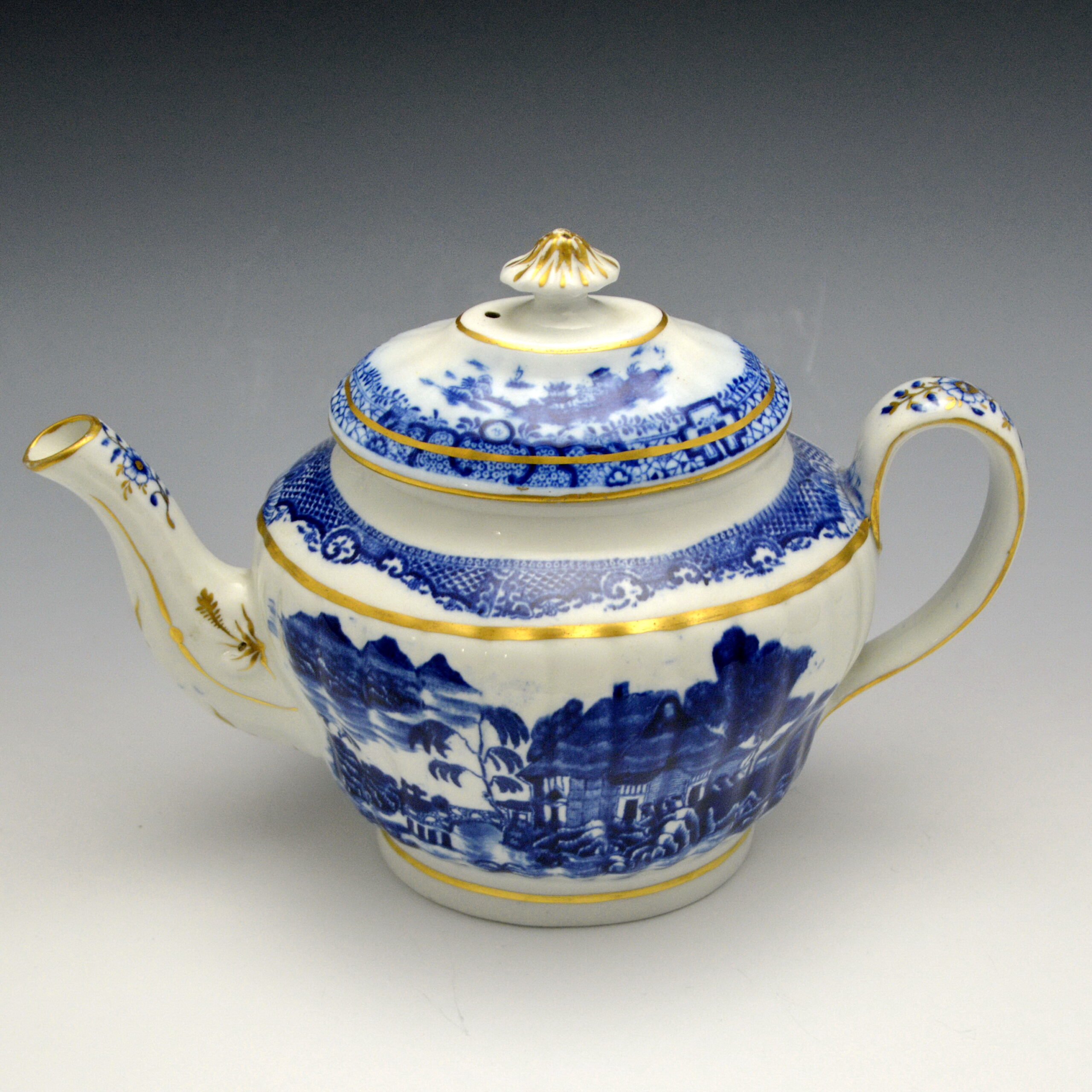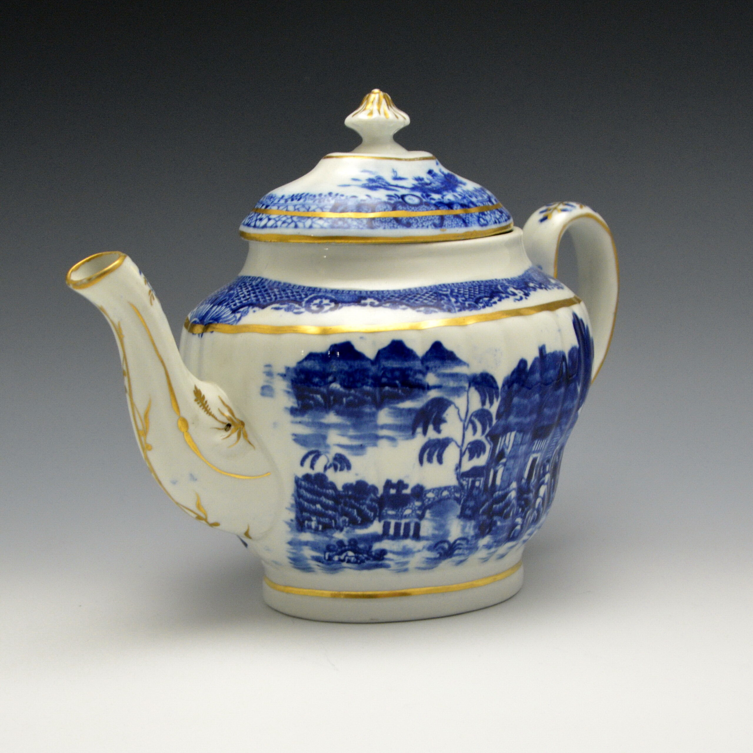 Excellent example of an early oval shaped teapot with fluted body and with the Trench Mortar pattern with gilt trim. This pattern was based on a Chinese original. There are quite a few different names used for this blue-printed pattern.